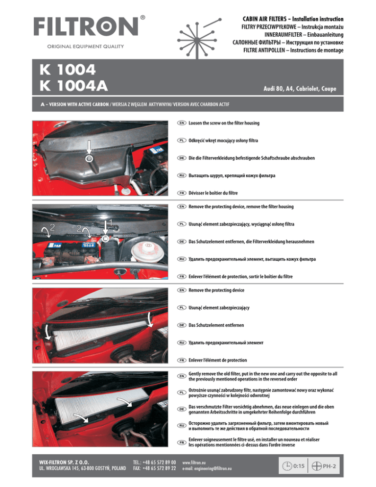 CABIN AIR FILTERS – Installation instruction FILTRY PRZECIWPYŁKOWE – Instrukcja montażu INNERAUMFILTER – Einbauanleitung САЛОННЫЕ ФИЛЬТРЫ – Инструкция по установке FILTRE ANTIPOLLEN – Instructions de montage K 1004 K 1004A Audi 80, A4, Cabriolet, Coupe A – VERSION WITH ACTIVE CARBON / WERSJA Z WĘGLEM AKTYWNYM/ VERSION AVEC CHARBON ACTIF Loosen the screw on the filter housing Odkręcić wkręt mocujący osłony filtra Die die Filterverkleidung befestigende Schaftschraube abschrauben Вытащить шуруп, крепящий кожух фильтра Dévisser le boîtier du filtre Remove the protecting device, remove the filter housing 2 2 1 Usunąć element zabezpieczający, wyciągnąć osłonę filtra Das Schutzelement entfernen, die Filterverkleidung herausnehmen Удалить предохранительный элемент, вытащить кожух фильтра Enlever l’élément de protection, sortir le boîtier du filtre Remove the protecting device Usunąć element zabezpieczający Das Schutzelement entfernen Удалить предохранительный элемент Enlever l’élément de protection Gently remove the old filter, put in the new one and carry out the opposite to all the previously mentioned operations in the reversed order Ostrożnie usunąć zabrudzony filtr, następnie zamontować nowy oraz wykonać powyższe czynności w kolejności odwrotnej Das verschmutzte Filter vorsichtig abnehmen, das neue einlegen und die oben genannten Arbeitsschritte in umgekehrter Reihenfolge durchführen Осторожно удалить загрязненный фильтр, затем вмонтировать новый и выполнить те же действия в обратной последовательности Enlever soigneusement le filtre usé, en installer un nouveau et réaliser les opérations mentionnées ci-dessus dans l’ordre inverse WIX-FILTRON SP. Z O.O. TEL.:+48 65 572 89 00 www.filtron.eu UL. WROCŁAWSKA 145, 63-800 GOSTYŃ, POLAND FAX: +48 65 572 89 22 e-mail: [email protected] 0:15 PH-2 CABIN AIR FILTERS – Installation instruction FILTRY PRZECIWPYŁKOWE – Instrukcja montażu INNERAUMFILTER – Einbauanleitung САЛОННЫЕ ФИЛЬТРЫ – Инструкция по установке FILTRE ANTIPOLLEN – Instructions de montage K 1004 K 1004A Volkswagen Passat A – VERSION WITH ACTIVE CARBON / WERSJA Z WĘGLEM AKTYWNYM/ VERSION AVEC CHARBON ACTIF Loosen the screw on the filter housing Odkręcić wkręt mocujący osłony filtra Die die Filterverkleidung befestigende Schaftschraube abschrauben Вытащить шуруп, крепящий кожух фильтра Dévisser le boîtier du filtre Remove the filter housing Wyciągnąć osłonę filtra Filterverkleidung herausnehmen Вытащить кожух фильтра Sortir le boîtier du filtre Gently remove the old filter, put in the new one and carry out the opposite to all the previously mentioned operations in the reversed order Ostrożnie usunąć zabrudzony filtr, następnie zamontować nowy oraz wykonać powyższe czynności w kolejności odwrotnej Das verschmutzte Filter vorsichtig abnehmen, das neue einlegen und die oben genannten Arbeitsschritte in umgekehrter Reihenfolge durchführen Осторожно удалить загрязненный фильтр, затем вмонтировать новый и выполнить те же действия в обратной последовательности Enlever soigneusement le filtre usé, en installer un nouveau et réaliser les opérations mentionnées ci-dessus dans l’ordre inverse 0:10 WIX-FILTRON SP. Z O.O. TEL.:+48 65 572 89 00 www.filtron.eu UL. WROCŁAWSKA 145, 63-800 GOSTYŃ, POLAND FAX: +48 65 572 89 22 e-mail: [email protected] PH-2
