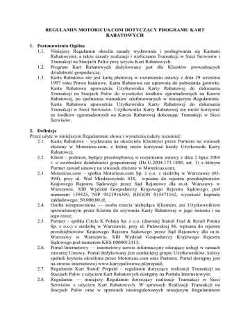 REGULAMIN MOTORICUS.COM DOTYCZĄCY PROGRAMU KART RABATOWYCH 1. Postanowienia Ogólne 1.1. Niniejszy Regulamin określa zasady wydawania i posługiwania się Kartami Rabatowymi, a także zasady realizacji i rozliczania Transakcji w Sieci Serwisów i Transakcji na Stacjach Paliw przy użyciu Kart Rabatowych. 1.2. Program Kart Rabatowych dedykowany jest dla Klientów prowadzących działalność gospodarczą. 1.3. Karta Rabatowa nie jest kartą płatniczą w rozumieniu ustawy z dnia 29 września 1997 roku Prawo bankowe. Karta Rabatowa nie uprawnia do pobierania gotówki. Karta Rabatowa upoważnia Użytkownika Karty Rabatowej do dokonania Transakcji na Stacjach Paliw do wysokości środków zgromadzonych na Karcie Rabatowej, po spełnieniu warunków zdefiniowanych w niniejszym Regulaminie. Karta Rabatowa upoważnia Użytkownika Karty Rabatowej do dokonania Transakcji w Sieci Serwisów. Użytkownika Karty Rabatowej nie może korzystać ze środków zgromadzonych na Karcie Rabatowej dokonując Transakcji w Sieci Serwisów. 2. Definicje Przez użyte w niniejszym Regulaminie słowa i wyrażenia należy rozumieć: 2.1. Karta Rabatowa – wydawana na okaziciela Klientowi przez Partnera na wniosek złożony w Motoricus.com, z której może korzystać każdy Użytkownik Karty Rabatowej; 2.2. Klient – podmiot, będący przedsiębiorcą w rozumieniu ustawy z dnia 2 lipca 2004 r. o swobodzie działalności gospodarczej (Dz.U.2004.173.1808; art. 1) z którym Partner zawarł umowę na wniosek złożony w Motoricus.com; 2.3. Motoricus.com – spółka Motoricus.com Sp. z o.o. z siedzibą w Warszawie (03994), przy ul. Wał Miedzeszyński 438, wpisana do rejestru przedsiębiorców Krajowego Rejestru Sądowego przez Sąd Rejonowy dla m.st. Warszawy w Warszawie, XIII Wydział Gospodarczy Krajowego Rejestru Sądowego, pod numerem 159525, NIP 9521916309, REGON 015471162, wysokość kapitału zakładowego: 50.000,00 zł; 2.4. Osoba nieuprawniona — osoba trzecia niebędąca Klientem, ani Użytkownikiem upoważnionym przez Klienta do używania Karty Rabatowej w jego imieniu i na jego rzecz; 2.5. Partner – spółka Circle K Polska Sp. z o.o. (dawniej Statoil Fuel & Retail Polska Sp. z o.o.) z siedzibą w Warszawie, przy ul. Puławskiej 86, wpisana do rejestru przedsiębiorców Krajowego Rejestru Sądowego przez Sąd Rejonowy dla m.st. Warszawy w Warszawie, XIII Wydział Gospodarczy Krajowego Rejestru Sądowego pod numerem KRS 0000012413; 2.6. Portal Internetowy — internetowy serwis informacyjny oferujący usługi w ramach zawartej Umowy. Portal dedykowany jest zamkniętej grupie Użytkowników, którzy spełnili kryteria określone przez Motoricus.com oraz Partnera. Portal dostępny jest na stronie internetowej www.kartypaliwowe.pl/prepaid; 2.7. Regulamin Kart Statoil Prepaid – regulamin dotyczący realizacji Transakcji na Stacjach Paliw z użyciem Kart Rabatowych dostępny na Portalu Internetowym; 2.8. Regulamin — niniejszy Regulamin dotyczący realizacji Transakcji w Sieci Serwisów z użyciem Kart Rabatowych. W sprawach Realizacji Transakcji na Stacjach Paliw oraz w sprawach nieuregulowanych niniejszym Regulaminem 2.9. 2.10. 2.11. 2.12. 2.13. 2.14. 2.15. 2.16. znajduje zastosowanie Regulamin Kart Statoil Prepaid dostępny na Portalu Internetowym; Sieć Serwisów / Serwis – zlokalizowane na terytorium Polski serwisy samochodowe działające pod marką Motoricus.com, których właścicielem jest Motoricus Service Sp. z o. o. z siedzibą w Warszawie (KRS: 0000378797) oraz serwisy samochodowe prowadzone pod marką Motoricus.com na podstawie umów franczyzowych z podmiotami trzecimi, w ramach działalności których, możliwe jest realizowanie Transakcji w Sieci Serwisów z użyciem Kart Rabatowych; szczegółowa aktualna lista Sieci Serwisów objętych niniejszym Regulaminem udostępniana jest na stronie www.motoricus.com; Stacje Paliw - zlokalizowane na terytorium Polski stacje paliw działające pod marką STATOIL / CIRCLE K, której właścicielem jest Partner oraz stacje paliw prowadzone pod marką STATOIL / CIRCLE K na podstawie umów franczyzowych z podmiotami trzecimi, w ramach działalności których, możliwe jest realizowanie Transakcji z użyciem Kart Rabatowych; szczegółowa aktualna lista Stacji Paliw objętych niniejszym Regulaminem udostępniana jest na Portalu Internetowym; Towary i Usługi w Sieci Serwisów – towary i usługi dostępne w Sieci Serwisów objęte programem Kart Rabatowych; Towary i Usługi na Stacjach Paliw – towary i usługi dostępne na Stacjach Paliw określone przez Regulamin Kart Statoil Prepaid; Transakcje w Sieci Serwisów – sprzedaż Towarów i Usług dokonywanych na rzecz Klienta, rejestrowana w systemie operacyjnym danego Serwisu. Historia Transakcji w Sieci Serwisów nie jest prowadzona na koncie w Portalu Internetowym; Transakcje na Stacjach Paliw – sprzedaż Towarów i Usług dokonywanych na rzecz Klienta, przy użyciu Karty Rabatowej na Stacjach Paliw, rejestrowana w systemie operacyjnym danej Stacji Paliw. Historia Transakcji na Stacjach Paliw jest prowadzona na koncie w Portalu Internetowym; Umowa – porozumienie o wydanie i używanie Kart Rabatowych zawarte przez Klienta z Partnerem na wniosek złożony w Motoricus.com. Umowa określa warunki dokonywania przez Klienta zakupu paliw oraz pozostałych Towarów i Usług dostępnych na Stacjach Paliw. Warunki dokonywania zakupu Towarów i Usługi w Sieci Serwisów przy użyciu Kart Rabatowych określa niniejszy Regulamin; Użytkownik – osoba, którą Klient upoważniona do korzystania z Kart Rabatowych w imieniu i na rzecz Klienta. Klient upoważnia Motoricus.com do reprezentowania go przed Partnerem jako administrator Grupy Zakupowej Motoricus. 3. Zasady wydawania Kart Rabatowych 3.1. Karta Rabatowa stanowi własność Partnera. 3.2. Karta Rabatowa wydana zostanie Klientowi przez Partnera na wniosek złożony w Motoricus.com, przy czym Klient może nią dysponować według wyłącznego własnego 