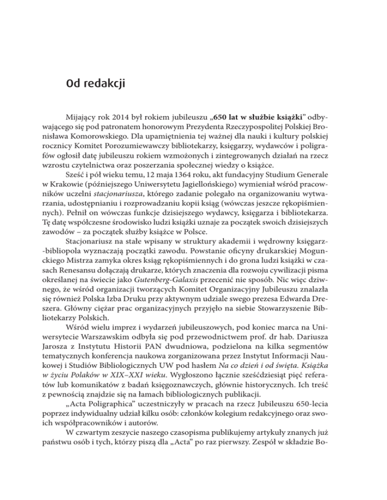 Od redakcji Mijający rok 2014 był rokiem jubileuszu „650 lat w służbie książki” odbywającego się pod patronatem honorowym Prezydenta Rzeczypospolitej Polskiej Bronisława Komorowskiego. Dla upamiętnienia tej ważnej dla nauki i kultury polskiej rocznicy Komitet Porozumiewawczy bibliotekarzy, księgarzy, wydawców i poligrafów ogłosił datę jubileuszu rokiem wzmożonych i zintegrowanych działań na rzecz wzrostu czytelnictwa oraz poszerzania społecznej wiedzy o książce. Sześć i pół wieku temu, 12 maja 1364 roku, akt fundacyjny Studium Generale w Krakowie (późniejszego Uniwersytetu Jagiellońskiego) wymieniał wśród pracowników uczelni stacjonariusza, którego zadanie polegało na organizowaniu wytwarzania, udostępnianiu i rozprowadzaniu kopii ksiąg (wówczas jeszcze rękopiśmiennych). Pełnił on wówczas funkcje dzisiejszego wydawcy, księgarza i bibliotekarza. Tę datę współczesne środowisko ludzi książki uznaje za początek swoich dzisiejszych zawodów – za początek służby książce w Polsce. Stacjonariusz na stałe wpisany w struktury akademii i wędrowny księgarz-bibliopola wyznaczają początki zawodu. Powstanie oficyny drukarskiej Mogunckiego Mistrza zamyka okres ksiąg rękopiśmiennych i do grona ludzi książki w czasach Renesansu dołączają drukarze, których znaczenia dla rozwoju cywilizacji pisma określanej na świecie jako Gutenberg-Galaxis przecenić nie sposób. Nic więc dziwnego, że wśród organizacji tworzących Komitet Organizacyjny Jubileuszu znalazła się również Polska Izba Druku przy aktywnym udziale swego prezesa Edwarda Dreszera. Główny ciężar prac organizacyjnych przyjęło na siebie Stowarzyszenie Bibliotekarzy Polskich. Wśród wielu imprez i wydarzeń jubileuszowych, pod koniec marca na Uniwersytecie Warszawskim odbyła się pod przewodnictwem prof. dr hab. Dariusza Jarosza z Instytutu Historii PAN dwudniowa, podzielona na kilka segmentów tematycznych konferencja naukowa zorganizowana przez Instytut Informacji Naukowej i Studiów Bibliologicznych UW pod hasłem Na co dzień i od święta. Książka w życiu Polaków w XIX–XXI wieku. Wygłoszono łącznie sześćdziesiąt pięć referatów lub komunikatów z badań księgoznawczych, głównie historycznych. Ich treść z pewnością znajdzie się na łamach bibliologicznych publikacji. „Acta Poligraphica” uczestniczyły w pracach na rzecz Jubileuszu 650-lecia poprzez indywidualny udział kilku osób: członków kolegium redakcyjnego oraz swoich współpracowników i autorów. W czwartym zeszycie naszego czasopisma publikujemy artykuły znanych już państwu osób i tych, którzy piszą dla „Acta” po raz pierwszy. Zespół w składzie Bo- 8 OD REDAKCJI gusław Jackowski, Marek Ryćko, Piotr Strzelczyk i Łukasz Dziedzic zajął się teoretycznym problemem gładkiego łączenia krzywych matematycznych trzeciego stopnia. Rozwiązywanie tego rodzaju zadań ma istotne znaczenie dla działania programów graficznych, m.in. służących do edytowania fontów komputerowych. Algorytmy sformułowane przez autorów implementowane są już w działającym profesjonalnym edytorze fontów. Jacek Hamerliński prezentuje praktyczny sposób wykorzystania metody prognozowania naddatków w arkuszowym drukowaniu offsetowym. Demonstrowana metoda jest wynikiem pracy badawczej autora przedstawionej w tegorocznej rozprawie doktorskiej. Paulina Urbańska i Jan Piechota związani z katowicką Akademią Sztuk Pięknych publikują artykuł dotyczący znaczenia prac badawczych w projektowaniu graficznym. Natomiast sama Paulina Urbańska pisze o ciekawym projekcie podręcznika edukującego w problematyce związanej z grafiką użytkową. Monika Marek-Łucka recenzuje najnowsze polskie wydanie książki znanego holenderskiego typografa i teoretyka liternictwa Gerrita Noordzija, profesora Royal Academy of Art w Hadze. Na koniec Arkadiusz Wagner zamieszcza na naszą prośbę sprawozdanie z ciekawej ogólnopolskiej konferencji oprawoznawców, która odbyła się w tym roku na Uniwersytecie Mikołaja Kopernika w Toruniu. Zapraszamy do lektury.