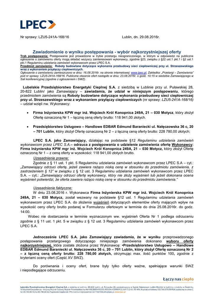 Nr sprawy: LZU5-241A-168/16 Lublin, dn. 29.08.2016r. Zawiadomienie o wyniku postępowania - wybór najkorzystniejszej oferty Tryb postępowania: Postępowanie jest prowadzone w trybie przetargu nieograniczonego, w którym w odpowiedzi na publiczne ogłoszenie o zamówieniu oferty mogą składać wszyscy zainteresowani wykonawcy, zgodnie §23, związku z §22 ust.1 pkt.1 i §2 ust.1 pkt.1 Regulaminu udzielania zamówień wykonawcom przez LPEC S.A. Przedmiot zamówienia: Roboty budowlane dotyczące wykonania przebudowy sieci ciepłowniczej przy ul. Strzeszewskiego wraz z wykonaniem przyłączy ciepłowniczych. Ogłoszenie o zamówieniu zamieszczono w dniu: 16.08.2016r. na stronie internetowej: www.lpec.pl, Zakładka: „Przetargi – Zamówienia” pod nr sprawy: LZU5-241A-168/16. Publiczne otwarcie ofert nastąpiło w dniu: 23.08.2016r. o godz. 10:15 w siedzibie Zamawiającego w Sali konferencyjnej (zgodnie z ogłoszeniem i SWZ). Lubelskie Przedsiębiorstwo Energetyki Cieplnej S.A. z siedzibą w Lublinie przy ul. Puławskiej 28, 20-822 Lublin/ jako Zamawiający – zawiadamia, że udział w niniejszym postępowaniu, którego przedmiotem zamówienia są Roboty budowlane dotyczące wykonania przebudowy sieci ciepłowniczej przy ul. Strzeszewskiego wraz z wykonaniem przyłączy ciepłowniczych (nr sprawy: LZU5-241A-168/16) – udział wzięli nw. Wykonawcy: Firma Inżynierska KPW mgr inż. Wojciech Król Konopnica 249A, 21 – 030 Motycz, który złożył Ofertę oznaczoną Nr 1 – łączną ceną oferty brutto: 118 941,00 złotych. Przedsiębiorstwo Usługowo – Handlowe EDBAR Edmund Baraniecki ul. Nałęczowska 36 c, 20 – 701 Lublin, który złożył Ofertę oznaczoną Nr 2 – z łączną ceną oferty brutto: 228 780,00 złotych; LPEC S.A. jako Zamawiający, działając na podstawie §12 Regulaminu udzielania zamówień wykonawcom przez LPEC S.A.– odrzuca z postępowania o udzielenie zamówienia ofertę Wykonawcy: Firma Inżynierska KPW mgr inż. Wojciech Król Konopnica 249A, 21 – 030 Motycz, który złożył Ofertę oznaczoną Nr 1 – z ceną oferty w wysokości: 118 941,00 złotych brutto. Uzasadnienie prawne: Zgodnie z § 11 ust. 1 pkt. 5 Regulaminu udzielania zamówień wykonawcom przez LPEC S.A – cyt.: „Zamawiający odrzuci ofertę, jeżeli zawiera rażąco niską cenę w stosunku do przedmiotu zamówienia, z zastrzeżeniem § 12” w związku z § 12 ust. 3 Regulaminu udzielania zamówień wykonawcom przez LPEC S.A. – cyt.: „Zamawiający odrzuci ofertę wykonawcy, który nie złoży wyjaśnień lub jeżeli dokonana ocena wyjaśnień potwierdzi, że oferta zawiera rażąco niską cenę w stosunku do przedmiotu zamówienia.” Uzasadnienie faktyczne: W dniu 23.08.2016 r. Wykonawca Firma Inżynierska KPW mgr inż. Wojciech Król Konopnica 249A, 21 – 030 Motycz, został wezwany na podstawie §12 ust. 1 Regulaminu udzielania zamówień wykonawcom przez LPEC S.A. do złożenia wyjaśnień dotyczących elementów oferty mających wpływ na wysokość ceny oferty brutto podanej w Formularzu ofertowym w terminie do dnia 25.08.2016r. do godz. 14:00. Wobec nie dostarczenia w terminie wyznaczonym ww. wyjaśnień Oferta Nr 1 podlega odrzuceniu zgodnie z § 11 ust. 1 pkt. 5 w związku z § 12 ust. 3 Regulaminu udzielania zamówień wykonawcom przez LPEC S.A. Jednocześnie LPEC S.A. jako Zamawiający zawiadamia, że w wyniku przeprowadzonego postępowania przetargowego dotyczącego niniejszego zamówienia dokonano wyboru oferty najkorzystniejszej, która została złożona przez Wykonawcę: •Przedsiębiorstwo Usługowo – Handlowe EDBAR Edmund Baraniecki ul. Nałęczowska 36 c, 20 – 701 Lublin, który złożył Ofertę oznaczoną Nr 2 – z łączną ceną oferty brutto: 228 780,00 złotych, otrzymując max. ilość punktów 100, zgodnie z kryteriami oceny ofert (Część XV SWZ). Do porównania i oceny ofert, brane były tylko oferty ważne, spełniające warunki SWZ i niepodlegające odrzuceniu. Uzasadnienie wyboru oferty najkorzystniejszej: Wybór oferty najkorzystniejszej został dokonany przy zastosowaniu jedynego kryterium oceny ofert, jakim jest – cena ofertowa brutto – 100%, zgodnie z zapisem z części XV SWZ. Streszczenie oceny i porównanie ofert spełniających warunki SWZ: Łączna Numer Nazwa (firma) i adres wykonawcy cena oferty brutto oferty w PLN 1 Firma Inżynierska KPW mgr inż. Wojciech Król,: Konopnica 249A, 21-030 Motycz 2 Przedsiębiorstwo UsługowoHandlowe EDBAR Edmund Baraniecki Ul. Nałęczowska 36c, 20-701 Lublin Łączna liczba uzyskanych punktów Oferta Wykonawcy odrzucona zgodnie z §11 ust. 1 pkt. 5 w związku z §12 ust. 3 Regulaminu udzielania zamówień wykonawcom przez LPEC S.A. Oferta Wykonawcy odrzucona zgodnie z §11 ust. 1 pkt. 5 w związku z §12 ust. 3 Regulaminu udzielania zamówień wykonawcom przez LPEC S.A. 228 780,00 100 Ponadto LPEC S.A. jako Zamawiający informuje - zgodnie z Częścią XVI SWZ, że umowa w sprawie niniejszego zamówienia będzie zawarta z Wykonawcą, którego oferta została złożona jako najkorzystniejsza, po przekazaniu do publicznej wiadomości zawiadomienia o wyborze oferty najkorzystniejszej. O terminie i miejscu podpisania umowy Wykonawca, którego oferta została wybrana jako najkorzystniejsza, zostanie poinformowany zgodnie z warunkami SWZ. Zawiadomienie o wynikach postępowania i wyborze oferty najkorzystniejszej, jest przekazane w formie elektronicznej (za pośrednictwem poczty elektronicznej) oraz w formie faksu do wiadomości Wykonawcom biorącym udział w niniejszym postępowaniu.