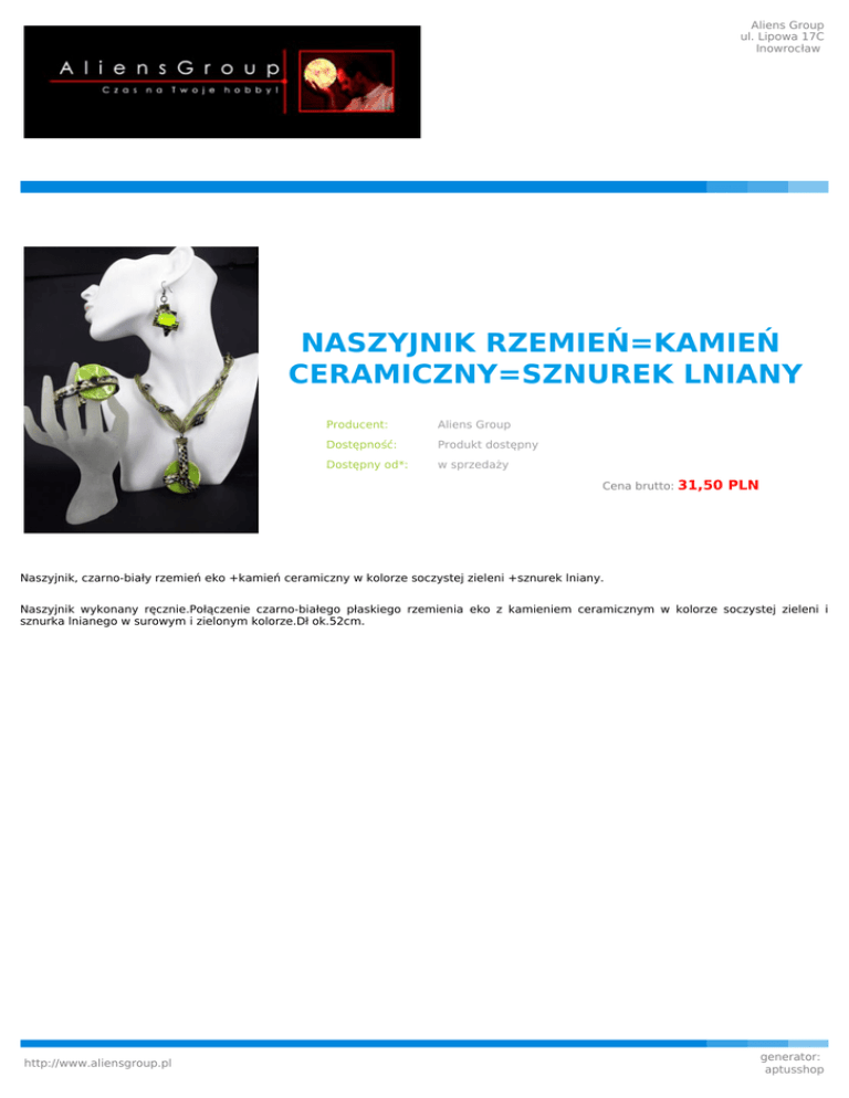 Aliens Group ul. Lipowa 17C Inowrocław NASZYJNIK RZEMIEŃ=KAMIEŃ CERAMICZNY=SZNUREK LNIANY Producent: Aliens Group Dostępność: Produkt dostępny Dostępny od*: w sprzedaży Cena brutto: 31,50 PLN Naszyjnik, czarno-biały rzemień eko +kamień ceramiczny w kolorze soczystej zieleni +sznurek lniany. Naszyjnik wykonany ręcznie.Połączenie czarno-białego płaskiego rzemienia eko z kamieniem ceramicznym w kolorze soczystej zieleni i sznurka lnianego w surowym i zielonym kolorze.Dł ok.52cm. http://www.aliensgroup.pl generator: aptusshop