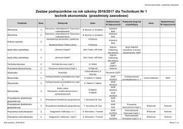 Technik ekonomista - przedmioty zawodowe Zestaw podręczników na rok szkolny 2016/2017 dla Technikum Nr 1 technik ekonomista (przedmioty zawodowe) Przedmiot Klasa Ekonomia 1 Ekonomia 2 Kultura zawodu Podręcznik Ćwiczenia z mikroekonomii. Ćwiczenia z makroekonomii. Ćwiczenia z mikroekonomii. Ćwiczenia z makroekonomii. Kompetencje personalne i społeczne Autor B. Biernat, A. Grobelna B. Biernat, A. Grobelna A Komosa 2 Bezpieczeństwo i higiena pracy A Komosa Język obcy zawodowy 2 „Business English” John Taylor, Jeff Zeter Język obcy zawodowy 3 „Business English” John Taylor, Jeff Zeter Technika biurowa 2 Technika biurowa część 1 E J Witek Pracownia ekonomiczna 2 Pracownia ekonomiczna Część 1 Statystyka 1 Statystyka B Padurek A Musiałkiewicz, A Komosa Ekonomika 1 Ekonomika 2 Funkcjonowanie przedsiębiorstw część 2 Funkcjonowanie przedsiębiorstw część 2 D. Debski, P. Dębski D. Debski, P. Dębski 3 Kadry i płace Planowanie, analiza ekonomiczna i sprawozdawczość D Dębski, D Dębski 1 Prowadzenie działalności gospodarczej T. Gorzelany W. Aue 2 Prowadzenie działalności gospodarczej T. Gorzelany W. Aue Pracownia rachunkowości 2 Księgowość i kalkulacja cz. 1 G. Borowska I. Frymark Pracownia rachunkowości 3 Księgowość i kalkulacja część 2 G. Borowska I. Frymark Ekonomika Prowadzenie działalności gospodarczej Prowadzenie działalności gospodarczej Data wydruku: 2016-06-23 Wydawnictwo/ Podręcznik drugi lub Nr dopuszczenia uzupełniający Autor Wydawnictwo/ Nr dopuszczenia Joanna Ablewicz WSiP B Padurek Padurek B Padurek Padurek B Padurek Padurek Edukator Brak Edukator Brak Edukator Brak Express Publishing Nie dotyczy Express Publishing Nie dotyczy EMPI2 Język angielski zawodowy w branży ekonomicznej. WSiP 12/2011 Padurek Ekonomik 33/97 WSiP 45/2013 WSiP 45/2013 WSiP 49/2013 WSiP 46/2013 WSiP brak Funkcjonowanie przedsiębiorstw cz. 1 WSiP brak WSiP 61/2013 WSiP 61/2014 Pracownia ekonomiczna Część 2 Rachunkowość finansowa Część 1 Rachunkowość finansowa Część 2 i 3 Strona 1 z 2 Technik ekonomista - przedmioty zawodowe Przedmiot Klasa Podręcznik Autor Pracownia rachunkowości 4 Inwentaryzacja. Sprawozdawczość i analiza finansowa G. Borowska I. Frymark Prawo 1 Elementy prawa J. Lewandowski Podstawy rachunkowości 1 Księgowość i kalkulacja część 1 G Borowska, I Frymark Pracownia ekonomicznoinformatyczna 3 Pracownia ekonomiczna Część 1 i 3 B Padurek Pracownia ekonomicznoinformatyczna 4 Brak Kadry i płace 2 Pracownia ekonomiczna cz.2 Data wydruku: 2016-06-23 B. Padurek Wydawnictwo/ Podręcznik drugi lub Nr dopuszczenia uzupełniający WSiP 61/2015 WSiP 03/2008 WSiP 61/2013 Padurek Rachunkowość finansowa cz. IV Zbiór ćwiczeń do egzaminu zawodowego Zbiór ćwiczeń do egzaminu zawodowego Autor Wydawnictwo/ Nr dopuszczenia B Padurek Padurek B Padurek Padurek B Padurek Padurek B.Padurek Strona 2 z 2