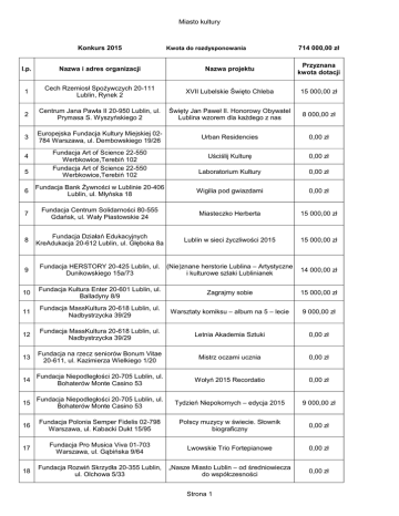 Miasto kultury Konkurs 2015 Kwota do rozdysponowania 714 000,00 zł l.p. Nazwa i adres organizacji Nazwa projektu Przyznana kwota dotacji 1 Cech Rzemiosł Spożywczych 20-111 Lublin, Rynek 2 XVII Lubelskie Święto Chleba 15 000,00 zł 2 Centrum Jana Pawła II 20-950 Lublin, ul. Prymasa S. Wyszyńskiego 2 Święty Jan Paweł II. Honorowy Obywatel Lublina wzorem dla każdego z nas 8 000,00 zł 3 Europejska Fundacja Kultury Miejskiej 02784 Warszawa, ul. Dembowskiego 19/26 Urban Residencies 0,00 zł Uściślij Kulturę 0,00 zł Laboratorium Kultury 0,00 zł 4 5 Fundacja Art of Science 22-550 Werbkowice,Terebiń 102 Fundacja Art of Science 22-550 Werbkowice,Terebiń 102 6 Fundacja Bank Żywności w Lublinie 20-406 Lublin, ul. Młyńska 18 Wigilia pod gwiazdami 0,00 zł 7 Fundacja Centrum Solidarności 80-555 Gdańsk, ul. Wały Piastowskie 24 Miasteczko Herberta 15 000,00 zł 8 Fundacja Działań Edukacyjnych KreAdukacja 20-612 Lublin, ul. Głęboka 8a Lublin w sieci życzliwości 2015 15 000,00 zł 9 Fundacja HERSTORY 20-425 Lublin, ul. Dunikowskiego 15a/73 (Nie)znane herstorie Lublina – Artystyczne i kulturowe szlaki Lublinianek 14 000,00 zł 10 Fundacja Kultura Enter 20-601 Lublin, ul. Balladyny 8/9 Zagrajmy sobie 15 000,00 zł 11 Fundacja MassKultura 20-618 Lublin, ul. Nadbystrzycka 39/29 Warsztaty komiksu – album na 5 – lecie 9 000,00 zł 12 Fundacja MassKultura 20-618 Lublin, ul. Nadbystrzycka 39/29 Letnia Akademia Sztuki 0,00 zł 13 Fundacja na rzecz seniorów Bonum Vitae 20-611, ul. Kazimierza Wielkiego 1/20 Mistrz oczami ucznia 0,00 zł 14 Fundacja Niepodległości 20-705 Lublin, ul. Bohaterów Monte Casino 53 Wołyń 2015 Recordatio 0,00 zł 15 Fundacja Niepodległości 20-705 Lublin, ul. Bohaterów Monte Casino 53 Tydzień Niepokornych – edycja 2015 9 000,00 zł 16 Fundacja Polonia Semper Fidelis 02-798 Warszawa, ul. Kabacki Dukt 15/95 Polscy muzycy w świecie. Słownik biograficzny 0,00 zł 17 Fundacja Pro Musica Viva 01-703 Warszawa, ul. Gąbińska 9/64 Lwowskie Trio Fortepianowe 0,00 zł 18 Fundacja Rozwiń Skrzydła 20-355 Lublin, ul. Olchowa 5/33 „Nasze Miasto Lublin – od średniowiecza do współczesności 0,00 zł Strona 1 Miasto kultury 19 Fundacja Ruchu Solidarności Rodzin 20Gra miejska: Orła Wrona nie pokona ed. 2 109 Lublin, ul. Królewska 3 20 Fundacja Ruchu Solidarności Rodzin 20109 Lublin, ul. Królewska 3 Międzyszkolna Liga Gier Planszowych 2015 – edycja 3 0,00 zł 21 Fundacja Sceny InVitro 20-112 Lublin, ul. Złota 4 Aporia – Wołyń 1943 18 000,00 zł 22 Fundacja Sono Organi 21-002 Jastków, Barak 46c Bronowickie koncerty muzyki organowej kameralnej „Muzyka moją modlitwą” 0,00 zł 23 Fundacja Społecznie Wrażliwi 20-418 Lublin, ul. Nowy Świat 24/5 Wideoprzewodnik po dziedzictwie kulturowym Lublina 0,00 zł 24 Fundacja Społecznie Wrażliwi 20-418 Lublin, ul. Nowy Świat 24/5 100 x TAK dla Fotografii 0,00 zł 25 Fundacja Szpilka 20-838, ul. Prząśniczki 5/3 Kobieta i sztuka. Rozważna i romantyczna 11 000,00 zł 26 Fundacja Sztukmistrze 20-282 Lublin, ul. Kr. Jadwigi 19/56 Zatańcz w powietrzu 6 000,00 zł 27 Fundacja Teatrikon 20-860 Lublin, ul. Szpinalskiego 4/17 Wózek ze sztuką 0,00 zł 28 Fundacja Teatroterapia Lubelska 20-863 Lublin, ul. Młodej Polski 32/144 Interaktywna Galeria Art Brut 50 000,00 zł 29 Fundacja Teren Otwarty 20-611 Lublin, ul. Bolesława Chrobrego 1/25 Pojednanie przez trudną pamięć. Tarnopolszczyzna 0,00 zł 30 Fundacja Teren Otwarty 20-611 Lublin, ul. Bolesława Chrobrego 1/25 Lublinianie inspirują lublinian 25 000,00 zł 31 Fundacja Willa Polonia 20-089 Lublin, ul. Probostwo 26 Stanisław Kostka Potocki – Lublinianin, Polak, Europejczyk 0,00 zł 32 Kościół Rektoralny pw. Wniebowzięcia N.M.P Zwycięskiej 20-004 Lublin, ul. Narutowicza 6 Wieczory muzyczne w Kościele Pobrygidkowskim. Koncert: Zaduszki pobrygidkowskie 7 000,00 zł 33 Lubelska Fundacja Jeździectwa 20-403 Lublin, ul. Ciepła 7 „Lublin – ludzie, budynki, rośliny, zwierzęta” - rośliny i zwierzęta 0,00 zł LubLarp Lab 0,00 zł Lubelskie Stowarzyszenie Fantastyki 34 Cytadela Syriusza 20-128 Lublin, Lwowska 12 35 Parafia Rzymsko-katolicka pw. św. Jakuba Konkurs poświęcony św. Janowi Pawłowi Apostoła w Lublinie, 20-385 Lublin, ul. II Głuska 145 36 Parafia Rzymskokatolicka pw. św. Jana Chrzciciela i św. Jana Ewangelisty 20-109 Lublin, ul. Królewska 10 Wyjazd Chóru Archikatedry Lubelskiej z koncertami do Lwowa Strona 2 10 000,00 zł 13 000,00 zł 0,00 zł Miasto kultury 37 Polskie Centrum Mediacji Oddział w Lublinie 20-030, ul. Obrońców Pokoju 2a/100 Kultura w mediacji, mediacja w kulturze 0,00 zł 38 Polskie Stowarzyszenie Pedagogów i Animatorów KLANZA 20-007 Lublin, ul. Peowiaków 10/9 Sobota w bawialni 12 000,00 zł 39 Polskie Stowarzyszenie Pedagogów i Animatorów KLANZA 20-007 Lublin, ul. Peowiaków 10/9 Mobilny plac zabaw twórczych 0,00 zł 2. Międzynarodowe Biennale Plakatu ISPB Lublin 2015 25 000,00 zł Stowarzyszenie Artystyczne Otwarta 40 Pracownia 20-863 Lublin, ul. Młodej Polski 18/8 41 Stowarzyszenie Centrum Wolontariatu 20113 Lublin, ul. Jezuicka 4 Legendy Dawnego Miasta 40 000,00 zł 42 Stowarzyszenie Dla Ziemi 21-132 Kamionka, Bratnik 5 Grający plac zabaw 0,00 zł 43 Stowarzyszenie Dobrych Praktyk Społecznych Zmiana 20-576 Lublin, ul. Bursztynowa 32/18 Student zaangażowany – aktywność społeczności akademickiej w przestrzeni kulturalnej i społecznej Lublina 0,00 zł 44 Stowarzyszenie Kresowa Akademia Smaku 20-112 Lublin, Złota 3 Europejski Festiwal Smaku 125 000,00 zł Stowarzyszenie na rzecz Chóru Udział Chóru KUL w Festiwalu Chórów w 45 Katolickiego Uniwersytetu Lubelskiego 20Münster 950 Lublin, Al. Racławickie 14 0,00 zł 46 Stowarzyszenie Obywatelski Lublin – Münster 20-631 Lublin, ul. Pana Balcera 8 Redakcja, druk i oprawa niemieckojęzycznej wersji bedekera „Lublin” 0,00 zł 47 Stowarzyszenie on/off 20-611 Lublin, ul. Kazimierza Wielkiego 9/16 Every body tells a story 