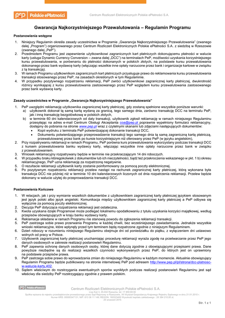 Centrum Rozliczeń Elektronicznych Polskie ePłatności S.A. Gwarancja Najkorzystniejszego Przewalutowania – Regulamin Programu Postanowienia wstępne 1. 2. 3. 4. Niniejszy Regulamin określa zasady uczestnictwa w Programie „Gwarancja Najkorzystniejszego Przewalutowania” (zwanego dalej „Program”) organizowanego przez Centrum Rozliczeń Elektronicznych Polskie ePłatności S.A. z siedzibą w Rzeszowie (zwanego dalej „PeP”). Przedmiotem Programu jest zapewnienie użytkownikowi zagranicznych kart płatniczych dokonującemu płatności w walucie karty (usługa Dynamic Currency Conversion – zwana dalej „DCC”) na terminalach PeP, możliwości uzyskania korzystniejszego kursu przewalutowania, w porównaniu do płatności dokonanych w polskich złotych, na podstawie kursu przewalutowania dokonanego przez bank wydawcę karty (włączając wszelkie inne opłaty narzucone przez bank i organizacje kartowe w związku z tą transakcją). W ramach Programu użytkownikom zagranicznych kart płatniczych przysługuje prawo do reklamowania kursu przewalutowania transakcji stosowanego przez PeP, na zasadach określonych w tym Regulaminie. W przypadku pozytywnego rozpatrzeniu reklamacji, PeP zwróci użytkownikowi zagranicznej karty płatniczej, dwukrotność różnicy wynikającej z kursu przewalutowania zastosowanego przez PeP względem kursu przewalutowania zastosowanego przez bank wydawcę karty. Zasady uczestnictwa w Programie „Gwarancja Najkorzystniejszego Przewalutowania” 1. 2. 3. 4. 5. 6. PeP uwzględni reklamację użytkownika zagranicznej karty płatniczej, gdy zostaną spełnione wszystkie poniższe warunki: a) użytkownik dokonał tą samą kartą wydaną za granicą, tego samego dnia, zarówno transakcję DCC na terminalu PeP, jak i inną transakcję bezgotówkową w polskich złotych, b) w terminie 60 dni kalendarzowych od daty transakcji, użytkownik zgłosił reklamację w ramach niniejszego Regulaminu przesyłając na adres e-mail Centrum Obsługi Akceptanta [email protected] poprawnie wypełniony formularz reklamacyjny, dostępny do pobrania na stronie www.pep.pl wraz z czytelnymi skanami lub zdjęciami następujących dokumentów: Kopii wydruku z terminala PeP potwierdzającej dokonanie transakcji DCC, Dokumentu potwierdzającego przeprowadzenie transakcji tego samego dnia tą samą zagraniczną kartą płatniczą, przewalutowanej przez bank po kursie korzystniejszym niż oferowany przez PeP (w języku angielskim), Przy rozpatrywaniu reklamacji w ramach Programu, PeP porówna kurs przewalutowania wykorzystany podczas transakcji DCC z kursem przewalutowania banku wydawcy karty, włączając wszystkie inne opłaty narzucone przez bank w związku z przewalutowaniem. Wniosek reklamacyjny rozpatrywany będzie w terminie nie przekraczającym 14 dni roboczych. W przypadku braku któregokolwiek z dokumentów lub ich nieczytelności, bądź też przekroczenia wskazanego w pkt. 1 b) okresu reklamacyjnego, PeP uzna reklamację za rozpatrzoną negatywnie. O rezultacie reklamacji użytkownik karty zostanie poinformowany za pomocą poczty elektronicznej. Po pozytywnym rozpatrzeniu reklamacji przelew nastąpi na rachunek zagranicznej karty płatniczej, którą wykonana była transakcja DCC nie później niż w terminie 10 dni kalendarzowych liczonych od dnia rozpatrzenia reklamacji. Przelew będzie dokonany w walucie użytej do przeprowadzenia transakcji DCC. Postanowienia Końcowe W relacjach, jak i przy wymianie wszelkich dokumentów z użytkownikiem zagranicznej karty płatniczej językiem stosowanym jest język polski albo język angielski. Komunikacja między użytkownikiem zagranicznej karty płatniczej a PeP odbywa się wyłącznie za pomocą poczty elektronicznej. 2. Decyzja PeP dotycząca rozpatrzenia reklamacji jest ostateczna. 3. Kwota uzyskana dzięki Programowi może podlegać lokalnemu opodatkowaniu z tytułu uzyskania korzyści majątkowej, według przepisów obowiązujących w kraju banku wydawcy karty. 4. Reklamacje składane w ramach Programu nie stanowią powodu do zgłoszenia reklamacji transakcji. 5. PeP zastrzega sobie prawo przerwania Programu w każdej chwili, bez wcześniejszego zawiadamiania. Jednakże wszystkie wnioski reklamacyjne, które wpłynęły przed tym terminem będą rozpatrzone zgodnie z niniejszym Regulaminem. 6. Dzień roboczy w rozumieniu niniejszego Regulaminu obejmuje dni od poniedziałku do piątku, z wyłączeniem dni ustawowo wolnych od pracy w Polsce. 7. Użytkownik zagranicznej karty płatniczej uruchamiając procedurę reklamacji wyraża zgodę na przetwarzanie przez PeP jego danych osobowych w zakresie realizacji postanowień Regulaminu. 8. PeP zapewnia ochronę danych osobowych osoby, której dane dotyczą zgodnie z obowiązującymi przepisami prawa. Dane powyższe niezbędne są do realizacji wszelkich czynności wykonywanych przez PeP, do których jest on uprawniony na podstawie przepisów prawa. 9. PeP zastrzega sobie prawo do wprowadzania zmian do niniejszego Regulaminu w każdym momencie. Aktualnie obowiązujący Regulamin Programu będzie publikowany na stronie internetowej PeP pod adresem http://www.pep.pl/pl/strona/dcc-platnoscw-walucie-karty,402. 10. Sądem właściwym do rozstrzygania ewentualnych sporów wynikłych podczas realizacji postanowień Regulaminu jest sąd właściwy dla siedziby PeP rozstrzygający zgodnie z prawem polskim. 1. Centrum Rozliczeń Elektronicznych Polskie ePłatności S.A. Lisa Kuli 3, 35-032 Rzeszów, tel.:17 859 69 00 Spółka wpisana do rejestru przedsiębiorców prowadzonego przez Sąd Rejonowy w Rzeszowie, XII Wydział Gospodarczy Krajowego Rejestru Sądowego w dniu 21.01.2010 r. Numer KRS :00000347131; NIP: 813 36 11 149; REGON: 180523400 Wysokość kapitału zakładowego : 28 384 210,00 zł; 25 wrzesień 2015 Str. 1 z 1