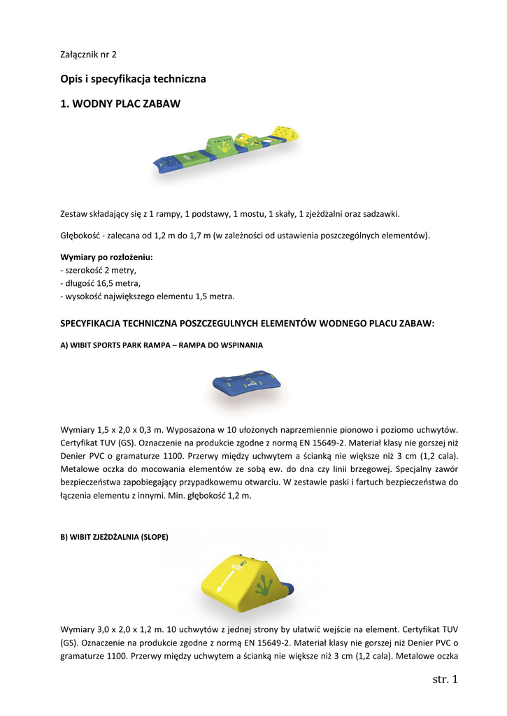 Załącznik nr 2 Opis i specyfikacja techniczna 1. WODNY PLAC ZABAW Zestaw składający się z 1 rampy, 1 podstawy, 1 mostu, 1 skały, 1 zjeżdżalni oraz sadzawki. Głębokość - zalecana od 1,2 m do 1,7 m (w zależności od ustawienia poszczególnych elementów). Wymiary po rozłożeniu: - szerokość 2 metry, - długość 16,5 metra, - wysokość największego elementu 1,5 metra. SPECYFIKACJA TECHNICZNA POSZCZEGULNYCH ELEMENTÓW WODNEGO PLACU ZABAW: A) WIBIT SPORTS PARK RAMPA – RAMPA DO WSPINANIA Wymiary 1,5 x 2,0 x 0,3 m. Wyposażona w 10 ułożonych naprzemiennie pionowo i poziomo uchwytów. Certyfikat TUV (GS). Oznaczenie na produkcie zgodne z normą EN 15649-2. Materiał klasy nie gorszej niż Denier PVC o gramaturze 1100. Przerwy między uchwytem a ścianką nie większe niż 3 cm (1,2 cala). Metalowe oczka do mocowania elementów ze sobą ew. do dna czy linii brzegowej. Specjalny zawór bezpieczeństwa zapobiegający przypadkowemu otwarciu. W zestawie paski i fartuch bezpieczeństwa do łączenia elementu z innymi. Min. głębokość 1,2 m. B) WIBIT ZJEŻDŻALNIA (SLOPE) Wymiary 3,0 x 2,0 x 1,2 m. 10 uchwytów z jednej strony by ułatwić wejście na element. Certyfikat TUV (GS). Oznaczenie na produkcie zgodne z normą EN 15649-2. Materiał klasy nie gorszej niż Denier PVC o gramaturze 1100. Przerwy między uchwytem a ścianką nie większe niż 3 cm (1,2 cala). Metalowe oczka str. 1 do mocowania elementów ze sobą ew. do dna czy linii brzegowej. Specjalny zawór bezpieczeństwa zapobiegający przypadkowemu otwarciu. W zestawie paski i fartuch bezpieczeństwa do łączenia elementu z innymi. Min. głębokość 1,7 m. C) WIBIT MOST BRIDGE) - PŁYWAJACY MOST Wymiary 3,0 x 2,0 x 1,2 m, Certyfikat TUV (GS). Oznaczenie na produkcie zgodne z normą EN 15649-2. Materiał klasy nie gorszej niż Denier PVC o gramaturze 1100. Metalowe oczka do mocowania elementów ze sobą ew. do dna czy linii brzegowej. Specjalny zawór bezpieczeństwa zapobiegający przypadkowemu otwarciu. W zestawie fartuch bezpieczeństwa do łączenia elementu z innymi. D) WIBIT SADZAWKA (POND) – PŁYWAJĄCA SADZAWKA W KSZTAŁCIE PROSTOKĄTA Wymiary 3,0 x 2,0 x 0,3 m. Certyfikat TUV (GS). Oznaczenie na produkcie zgodne z normą EN 15649-2. Materiał klasy nie gorszej niż Denier PVC o gramaturze 1100. Metalowe oczka do mocowania elementów ze sobą ew. do dna czy linii brzegowej. Specjalny zawór bezpieczeństwa zapobiegający przypadkowemu otwarciu. W zestawie paski i fartuch bezpieczeństwa do łączenia elementu z innymi. Min. głębokość 1,2 m. E) WIBIT SKALA (CLIFF) – PŁYWAJĄCY KLIF Z UCHWYTAMI Wymiary 3,0 x 2,0 x 1,5 m, wyposażony w 6 uchwytów z każdej strony. Certyfikat TUV (GS) Oznaczenie na produkcie zgodne z normą EN 15649-2. Materiał klasy nie gorszej niż Denier PVC o gramaturze 1100. Przerwy między uchwytem a ścianką nie większe niż 3 cm (1,2 cala). Metalowe oczka do mocowania elementów ze sobą ew. do dna czy linii brzegowej. Specjalny zawór bezpieczeństwa zapobiegający przypadkowemu otwarciu. W zestawie paski i fartuch bezpieczeństwa do łączenia elementu z innymi. Min. głębokość 1,6 m. str. 2 F) WIBIT PODSTAWA (BASE) – BAZA PŁYWAJĄCA Wymiary 3,0 x 2,0 x 0,3 m. Certyfikat TUV (GS). Oznaczenie na produkcie zgodne z normą EN 15649-2. Materiał klasy nie gorszej niż Denier PVC o gramaturze 1100. Metalowe oczka do mocowania elementów ze sobą ew. do dna czy linii brzegowej. Specjalny zawór bezpieczeństwa zapobiegający przypadkowemu otwarciu. W zestawie paski i fartuch bezpieczeństwa do łączenia elementu z innymi. Min. głębokość 1,2 m. ZESTAW MONTAŻOWY str. 3