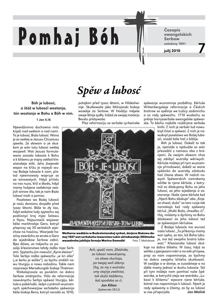 Časopis ewangelskich Serbow załoženy 1891 julij 2010 7 Spěw a lubosć spěwanje wuznamnje pozběhny. Kěrluše Wittenbergskeje reformacije a Čěskich bratrow so spěšnje we Łužicy zadomichu a so rady spěwachu. 1710 wudachu so prěnje hornjoserbske ewangelske spěwar1 Jan 4,16 ske. To běchu najbóle rozšěrjene serbske knihi. Z nich je serbski lud nawuNjewidźomna duchowna móc knył čitać a spěwać. Z nich je naknježi nad swětom a nad nami. wuknył poselstwo wo Božej luboTo je lubosć, Boža lubosć. Wona sći, snadź bóle hač z biblije. je so swětej w Jezusu Chrystusu Bóh je lubosć. Dokelž to tak zjewiła. Ze słowom a ze skutje, njemóže a njebudźe so wón kom je wón tutu lubosć swětej přesadźić z namocu abo z brówozjewił. Wot Jezusa formulonjemi. Ze swojim słowom chce wana zasada lubosće k Bohu sej zdobyć wutroby wěriwych. a k blišemu je trajny zakład křeKěrluše móžeja při tym wuznamsćanskeje etiki. Jeho žiwjenski nje přinošować, dokelž so wone wopor na křižu je najwyši wuspěšnišo do wutroby zdobudu raz Božeje lubosće k nam, přehač čitane słowo. W našich notož njewinowaty wopruje so wych Spěwarskich namakamy za winowatych. Hdyž přińdu wšitke te rjane kěrluše, z kotryna nas nuza, křiž a škoda, hdyž miž so dźakujemy Bohu za jeho mamy hubjene swědomje swolubosć, za jeho wjedźenje a zajich winow dla, tak je nam Boža staranje. Naše rjane kěrluše kaž lubosć trošt a pomoc. „Njech Bohu dźakuje“ abo „KnjePoselstwo wo Božej lubosći za chwal, duša“ so tam runje tak je našu domiznu docpěło před namakaja kaž rady spěwany tysac lětami. Běše to zły čas, kěrluš „Wulki Božo, chwalbu ći“. hdyž wokolne ludy spytachu sej Haj, móžemy a dyrbimy so Bohu podćisnyć kraj mjez Solawu dźakować za jeho lubosć tež a Nysu. Najsurowiši wojowar ze spěwanjom kěrlušow. běše markhrabja Gero, kotryž Z Božeje lubosće ma wurosć přeprosy sej 30 serbskich wjerchow na hosćinu. Wosrjedź ho- Wołtarne wodźěće w Budestečanskej cyrkwi, darjene Božemu do- naša lubosć. „Tu přikaznju mamy sćiny zawrěchu so wrota a Gero mej 1927 wot serbskeho towarstwa Lubin składnostnje 25lětneho wot njeho, zo tón, kiž Boha lubuda wjednikow Serbow zabić. wosadneho jubileja fararja Morica Domaški Foto: T. Malinkowa je, ma tež swojeho bratra lubować.“ Křesćanska lubosć skutBjez dźiwa, zo mějachu so pokuje na dobro blišeho. W času, hdyž so soljo křesćanstwa tehdy ćežko mjez SerbAch, spožč nam, Zbóžniko, wšitko z pjenjezami měri a na wiki přinjese, ami. Spytachu jim nawučić „Kyrie eleison“. zo lubosć nawuknjemy, praji so nam napominanje, zo bychmy Tola Serbja radšo spěwachu „w kri olša“ na słowo słuchajo, na dobro swojeho blišeho skutkowali. („w kerku je wólša“), zo bychu směšili nopo twojej woli dźemy. W swójbje a w domje, w susodstwje a na wu liturgiju a nowu nabožinu. Takle nam Daj, zo my z wutrobu dźěle mamy jednać w duchu lubosće. Tež rozprawja Merseburgski biskop Thietmar. smy stajnje zwólniwi, při tym móžeja nam pomhać naše SpěWobstejnosće so poněčim na dobro warske, w kotrychž steja we wotrězku „Lutak słužić kóždemu, Serbow změnjachu. Hižo do reformacije bosć k blišemu“ wjacore rjane kěrluše, nawuknychu Serbja spěwać liturgiju, kěrkaž spodoba so ći. kotrež nas napominaja k lubosći. Njech je luše a pokěrluški. Jedyn z prěnich wuznamJan Kilian rady spěwamy a čitamy, zo by so lubosć nych spěchowarjow serbskeho spěwanja (Spěwarske 283,3) w nas přisporjała. Jan Malink běše biskop Beno, kotryž narodźi so 1010, Bóh je lubosć, a štóž w lubosći wostanje, tón wostanje w Bohu a Bóh w nim. potajkim před tysac lětami, w Hildesheimje. Skutkowaše jako Mišnjanski biskop wosebje za Serbow. W Hodźiju měješe swoje lětnje sydło, hdźež ze swojej maćerju Becelu přebywaše. Přez reformaciju so serbske cyrkwinske 2 julij 2010 Lube dźěći! Serbski swjedźeń we Wuježku Serbske ewangelske towarstwo přeprošuje sobotu, 14. awgusta, na swójbne pućowanje do Wuježka pod Čornobohom. Zetkamy so w 12.30 hodź. pola Krygarjec (čisło 31 A) we Wuježku a pućujemy wottam na Bubnik. Po puću njech so kóždy sam ze swojeho nachribjetnika zastara. Po zwučenym wašnju přizamknje so w 17 hodź. nutrnosć ze sup. Janom Malinkom na Pawlikec/Dejkec statoku. We 18 hodź. sćěhuje kulturny program. W bróžni budźe bifej natwarjeny. Štóž chce něšto za bifej přinošować abo sobu pomhać dwór wupyšić, njech so prošu přizjewi (tel. 03 59 39 / 8 05 02). Mato Krygaŕ Serbski bus 2010 Wuhódanje: Boža lubosć je nam kaž słónco (Spěwarske čo. 287) Lěćne prózdniny su tu! Žana šula! Wuspać, słónco, dowol, kupać, wulěty, knihu čitać … Snano so tak derje čujeće, zo sej samo spěw zaspěwaće. Namjetuju wam, zo tež tón spěw spěwaće, kiž je w płastach schowany. Přešmórńće pismiki w kóždym płasće, kotrež tam dwójce abo wjac króć steja. Někotre pismiki wostanu wyše a z tutych dyrbiće słowo tworić. Ze šěsć wuhódanych słowow spóznajeće započatk načasneho cyrkwinskeho spěwa, kiž steji nětko tež w našich nowych rjanych Spěwarskich. Wjele wjesela při hódanju! Gabriela Gruhlowa Njewšědne twarnišćo w Bukecach Nětk je skónčnje tak daloko. Twarske dźěła k zatwarjenju noweho, ze štyrjoch zwonow wobstejaceho zwonjenja na Bukečanskej cyrkwinskej wěži su so zahajili. Z lěta Pjatk, 4. junija, zběhachu zwony z Bukečanskeje cyrkwineje wěže. Foće: wosada Bukecy 2005 składuje wosada za tute předewzaće pjenjezy. Rozsud za nowe zwonjenje běše njewobeńdźomny, po tym zo běchu fachowcy zwěsćili, zo ma so zwonowy podstaw w blišim času wobnowić. Serbja Bukečanskeje wosady su z wosebitej zběrku Pomhaj Bóh k zwoprawdźenju serbskich napismow na třoch nowych zwonach, kiž so nětčišemu srěnjemu z lěta 1930 přidruža, př