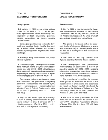 DZIAŁ III CHAPTER III SAMORZĄD TERYTORIALNY LOCAL GOVERNMENT Uwagi ogólne General notes 1. Z dniem 1 I 1999 r. (na mocy ustawy z dnia 24 VII 1998 r., Dz. U. Nr 96, poz. 603) wprowadzono nowy zasadniczy trójstopniowy podział terytorialny państwa, którego jednostkami są: gminy, powiaty i województwa. 1. On 1 I 1999 a new fundamental three-tier administrative division of the country (Journal of Laws No. 96, item 603, dated 24 VII 1998) was introduced, the units of which are: gminas, powiats and voivodships. Gmina jest podstawową jednostką terytorialnego podziału kraju. Kraków jest gminą, a jednocześnie miastem na prawach powiatu i podregionem województwa małopolskiego. The gmina is the basic unit of the country's territorial structure. Kraków is a gmina and simultaneously a city with powiat status as well as a subregion of the Małopolskie voivodship. 2. Kadencja Rady Miasta trwa 4 lata, licząc od dnia wyborów. 2. The term of the City Council lasts 4 years, counting from the day of election. 3. Charakterystykę demograficzno-zawodową radnych oparto o wyniki sprawozdawczości za lata 2013, 2014 aktualizującej dane o radnych zawarte w obwieszczeniach terytorialnych komisji wyborczych z wyborów samorządowych w dniu 16 XI 2014 r. 3. The demographic and professional characteristics of councillors is based on reporting results for 2013, 2014, updating information concerning councillors included in announcements of local election commissions from the 16 XI 2014 elections. Grupowania radnych według grup zawodów dokonano na podstawie Klasyfikacji Zawodów i Specjalności dla potrzeb rynku pracy wprowadzonej rozporządzeniem Ministra Pracy i Polityki Społecznej z dnia 27 IV 2010 r. (jednolity tekst Dz. U. 2014 poz. 760). The grouping of councillors by occupational groups is made on the basis of the classification of professions and specialties for needs of labour market introduced by a decree of the Ministry of Labour and Social Policy, dated 27 IV 2010 (uniform text Journal of Laws 2014 item 760). 4. Wybory do samorządu terytorialnego w 2014 r. zostały przeprowadzone na podstawie ustawy z dnia 5 stycznia 2011 r. - Kodeks wyborczy (Dz. U. z 2011 r. nr 21, poz. 112, z późniejszymi zmianami.) 4. Elections to local government in 2014 were held on the basis of the Law of 5 January 2011 - Electoral Regulations (Journal of Laws 2011 No. 21, item 112 with later amendments). 90 SAMORZĄD TERYTORIALNY TABL. 1 (15). WYNIKI WYBORÓW DO RADY MIASTA RESULTS OF THE ELECTIONS TO THE CITY COUNCIL Wybory w dniu WYSZCZEGÓLNIENIE 27 X 2002 12 XI 2006 Elections on 21 XI 2010 SPECIFICATION 16 XI 2014 Liczba mandatów .................... 43 43 43 43 Number of mandates Kandydaci na radnych: ogółem .................................. na 1 mandat ......................... 1081 25,14 963 22,40 636 14,79 Uprawnieni do głosowania ...... 576909 586119 586072 586233 Persons entitled to vote Oddane głosy .......................... w % uprawnionych ............ w tym głosy ważne ............... 202253 35,1 195292 245824 41,9 238777 253006 43,2 243873 245699 Votes cast 41,9 in % of entitled voters 228864 of which valid votes Procent głosów ważnych ......... 96,6 97,1 96,4 93,1 Percentage of valid votes 641 14,91 Candidates for councillors: total per mandate Ź r ó d ł o: dane Urzędu Miasta Krakowa i Państwowej Komisji Wyborczej. S o u r c e: data of the Municipality of Kraków and the State Election Commission. TABL. 2 (16). WYBORY BEZPOŚREDNIE PREZYDENTA MIASTA KRAKOWA W 2014 R. DIRECT ELECTION OF THE PRESIDENT OF KRAKOW IN 2014 WYSZCZEGÓLNIENIE Głosowanie w dniu Voting on 16 XI SPECIFICATION 30 XI Liczba zarejestrowanych kandydatów 8 2 Number of registered candidates Uprawnieni do głosowania ................. 586213 584991 Persons entitled to vote Oddane głosy ..................................... w % uprawnionych ....................... 245791 41,9 w tym głosy ważne .......................... w % uprawnionych ....................... 242771 41,4 198581 Votes cast 33,9 in % of entitled voters 195182 of which valid votes 33,4 in % of entitled voters Ź r ó d ł o: dane Państwowej Komisji Wyborczej. S o u r c e: data of the State Election Commission. TABL. 3 (17). WYNIKI WYBORÓW BEZPOŚREDNICH PREZYDENTA MIASTA KRAKOWA W DNIU 30 XI 2014 R. RESULTS OF THE DIRECT ELECTION OF THE PRESIDENT OF KRAKOW ON 30 XI 2014 NAZWISKO I IMIĘ SURNAME AND FIRST NAME Majchrowski Jacek Lasota Marek Liczba głosów Number of votes Wybrany Chosen w % głosów in % of votes ogółem total 114705 58,8 TAK YES 80477 41,2 NIE NO Ź r ó d ł o: dane Państwowej Komisji Wyborczej. S o u r c e: data of the State Election Commission. LOCAL GOVERNMENT TABL. 4 (18). 91 DZIAŁALNOŚĆ RADY MIASTA ACTIVITIES OF THE CITY COUNCIL Kadencja WYSZCZEGÓLNIENIE SPECIFICATION IV Term V VI VII (2002-2006) (2006-2010) (2010-2014) (2014-2018)a Odbyte posiedzenia (sesje) ................................... Sittings (sessions) done 119 115 122 4 Podjęte uchwały .................................................... Resolutions passed 1296 1600 1982 61 a Do dnia 31 XII 2014 r. Ź r ó d ł o: dane Urzędu Miasta Krakowa. a Until 31 XII 2014. S o u r c e: data of the Municipality of Kraków. TABL. 5 (19). RADNI WEDŁUG WIEKU, POZIOMU WYKSZTAŁCENIA I GRUP ZAWODÓW Stan w dniu 31 XII COUNCILLORS BY AGE, EDUCATIONAL LEVEL AND OCCUPATIONAL GROUPS As of 31 XII WYSZCZEGÓLNIENIE 2005 2010 2013 2014 SPECIFICATION OGÓŁEM TOTAL O G Ó Ł E M ........................... 43 43 43 43 T O T A L w tym kobiety ....................... 9 11 11 12 of which women WEDŁUG WIEKU BY AGE 29 lat i mniej ............................ 2 2 1 3 29 and less 30 - 39 ..................................... 6 15 5 8 30 - 39 40 - 59 ..................................... 26 18 22 16 40 - 59 60 lat i więcej .......................... 9 8 15 16 60 and more WEDŁUG POZIOMU WYKSZTAŁCENIA BY EDUCATIONAL LEVEL Wyższe ................................... 31 37 37