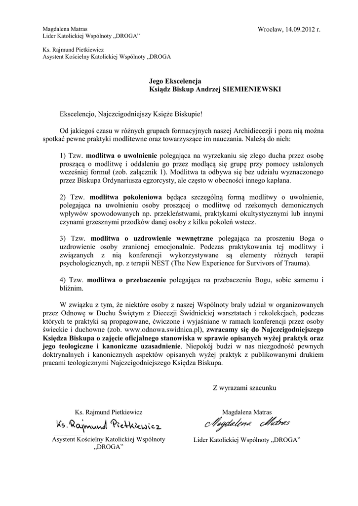 Wrocław, 14.09.2012 r. Magdalena Matras Lider Katolickiej Wspólnoty „DROGA” Ks. Rajmund Pietkiewicz Asystent Kościelny Katolickiej Wspólnoty „DROGA Jego Ekscelencja Ksiądz Biskup Andrzej SIEMIENIEWSKI Ekscelencjo, Najczcigodniejszy Księże Biskupie! Od jakiegoś czasu w różnych grupach formacyjnych naszej Archidiecezji i poza nią można spotkać pewne praktyki modlitewne oraz towarzyszące im nauczania. Należą do nich: 1) Tzw. modlitwa o uwolnienie polegająca na wyrzekaniu się złego ducha przez osobę proszącą o modlitwę i oddaleniu go przez modlącą się grupę przy pomocy ustalonych wcześniej formuł (zob. załącznik 1). Modlitwa ta odbywa się bez udziału wyznaczonego przez Biskupa Ordynariusza egzorcysty, ale często w obecności innego kapłana. 2) Tzw. modlitwa pokoleniowa będąca szczególną formą modlitwy o uwolnienie, polegająca na uwolnieniu osoby proszącej o modlitwę od rzekomych demonicznych wpływów spowodowanych np. przekleństwami, praktykami okultystycznymi lub innymi czynami grzesznymi przodków danej osoby z kilku pokoleń wstecz. 3) Tzw. modlitwa o uzdrowienie wewnętrzne polegająca na proszeniu Boga o uzdrowienie osoby zranionej emocjonalnie. Podczas praktykowania tej modlitwy i związanych z nią konferencji wykorzystywane są elementy różnych terapii psychologicznych, np. z terapii NEST (The New Experience for Survivors of Trauma). 4) Tzw. modlitwa o przebaczenie polegająca na przebaczeniu Bogu, sobie samemu i bliźnim. W związku z tym, że niektóre osoby z naszej Wspólnoty brały udział w organizowanych przez Odnowę w Duchu Świętym z Diecezji Świdnickiej warsztatach i rekolekcjach, podczas których te praktyki są propagowane, ćwiczone i wyjaśniane w ramach konferencji przez osoby świeckie i duchowne (zob. www.odnowa.swidnica.pl), zwracamy się do Najczcigodniejszego Księdza Biskupa o zajęcie oficjalnego stanowiska w sprawie opisanych wyżej praktyk oraz jego teologiczne i kanoniczne uzasadnienie. Niepokój budzi w nas niezgodność pewnych doktrynalnych i kanonicznych aspektów opisanych wyżej praktyk z publikowanymi drukiem pracami teologicznymi Najczcigodniejszego Księdza Biskupa. Z wyrazami szacunku Ks. Rajmund Pietkiewicz Magdalena Matras Asystent Kościelny Katolickiej Wspólnoty „DROGA” Lider Katolickiej Wspólnoty „DROGA”