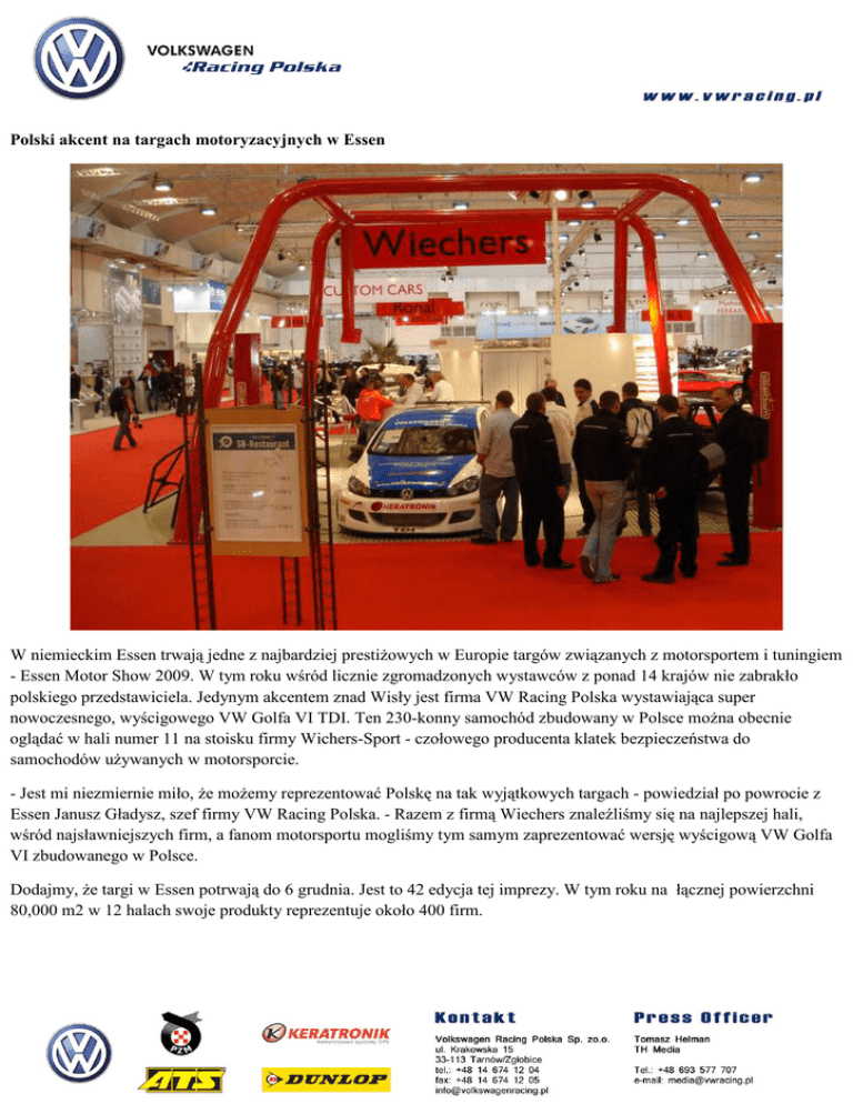 Polski akcent na targach motoryzacyjnych w Essen W niemieckim Essen trwają jedne z najbardziej prestiŜowych w Europie targów związanych z motorsportem i tuningiem - Essen Motor Show 2009. W tym roku wśród licznie zgromadzonych wystawców z ponad 14 krajów nie zabrakło polskiego przedstawiciela. Jedynym akcentem znad Wisły jest firma VW Racing Polska wystawiająca super nowoczesnego, wyścigowego VW Golfa VI TDI. Ten 230-konny samochód zbudowany w Polsce moŜna obecnie oglądać w hali numer 11 na stoisku firmy Wichers-Sport - czołowego producenta klatek bezpieczeństwa do samochodów uŜywanych w motorsporcie. - Jest mi niezmiernie miło, Ŝe moŜemy reprezentować Polskę na tak wyjątkowych targach - powiedział po powrocie z Essen Janusz Gładysz, szef firmy VW Racing Polska. - Razem z firmą Wiechers znaleźliśmy się na najlepszej hali, wśród najsławniejszych firm, a fanom motorsportu mogliśmy tym samym zaprezentować wersję wyścigową VW Golfa VI zbudowanego w Polsce. Dodajmy, Ŝe targi w Essen potrwają do 6 grudnia. Jest to 42 edycja tej imprezy. W tym roku na łącznej powierzchni 80,000 m2 w 12 halach swoje produkty reprezentuje około 400 firm.