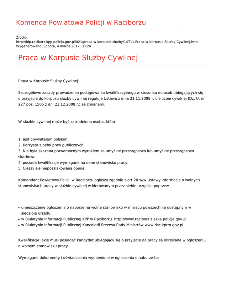 Komenda Powiatowa Policji w Raciborzu Źródło: http://bip.raciborz.kpp.policja.gov.pl/021/praca-w-korpusie-sluzby/14711,Praca-w-Korpusie-Sluzby-Cywilnej.html Wygenerowano: Sobota, 4 marca 2017, 03:24 Praca w Korpusie Służby Cywilnej Praca w Korpusie Służby Cywilnej Szczegółowe zasady prowadzenia postępowania kwalifikacyjnego w stosunku do osób ubiegających się o przyjęcie do korpusu służby cywilnej reguluje Ustawa z dnia 21.11.2008 r. o służbie cywilnej (Dz. U. nr 227 poz. 1505 z dn. 23.12.2008 r.) ze zmianami. W służbie cywilnej może być zatrudniona osoba, która: 1. Jest obywatelem polskim, 2. Korzysta z pełni praw publicznych, 3. Nie była skazana prawomocnym wyrokiem za umyślne przestępstwo lub umyślne przestępstwo skarbowe, 4. posiada kwalifikacje wymagane na dane stanowisko pracy, 5. Cieszy się nieposzlakowaną opinią. Komendant Powiatowy Policji w Raciborzu ogłasza zgodnie z art 28 w/w Ustawy informacje o wolnych stanowiskach pracy w służbie cywilnej w kierowanym przez siebie urzędzie poprzez: ● umieszczenie ogłoszenia o naborze na wolne stanowisko w miejscu powszechnie dostępnym w siedzibie urzędu, ● w Biuletynie Informacji Publicznej KPP w Raciborzu http://www.raciborz.slaska.policja.gov.pl ● w Biuletynie Informacji Publicznej Kancelarii Prezesa Rady Ministrów www.dsc.kprm.gov.pl Kwalifikacje jakie musi posiadać kandydat ubiegający się o przyjęcie do pracy są określane w ogłoszeniu o wolnym stanowisku pracy. Wymagane dokumenty i oświadczenia wymienione w ogłoszeniu o naborze to: List motywacyjny i życiorys List motywacyjny to dokument podpisany odręcznie z właściwą sobie treścią. Prosimy aby w liście motywacyjnym wymieniać pełną nazwę stanowiska pracy, o które się pan/pani ubiega. Życiorys prosimy sporządzać w formie eseju - odręcznie. Kopię dokumentów potwierdzających wykształcenie Dokumentem potwierdzającymwykształcenie jest kserokopia świadectwa szkolnego lub dyplom wyższej uczelni. Kopię dokumentów potwierdzających posiadanie obywatelstwa polskiego lub oświadczenie o posiadaniu obywatelstwa polskiego Dokumentem potwierdzającym posiadanie obywatelstwa polskiego jest dowód osobisty lub paszport. Kopię świadectw pracy z poprzednich miejsc pracy bądź innych dokumentów potwierdzających doświadczenie zawodowe Dokumenty potwierdzające doświadczenie zawodowe to, poza świadectwami pracy, także kserokopie umów cywilnoprawnych (umów zlecenie, umów o dzieło, itp.), kserokopie zaświadczeń z odbytego stażu, przygotowania zawodowego oraz innych form praktyki zawodowej. W przypadku prowadzenia działalności gospodarczej potwierdzeniem zdobytego doświadczenia może być wpis/wypis do/z ewidencji działalności gospodarczej. Kopie dokumentów potwierdzających inne kwalifikacje zawodowe Dokumenty potwierdzające posiadanie kwalifikacji zawodowych to poza dokumentami wymienionymi wyżej także kserokopie dokumentów świadczących o posiadaniu szczególnych uprawnień. Oświadczenia Każde oświadczenie powinno być opatrzone datą oraz uwiarygodnione odręcznym podpisem. LISTA BŁĘDÓW NAJCZĘŚCIEJ POPEŁNIANYCH PRZEZ KANDYDATÓW UBIEGAJĄCYCH SIĘ O ZATRUDNIENIE W KORPUSIE SŁUŻBY CYWILNEJ KOMENDY POWIATOWEJ POLICJI W RACIBORZU: - oferta pracy kandydata wpłynęła po terminie określonym w ogłoszeniu (decyduje data stępla pocztowego) - oferta nie spełnia wymogów formalnych, m.in.: jest niepodpisana, niekompletna (brakuje wymaganych w ogłoszeniu dokumentów lub brakuje własnoręcznie podpisanych świadczeń), - osoba zgłaszająca swoją kandydaturę do naboru nie posiada wymaganego w ogłoszeniu wykształcenia, - zgłoszona oferta pracy nie wskazuje konkretnego stanowiska i numeru ogłoszenia. Załączniki do strony 733.25 KB 11.39 KB Metryczka Data publikacji 17.09.2014 Data modyfikacji 25.11.2015 Rejestr zmian Podmiot udostępniający informację: Biuletyn Informacji Publicznej Osoba wytwarzająca/odpowiadająca za informację: Mirosław Szymański Osoba udostępniająca informację: Mirosław Szymański Oficer Prasowy Osoba modyfikująca informację: Mirosław Szymański