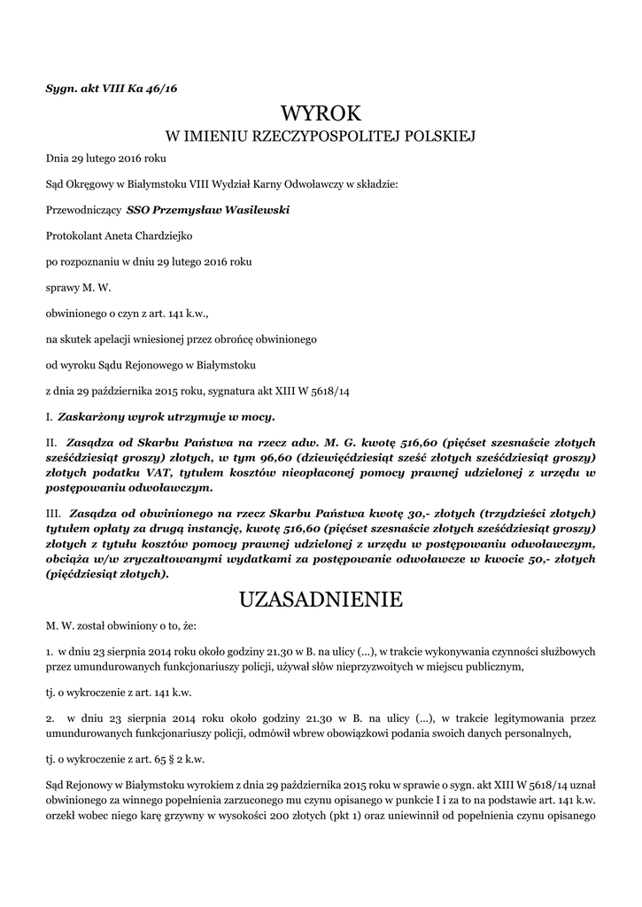 Sygn. akt VIII Ka 46/16 WYROK W IMIENIU RZECZYPOSPOLITEJ POLSKIEJ Dnia 29 lutego 2016 roku Sąd Okręgowy w Białymstoku VIII Wydział Karny Odwoławczy w składzie: Przewodniczący SSO Przemysław Wasilewski Protokolant Aneta Chardziejko po rozpoznaniu w dniu 29 lutego 2016 roku sprawy M. W. obwinionego o czyn z art. 141 k.w., na skutek apelacji wniesionej przez obrońcę obwinionego od wyroku Sądu Rejonowego w Białymstoku z dnia 29 października 2015 roku, sygnatura akt XIII W 5618/14 I. Zaskarżony wyrok utrzymuje w mocy. II. Zasądza od Skarbu Państwa na rzecz adw. M. G. kwotę 516,60 (pięćset szesnaście złotych sześćdziesiąt groszy) złotych, w tym 96,60 (dziewięćdziesiąt sześć złotych sześćdziesiąt groszy) złotych podatku VAT, tytułem kosztów nieopłaconej pomocy prawnej udzielonej z urzędu w postępowaniu odwoławczym. III. Zasądza od obwinionego na rzecz Skarbu Państwa kwotę 30,- złotych (trzydzieści złotych) tytułem opłaty za drugą instancję, kwotę 516,60 (pięćset szesnaście złotych sześćdziesiąt groszy) złotych z tytułu kosztów pomocy prawnej udzielonej z urzędu w postępowaniu odwoławczym, obciąża w/w zryczałtowanymi wydatkami za postępowanie odwoławcze w kwocie 50,- złotych (pięćdziesiąt złotych). UZASADNIENIE M. W. został obwiniony o to, że: 1. w dniu 23 sierpnia 2014 roku około godziny 21.30 w B. na ulicy (...), w trakcie wykonywania czynności służbowych przez umundurowanych funkcjonariuszy policji, używał słów nieprzyzwoitych w miejscu publicznym, tj. o wykroczenie z art. 141 k.w. 2. w dniu 23 sierpnia 2014 roku około godziny 21.30 w B. na ulicy (...), w trakcie legitymowania przez umundurowanych funkcjonariuszy policji, odmówił wbrew obowiązkowi podania swoich danych personalnych, tj. o wykroczenie z art. 65 § 2 k.w. Sąd Rejonowy w Białymstoku wyrokiem z dnia 29 października 2015 roku w sprawie o sygn. akt XIII W 5618/14 uznał obwinionego za winnego popełnienia zarzuconego mu czynu opisanego w punkcie I i za to na podstawie art. 141 k.w. orzekł wobec niego karę grzywny w wysokości 200 złotych (pkt 1) oraz uniewinnił od popełnienia czynu opisanego w punkcie II (pkt 2). Jednocześnie zasądzono od Skarbu Państwa na rzecz adw. M. G. kwotę 398,52 złotych tytułem obrony ustanowionej z urzędu w tym kwotę 74,52 zł tytułem podatku VAT (pkt 3), kosztami procesu w zakresie zarzutu z punktu II obciążono Skarb Państwa (pkt 4) oraz zasądzono od obwinionego na rzecz Skarbu Państwa kwotę 100 złotych tytułem zryczałtowanych wydatków postępowania oraz kwotę 30 złotych tytułem opłaty (pkt 5). Powyższy wyrok na zasadzie art. 109 § 2 k.p.w. w zw. z art. 425 § 1 i 2 k.p.k. i art. 444 § 1 k.p.k. zaskarżył obrońca obwinionego w zakresie pkt 1 i pkt 5 zarzucając orzeczeniu na podstawie art. 427 § 2 k.p.k. i art. 438 pkt 2, 3 i 4 k.p.k.: 1. obrazę przepisów postępowania, mającą wpływ na treść orzeczenia, a w szczególności art. 4 k.p.k. i art. 5 § 2 k.p.k. oraz art. 7 k.p.k. w zw. z art. 8 k.p.w. poprzez przekroczenie zasady swobodnej oceny dowodów oraz rozstrzygnięcie niedających się usunąć wątpliwości na niekorzyść obwinionego, a mianowicie: • przyjęcie, że zachowanie obwinionego wyczerpało znamiona czynu statuowanego w art. 141 k.w. motywując, iż wszyscy znajdujący się na miejscu oględzin funkcjonariusze Policji wskazali w sposób jednoznaczny, że obwiniony używał słów nieprzyzwoitych wobec jednoczesnego stwierdzenia, że wprawdzie nie pamiętali dokładnie używanych przez obwinionego słów, jednakże byli pewni co do ich znaczenia, nieprzyzwoitości, • uznanie zeznań funkcjonariuszy D. D. i K. G. za w pełni wiarygodne przy symultanicznym ustaleniu, że funkcjonariusze ci posiadali jedynie wiedzę na temat tego, iż obwiniony utrudniał czynności na miejscu zdarzenia i używał nieprzyzwoitych słów. Nie posiadali oni szczegółowej wiedzy o tym, co miało miejsce w dniu 23 sierpnia 2014 roku około godz. 21:30 w B. na ulicy (...), gdyż nie uczestniczyli w tych czynnościach, a zatem nie byli naocznymi świadkami zdarzenia, co skutkowało przyjęciem, że zarówno wina jak i okoliczności popełnienia przez obwinionego czynu z art. 141 k.w. nie budzą wątpliwości, 2. błąd w ustaleniach faktycznych przyjętych za podstawę orzeczenia, mający wpływ na jego treść, a polegający na przyjęciu, że zgromadzony w sprawie materiał dowodowy dał podstawy do przyjęcia, że obwiniony dopuścił się zarzucanego mu czynu polegającego na używaniu nieprzyzwoitych słów w miejscu publicznym, podczas gdy dla stwierdzenia, że wypowiadane przez obwinionego słowa należą do kategorii nieprzyzwoitych niezbędne jest ich zidentyfikowanie, co w niniejszej sprawie nie nastąpiło. Ewentualnie: 3. rażącą niewspółmierność kary poprzez orzeczenie wobec obwinionego za czyn z art. 141 k.w. kary grzywny w wysokości 200 złotych, (mają alternatywnie do wyboru karę nagany), wobec jednoczesnego zaniechania zidentyfikowania rzekomo wypowiedzianych przez obwinionego nieprzyzwoitych słów, w sytuacji gdy wysokość kary grzywny, mając na uwadze status materialny obwinionego jawi się jako wygórowana i nieadekwatna do sytuacji osobistej, rodzinnej i majątkowej. Powołując się na powyższe zarzuty, apelujący wniósł o zmianę zaskarżonego wyroku w pkt. 1 poprzez uniewinnienie obwinionego od zarzucanego mu czynu oraz zasądzenie kosztów obrony obwinionego z urzędu, które nie zostały zapłacone w całości, ani w części. Sąd Okręgowy zważył, co następuje: Apelacja obrońcy obwinionego nie zasługiwała na uwzględnienie. Na wstępie podnieść należy, że błędne jest jednoczesne zarzucanie obrazy art. 5 § 2 k.p.k. i art. 7 k.p.k. Z naruszeniem zasady in dubio pro reo mamy do czynienia wówczas, gdy orzekający w sprawie sąd rzeczywiście powziął wątpliwości co do treści ustaleń faktycznych lub wykładni prawa lub też w