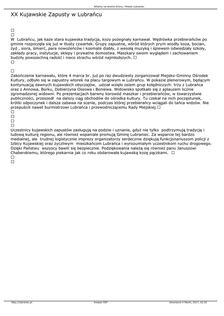 Witamy na stronie Gminy i Miasta Lubraniec XX Kujawskie Zapusty w Lubrańcu W Lubrańcu, jak każe stara kujawska tradycja, kozy pożegnały karnawał. Wędrówka przebierańców po gminie rozpoczęła się już w tłusty czwartek. Grupy zapustne, wśród których prym wiodły koza, bocian, żyd , siora, śmierć, para nowożeńców i kosmate diabły, z wesołą muzyką i śpiewem odwiedzały szkoły, zakłady pracy, instytucje, sklepy i prywatne domostwa. Maszkary swoim wyglądem i zachowaniem budziły powszechną radość i nieco strachu wśród najmłodszych. Zakończenie karnawału, które 4 marca br. już po raz dwudziesty zorganizował Miejsko-Gminny Ośrodek Kultury, odbyło się w zapustny wtorek na placu targowym w Lubrańcu. W pokazie plenerowym, będącym kontynuacją dawnych kujawskich obyczajów, udział wzięło osiem grup kolędniczych: trzy z Lubrańca oraz z Annowa, Borku, Dobierzyna Ossowa i Boniewa. Widowisko spotkało się z aplauzem licznie zgromadzonej widowni. Po prezentacjach barwny korowód maszkar i przebierańców, w towarzystwie publiczności, przeszedł na dalszy ciąg obchodów do ośrodka kultury. Tu czekał na nich poczęstunek, krótki odpoczynek i dalsza zabawa na scenie, podczas której przebierańcy wciągali do tańca widzów. Nie przepuścili nawet burmistrzowi Lubrańca i przewodniczącemu Rady Miejskiej. Uczestnicy kujawskich zapustów zasługują na podziw i uznanie, gdyż nie tylko podtrzymują tradycję i ludową kulturę regionu, ale również wspaniale promują Gminę Lubraniec. Za wsparcie tej bardzo medialnej, ale trudnej logistycznie imprezy organizatorzy serdecznie dziękują funkcjonariuszom policji z Izbicy Kujawskiej oraz życzliwym mieszkańcom Lubrańca i wyrozumiałym uczestnikom ruchu drogowego. Dzięki Państwu wszyscy bawili się bezpiecznie. Podziękowania należą się również panu Januszowi Chaberskiemu, którego piekarnia jak co roku obdarowała kujawską kozę pączkami. http://lubraniec.pl Kreator PDF Utworzono 4 March, 2017, 02:25