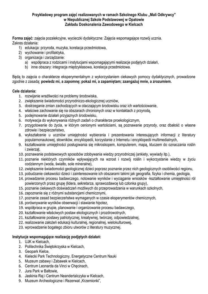 Przykładowy program zajęć realizowanych w ramach Szkolnego Klubu „Mali Odkrywcy” w Niepublicznej Szkole Podstawowej w Opatowie Zakładu Doskonalenia Zawodowego w Kielcach Forma zajęć: zajęcia pozalekcyjne, wycieczki dydaktyczne: Zajęcia wspomagające rozwój ucznia. Zakres działania: 1) edukacja: przyroda, muzyka, korelacja przedmiotowa, 2) wychowanie i profilaktyka, 3) organizacja i zarządzanie: a) współpraca z rodzicami i instytucjami wspomagającymi realizacje podjętych działań, b) inne obszary: integracja międzyklasowa, korelacja przedmiotowa. Będą to zajęcia o charakterze eksperymentalnym z wykorzystaniem ciekawych pomocy dydaktycznych, prowadzone zgodnie z zasadą: powiedz mi, a zapomnę; pokaż mi, a zapamiętam; zaangażuj mnie, a zrozumiem. Cele działania: 1. rozwijanie wrażliwości na problemy środowiska, 2. zwiększenie świadomości przyrodniczo-ekologicznej uczniów, 3. dostrzeganie zmian zachodzących w otaczającym środowisku oraz ich wartościowanie, 4. właściwe zachowanie się na obszarach chronionych oraz w kontaktach z przyrodą, 5. podejmowanie działań przyjaznych środowisku, 6. motywacja do wykonywania różnych zadań o charakterze proekologicznym, 7. przygotowanie do życia, w którym cenionymi wartościami, są poznawanie przyrody, oraz dbałość o własne zdrowie i bezpieczeństwo, 8. wykształcenie u uczniów umiejętności wybierania i prezentowania interesujących informacji z literatury popularnonaukowej, słowników, encyklopedii, korzystanie z Internetu i encyklopedii multimedialnych, 9. kształtowanie umiejętności posługiwania się mikroskopem, komputerem, mapą, kluczem do oznaczania roślin i zwierząt, 10. poznawanie podstawowych sposobów zdobywania wiedzy przyrodniczej (ankiety, wywiady itp.), 11. poznanie niektórych czynników wpływających na wzrost i rozwój roślin i wykorzystanie wiedzy w życiu codziennym (woda, światło, sole mineralne), 12. zwiększenie świadomości geologicznej dzieci poprzez poznanie przez nich geologicznych osobliwości regionu, 13. pobudzanie ciekawości dzieci i zainteresowanie ich obszarami takimi jak geografia, fizyka i chemia, geologia, 14. prowadzenie procesu badawczego, notowanie wyników i wyciąganie wniosków -kształtowanie umiejętności ról powierzonych przez grupę (lidera, sekretarza, sprawozdawcę lub członka grupy), 15. poznanie ciekawych doświadczeń możliwych do przeprowadzenia w warunkach szkolnych, 16. zapoznanie się z różnymi substancjami chemicznymi, 17. poznanie zasad bezpieczeństwa wymaganych w czasie eksperymentów chemicznych, 18. porównywanie wyników obserwacji i stawianie hipotez, 19. współpraca w grupie, planowanie i organizowanie procesu badawczego, 20. kształtowanie właściwych postaw ekologicznych i prozdrowotnych, 21. kształtowanie postawy patriotycznej, kreatywnej, twórczej, odpowiedzialnej, 22. realizowanie założeń edukacji kulturalnej, regionalnej, wielokulturowej, 23. wprowadzenie bogatego zbioru utworów z literatury muzycznej. Instytucje wspomagające realizację podjętych działań: 1. UJK w Kielcach, 2. Politechnika Świętokrzyska w Kielcach, 3. Geopark Kielce, 4. Kielecki Park Technologiczny, Energetyczne Centrum Nauki 5. Muzeum zabawy i Zabawek w Kielcach, 6. Centrum Leonarda da Vinci w Chęcinach, 7. Jura Park w Bałtowie, 8. Jaskinia Raj i Centrum Neandertalczyka w Kielcach, 9. Muzeum Archeologiczne i Rezerwat „Krzemionki”, 10. Filharmonia Kielecka, 11. Niepubliczna Szkoła Muzyczna I stopnia w Kielcach, 12. Kielecki Teatr Tańca, 13. Centrum Nauki Kopernik w Warszawie. Przykładowe tematy zajęć dla Klubu Małych Odkrywców. 24 spotkania w ciągu 3 lat; 8 spotkań w roku (1 raz na miesiąc x 2 godz. lekcyjne). Lp. Temat zajęć 1 Ziemia nasze bogactwo Woda jest życiem 2 Ziemia nasze bogactwo Odkrywamy nasionka 3 Ziemia nasze bogactwo Odkrywamy kwiaty 4 5 6 Ziemia nasze bogactwo Ekoludki Ziemia nasze bogactwo Recykling Chemia w domu Czy każdy cukier ma słodki smak? 7 Chemia w domu W zdrowym ciele zdrowy duch 8 Chemia w domu Mydło wszystko umyje… 9 Fizyka dla smyka Tajemnice optyki 10 Fizyka dla smyka Zabawa z dźwiękiem 11 Fizyka dla smyka Magnetyzm w pigułce Zagadnienia Dzieci wraz z trenerem odparowują wodę i skraplają ją na lusterku. W ten sposób Dzieci dowiadują się dlaczego pada deszcz. Wkładając białe kwiatki i seler naciowy do wody zabarwionej na niebiesko Dzieci odkrywają sposób w jaki rośliny pobierają wodę z ziemi. Dzieci dowiadują się o różnych nasionkach i w jaki sposób one uczestniczą w naszym życiu. Dzieci mielą ziarna samodzielnie robią mąkę białą i razową. Sieją również rzeżuchę i fasolkę i obserwują proces ich wzrostu. „KWIATY”, dzieci oglądają kwiat przez szkło powiększające, poznają jak wygląda znamię i pylniki i do czego służą. Rysują swoje modele kwiatów. Poprzez zabawę w pszczółki poznają proces zapylania (Dzieci same przygotowują nektar i pyłek) oraz poznają życie pszczół w ulu. Robią plaster miodu, dowiadują się o królowej, robotnicach i trutniach. Zwiększenie świadomości uczniów nt. zagrożeń środowiska odpadami. Udział w „Ekologicznym spacerze”, w akcji ,,Sprzątanie Świata''. Uczeń rozumie potrzebę dbania o środowisko poprzez ponowne wykorzystanie odpadów i ich segregację. Dziecko zapozna się z właściwościami fizycznymi i chemicznymi cukrów i podziałem. Dzieci będą wykonywać proste doświadczenia tj. spalanie cukrów, wykrywanie skrobi. Dzieci poznają rolę witamin w diecie człowieka, jak ważne jest jedzenie owoców i warzyw. Dzieci uczą się komponować zdrowy jadłospis oraz przygotowywać pełnowartościowe posiłki. Odkrywają, co oznaczają różne dziwne nazwy na etykietach oraz opakowaniach produktów żywnościowych. Dzieci dowiedzą się jak zrobić mydło oraz poznają właściwości pieniące mydła. Dzieci na zajęciach dowiedzą się m.in.: 1) skąd się bierze światło? 