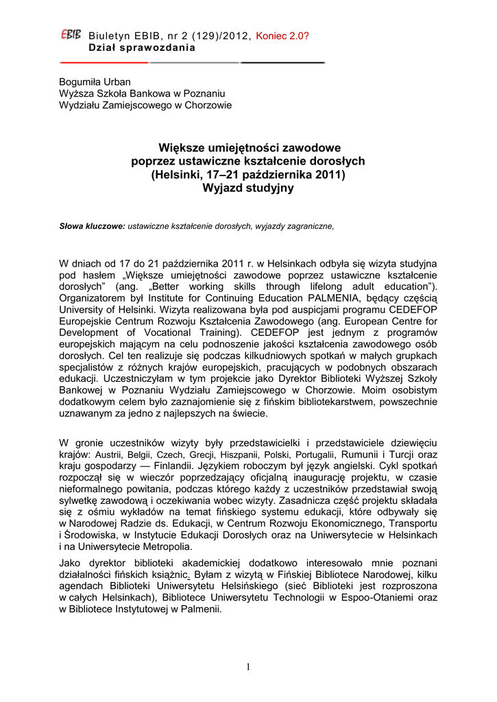 Biuletyn EBIB, nr 2 (129)/2012, Koniec 2.0? Dział spraw ozdania Bogumiła Urban Wyższa Szkoła Bankowa w Poznaniu Wydziału Zamiejscowego w Chorzowie Większe umiejętności zawodowe poprzez ustawiczne kształcenie dorosłych (Helsinki, 17–21 października 2011) Wyjazd studyjny Słowa kluczowe: ustawiczne kształcenie dorosłych, wyjazdy zagraniczne, W dniach od 17 do 21 października 2011 r. w Helsinkach odbyła się wizyta studyjna pod hasłem „Większe umiejętności zawodowe poprzez ustawiczne kształcenie dorosłych” (ang. „Better working skills through lifelong adult education”). Organizatorem był Institute for Continuing Education PALMENIA, będący częścią University of Helsinki. Wizyta realizowana była pod auspicjami programu CEDEFOP Europejskie Centrum Rozwoju Kształcenia Zawodowego (ang. European Centre for Development of Vocational Training). CEDEFOP jest jednym z programów europejskich mającym na celu podnoszenie jakości kształcenia zawodowego osób dorosłych. Cel ten realizuje się podczas kilkudniowych spotkań w małych grupkach specjalistów z różnych krajów europejskich, pracujących w podobnych obszarach edukacji. Uczestniczyłam w tym projekcie jako Dyrektor Biblioteki Wyższej Szkoły Bankowej w Poznaniu Wydziału Zamiejscowego w Chorzowie. Moim osobistym dodatkowym celem było zaznajomienie się z fińskim bibliotekarstwem, powszechnie uznawanym za jedno z najlepszych na świecie. W gronie uczestników wizyty były przedstawicielki i przedstawiciele dziewięciu krajów: Austrii, Belgii, Czech, Grecji, Hiszpanii, Polski, Portugalii, Rumunii i Turcji oraz kraju gospodarzy — Finlandii. Językiem roboczym był język angielski. Cykl spotkań rozpoczął się w wieczór poprzedzający oficjalną inaugurację projektu, w czasie nieformalnego powitania, podczas którego każdy z uczestników przedstawiał swoją sylwetkę zawodową i oczekiwania wobec wizyty. Zasadnicza część projektu składała się z ośmiu wykładów na temat fińskiego systemu edukacji, które odbywały się w Narodowej Radzie ds. Edukacji, w Centrum Rozwoju Ekonomicznego, Transportu i Środowiska, w Instytucie Edukacji Dorosłych oraz na Uniwersytecie w Helsinkach i na Uniwersytecie Metropolia. Jako dyrektor biblioteki akademickiej dodatkowo interesowało mnie poznani działalności fińskich książnic. Byłam z wizytą w Fińskiej Bibliotece Narodowej, kilku agendach Biblioteki Uniwersytetu Helsińskiego (sieć Biblioteki jest rozproszona w całych Helsinkach), Bibliotece Uniwersytetu Technologii w Espoo-Otaniemi oraz w Bibliotece Instytutowej w Palmenii. 1 Biuletyn EBIB, nr 2 (129)/2012, Koniec 2.0? Dział spraw ozdania W trakcie wizyty studyjnej uczestnicy prezentowali narodowe systemy edukacji dorosłych. Dzięki temu poznaliśmy podobieństwa i różnice w podejściu do kształcenia dorosłych w różnych krajach europejskich, spieraliśmy się o priorytety w edukacji, narzędzia i metody pracy, dzieliliśmy się dobrymi praktykami. Omówiliśmy także wiele trudności występujących w poszczególnych krajach, a wpływających na sytuację w edukacji: w Grecji są to problemy ekonomiczne, w Turcji i Portugalii — problemy z imigrantami, w Belgii — problemy z utrzymaniem jedności kraju, w Polsce, Finlandii i Czechach — niż demograficzny, a w Hiszpanii — wysoki poziom bezrobocia. Moje szczególne zainteresowanie budziła kwestia, w jaki sposób w każdym z tych krajów biblioteki akademickie realizują swoje zadania, jak rozwijają się zasoby i usługi biblioteczne oraz na jakie kłopoty natykają się bibliotekarze w trudnych czasach kryzysu ekonomicznego. Ważnym dla mnie aspektem było również podnoszenie kompetencji zawodowych bibliotekarzy. W trakcie projektu odbywały się rozmowy na tematy omawiane podczas wykładów i prezentacji. Wśród wszystkich uczestników spotkania dominowało przekonanie, że fiński system edukacji nie ma sobie równych wśród państw uczestników projektu. W Finlandii 49% społeczeństwa ma wyższe wykształcenie. Kraj ten eksportuje na cały świat myśl techniczną i edukację na najwyższym poziomie. Źródłem fińskiego sukcesu jest nie tylko bezpłatność usług edukacyjnych na wszystkich szczeblach (od opieki żłobkowej i przedszkolnej po uniwersytety) oraz niewielka odpłatność kursów podnoszących kwalifikacje, przygotowujących do zawodu lub hobbistycznych, ale też mentalność społeczeństwa fińskiego, upatrującego w edukacji nie tylko szanse na lepszą pracę i płacę, ale traktującym wiedzę jako wartość autoteliczną. Program projektu „Większe umiejętności zawodowe poprzez ustawiczne kształcenie dorosłych” uzupełniły wizyty w Muzeum Narodowym oraz w Operze Narodowej w Helsinkach. Dzięki temu członkowie projektu mieli okazję poznać kulturę Finlandii. Ogólne wnioski z prac grupy podczas projektu: 1. Fiński system kształcenia dorosłych jako element całościowego systemu edukacji jest jednym z najlepszych na świecie, najefektywniej przygotowuje do pracy i życia we współczesnym społeczeństwie. 2. Finlandia dzięki wysokiemu wskaźnikowi PKB per capita może sobie pozwolić na bezpłatną lub płatną w bardzo niewielkim stopniu edukację na wszystkich poziomach. Niestety, kraje o niższym dochodzie narodowym nie mogą powielić tych rozwiązań. 3. Źródłem sukcesu Finlandii w zakresie kształcenia jest nie tylko bezpłatność usług edukacyjnych, lecz również mentalność Finów, którzy w ustawicznej nauce i kształceniu realizują swój model życiowy, traktując edukację nie tylko jako drogę do sukcesu zawodowego, awansu i wysokich uposażeń, ale także jako drogę do lepszego, bardziej świadomego życia osobistego w rodzinie. 4. Znaczenie systemu edukacji dorosłych w Europie będzie ustawicznie rosło. Przyczynia się do tego kilka czynników: starzenie się wielu europejskich społeczeństw, bezrobocie w niektórych profesjach, brak wykwalifikowanej kadry