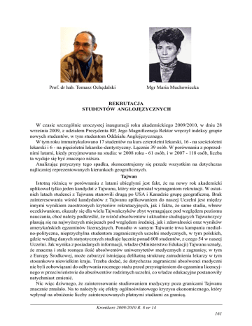 Prof. dr hab. Tomasz Ochędalski Mgr Maria Muchowiecka Rekrutacja Studentów Anglojęzycznych W czasie szczególnie uroczystej inauguracji roku akademickiego 2009/2010, w dniu 28 września 2009, z udziałem Prezydenta RP, Jego Magnificencja Rektor wręczył indeksy grupie nowych studentów, w tym studentom Oddziału Anglojęzycznego. W tym roku immatrykulowano 17 studentów na kurs czteroletni lekarski, 16 - na sześcioletni lekarski i 6 - na pięcioletni lekarsko-dentystyczny. Łącznie 39 osób. W porównaniu z poprzednimi latami, kiedy przyjmowano na studia: w 2008 roku - 61 osób, i w 2007 - 118 osób, liczba ta wydaje się być znacząco niższa. Analizując przyczyny tego spadku, skoncentrujemy się przede wszystkim na dotychczas najliczniej reprezentowanych kierunkach geograficznych. Tajwan Istotną różnicą w porównaniu z latami ubiegłymi jest fakt, że na nowy rok akademicki aplikował tylko jeden kandydat z Tajwanu, który nie sprostał wymaganiom rekrutacji. W ostatnich latach studenci z Tajwanu stanowili drugą po USA i Kanadzie grupę geograficzną. Brak zainteresowania wśród kandydatów z Tajwanu aplikowaniem do naszej Uczelni jest między innymi wynikiem zaostrzonych kryteriów rekrutacyjnych, jak i faktu, że same studia, wbrew oczekiwaniom, okazały się dla wielu Tajwańczyków zbyt wymagające pod względem poziomu nauczania, choć należy podkreślić, że wśród absolwentów i aktualnie studiujących Tajwańczycy plasują się na najwyższych miejscach pod względem średniej, jak i zdawalności oraz wyników amerykańskich egzaminów licencyjnych. Ponadto w samym Tajwanie trwa kampania medialno-polityczna, nieprzychylna studentom zagranicznych uczelni medycznych, w tym polskich, gdzie według danych statystycznych studiuje łącznie ponad 600 studentów, z czego 54 w naszej Uczelni. Jak wynika z posiadanych informacji, władze (Ministerstwo Edukacji) Tajwanu uznały, że znaczna i stale rosnąca ilość absolwentów uniwersytetów medycznych z zagranicy, w tym z Europy Środkowej, może zaburzyć istniejącą delikatną strukturę zatrudnienia lekarzy w tym stosunkowo niewielkim kraju. Trzeba dodać, że dotychczas zagraniczni absolwenci medyczni nie byli zobowiązani do odbywania rocznego stażu przed przystąpieniem do egzaminu licencyjnego w przeciwieństwie do absolwentów rodzimych uczelni, co władze edukacyjne postanowiły natychmiast zmienić. Nic więc dziwnego, że zainteresowanie studiowaniem medycyny poza granicami Tajwanu znacznie zmalało. Na to nałożyły się efekty ogólnoświatowego kryzysu ekonomicznego, który wpłynął na obniżenie liczby zainteresowanych płatnymi studiami za granicą. Kronikarz 2009/2010 R. 8 nr 14 161 USA, Kanada Zapaść systemu bankowego w Ameryce Płn. szczególnie zauważalnie wpłynęła na zmniejszenie się ilości studentów z USA i Kanady, którzy napotkali trudności z otrzymaniem pożyczek umożliwiających studiowanie, dotychczas dość łatwo dostępnych. Do przyczyn subiektywnych tego spadku należy zaliczyć trudności negocjacyjne w sprawach umowy o współpracę z firmą AIM, a także wspomniane już, zaostrzone kryteria rekrutacyjne, co spowodowało, że AIM pomimo wcześniejszych deklaracji nie była w stanie zaproponować odpowiedniej liczby kandydatów spełniających kryteria niezbędne do rozpoczęcia studiów w naszym Uniwersytecie. Uczelnia jest w trakcie rozwiązywania umowy i poszukiwania nowego reprezentanta na tym rynku rekrutacji. W tym roku Komisja Rekrutacyjna przyjęła rekordową liczbę 185 aplikacji od potencjalnych studentów. W wyniku przeprowadzonej starannej selekcji zgodnie z ustalonymi procedurami odrzucono 122 aplikacji, jako nie spełniających naszych warunków. W 24 przypadkach zaakceptowani kandydaci sami zrezygnowali ze studiowania w naszym Uniwersytecie z powodu braku środków finansowych lub wycofania się sponsorów, co jest odbiciem wcześniej wspomnianej sytuacji ekonomicznej w wielu krajach. Pozytywnym aspektem rekrutacji w tym roku jest duże zainteresowanie, jakie wykazali studenci z krajów europejskich, a zwłaszcza z Hiszpanii. Kraj ten, wraz z Norwegią, z której pochodzi 39 naszych studentów to istotne kierunki naszej przyszłej ekspansji. W związku z akredytacją naszej edukacji medycznej w Malezji naukę rozpoczęła czteroosobowa osobowa grupa studentek z tego kraju. Uwagi końcowe, wnioski Doświadczenia lat poprzednich przekonały nas, że tylko przyjmowanie studentów o odpowiednim poziomie wiedzy gwarantuje możliwość bezproblemowego ukończenia studiów, ale także reprezentowania przez absolwentów naszej Uczelni odpowiedniego poziomu wykształcenia. Ponadto, w naszej aktualnej sytuacji przyjmowanie zbyt dużej liczby studentów nie zapewnia odpowiedniego poziomu edukacji, gdyż borykamy się m. in. z zagęszczeniem studentów, szczególnie na oddziałach klinicznych i brakiem dostatecznej ilości kadry anglojęzycznej, co ma ulec zmianie po zrealizowaniu projektu szkoleń w ramach zorganizowanych nieodpłatnie lektoratów języka angielskiego. Podobnie wydaje się, że zwiększenie liczby studentów na kierunku dentystycznym w chwili obecnej nie jest możliwe z powodu braku infrastruktury niezbędnej do ich szkolenia. Rozwiązaniem problemu może być dopiero przeniesienie klinik do budynku Centrum Kliniczno-Dydaktycznego. Pozwoli to na podniesienie poziomu kształcenia, dzięki czemu poziom wiedzy teoretycznej i fachowej naszych absolwentów będzie dla naszej Uczelni znakomitą wizytówką i zachętą dla innych do studiowania na naszym Uniwersytecie. Działając na rzecz systematycznej poprawy jakości naszej edukacji, planujemy w najbliższym czasie podjąć intensywne kroki na rzecz lepszej rozpoznawalności Uczelni i kryteriów jej oceny na zewnątrz poprzez wszczęcie procedur akredytacyjnych w stanie Nowy Jork, a w dalszej kolejności w stanie Kalifornia. Poprawa spraw bytowych, w tym szczególnie bazy mieszkaniowej w postaci nowego 