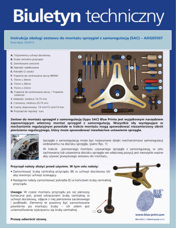 Instrukcja obsługi zestawu do montażu sprzęgieł z samoregulacją (SAC) – ADG05507 Data edycji: 02/2013 A. Trójramienny uchwyt dociskowy B. Śruba centralna przyrządu C D F1 C. Gwintowane sworznie F2 D. Nakrętki radełkowane E E. Pokrętło (2 sztuki) F3 F. Trzpienie do centrowania tarczy (BMW) 1. 15mm x 34mm B G2 2. 15mm x 28mm 3. 15mm x 23mm G1 G. Trzpienie do centrowania tarczy / Trzpienie ustawcze A 1. Niebieski: średnica 19,75 mm H 2. Czerwony: średnica 20,75 mm 3. Czarny stopniowany: 19 mm/15 mm/14 mm H. Przyrząd do regulacji luzu G3 Zestaw do montażu sprzęgieł z samoregulacją (typu SAC) Blue Printa jest wyjątkowym narzędziem zapewniającym właściwy montaż sprzęgieł z samoregulacją. Wszystkie siły występujące w mechanizmie regulacyjnym powstałe w trakcie montażu mogą spowodować niezamierzony obrót pierścienia regulacyjnego, który może spowodować niewłaściwe ustawienie sprzęgła. Rys. 1 Sprzęgło z samoregulacją może być rozpoznane dzięki mechanizmowi samoregulacji widzianemu na docisku sprzęgła. (patrz Rys. 1) W trakcie ponownego montażu używanego sprzęgła z samoregulacją, w celu zachowania lub ustawienia docisku sprzęgła we właściwej pozycji jest niezwykle ważne aby używać powyższego zestawu do montażu, Przyrząd należy złożyć przed użyciem. W tym celu należy: • Zamontować śrubę centralną przyrządu (B) w uchwyt dociskowy (A) aby stworzyć uchwyt ściskający. • Następnie należy zamontować pokrętła (E) w końcówki śruby centralnej przyrządu. Uwaga: W czasie montażu przyrządu po raz pierwszy konieczne jest, przed wkręceniem śruby centralnej w uchwyt dociskowy, zdjęcie z niej pierścienia zaciskowego i podkładki. Elementy te powinny być zamontowane powtórnie po montażu śruby – ich celem jest uniemożliwienie wykręceniu się śruby centralnej. Proszę odwrócić stronę. Montaż nowego sprzęgła z układem samoregulacji (typu SAC): Wymontować skrzynię biegów. Odkręcić stare sprzęgło i usunąć stary docisk oraz tarczę sprzęgła. Sprawdzić czy koło zamachowe jest w dobrym stanie. Jeżeli jest to koło dwumasowe zalecane jest wtedy sprawdzenie czy luz koła zgodny jest ze specyfikacją fabryczną. •Należy dobrać z zestawu Blue Printa odpowiedni do tarczy sprzęgła typ trzpienia centrującego i za jego pomocą wycentrować nową tarczę w kole zamachowym. Rys. 2 •Po wycentrowaniu tarczy sprzęgła, należy założyć nowy docisk na koło zamachowe i zamocować go używając trzech gwintowanych sworzni (C) o właściwie dobranym gwincie. Sworznie te należy dokręcić palcami z siłą odpowiednią do utrzymania tarczy sprzęgła we właściwej pozycji. Rys. 3 Ponadto, należy wkręć palcami trzy oryginalne śruby mocujące docisk w trzy pozostałe otwory mocujące. (patrz Rys. 2) • Założyć zmontowany przyrząd specjalny na trzy gwintowane sworznie i zabezpieczyć go używając trzech radełkowanych nakrętek (D). (patrz Rys. 3) • Pokręcając pokrętłem zgodnie z ruchem wskazówek zegara należy wkręcić śrubę w kierunku docisku do momentu ściśnięcia sprężyny docisku tak aby jego obudowa zetknęła się z kołem zamachowym. (patrz Rys. 4) Rys. 4 przed – szczelina po – brak szczeliny •Dociągnąć trzy śruby mocujące docisk sprzęgła momentem zalecanym przez producenta pojazdu. (patrz Rys. 5) Rys. 5 •Odkręcić śrubę ściskającą przeciwnie do ruchu wskazówek zegara, tak aby zwolnić nacisk na sprężynę dociskową sprzęgła. Następnie odkręcić radełkowane nakrętki mocujące, zdjąć przyrząd i wykręcić sworznie. •W miejsce po sworzniach wkręcić pozostałe trzy śruby mocujące docisk i dokręcić je momentem zalecanym przez producenta pojazdu. • Wyjąć trzpień centrujący tarczę sprzęgła. Ważne informacje : Wszystkie techniczne informacje podawane są w dobrej wierze. Blue Print zawsze rekomenduje aby obsługa i diagnostyka pojazdów była prowadzona tylko przez odpowiednio wykwalifikowane osoby przy użyciu właściwych narzędzi, w bezpiecznym otoczeniu dobrze wyposażonego warsztatu. Blue Print i jego klienci nie mogą odpowiadać za złą interpretację powyższych informacji technicznych. Przedstawione zdjęcia są zamieszczone tylko w celach ilustracyjnych i mogą nie przedstawiać rzeczywistych produktów i pojazdów opisanych powyżej. Demontaż i montaż tego samego sprzęgła z samoregulacją: • Odkręcić trzy śruby mocujące docisk sprzęgła (rozstawione o 120°) • W miejsce śrub wkręcić odpowiednio dobrane sworznie gwintowane (C). Dokręcić sworznie palcami. • Z zestawu Blue Printa dobrać odpowiedni trzpień centrujący tarczy sprzęgła i wsunąć go w tarczę sprzęgła. • Założyć zmontowany przyrząd specjalny na trzy gwintowane sworznie i zabezpieczyć go używając trzech radełkowanych nakrętek (D). • Pokręcając pokrętłem zgodnie z ruchem wskazówek zegara wkręcić śrubę centralną w kierunku docisku, tak aby ścisnąć sprężynę sprzęgła do momentu gdy zostanie zwolniony nacisk na tarczę sprzęgła i będzie się ona swobodnie obracać. To da nam pewność, że pierścień regulacyjny sprzęgła jest we właściwej pozycji do powtórnego montażu. • Odkręcić trzy pozostałe śruby mocujące docisk sprzęgła. • Odkręcić śrubę ściskającą przeciwnie do ruchu wskazówek zegara, tak aby zwolnić nacisk na sprężynę dociskową sprzęgła. Następnie odkręcić redełkowane nakrętki mocujące, zdjąć uchwyt i wykręcić sworznie. • Wymontować zespół sprzęgła i trzpień centrujący zwracając uwagę na to, aby nie upuścić czy uderzyć docisku sprzęgła gdyż może to doprowadzić do zmiany jego regulacji. • Jeżeli założone jest dwumasowe koło zamachowe zalecane jest sprawdzenie czy luz koła zgodny jest ze specyfikacją fabryczną. UWAGA: Kiedy zakładamy ponownie sprzęgło z samoregulacją może być konieczne powtórne przeprowadzenie regulacj