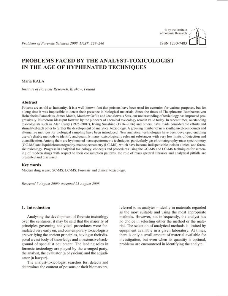 © by the Institute of Forensic Research ISSN 1230-7483 Problems of Forensic Sciences 2008, LXXV, 228–246 PROBLEMS FACED BY THE ANALYST-TOXICOLOGIST IN THE AGE OF HYPHENATED TECHNIQUES Maria KA£A Institute of Forensic Research, Krakow, Poland Abstract Poisons are as old as humanity. It is a well-known fact that poisons have been used for centuries for various purposes, but for a long time it was impossible to detect their presence in biological materials. Since the times of Theophrastus Bombastus von Hohenheim Paracelsus, James Marsh, Matthew Orfila and Jean Servais Stas, our understanding of toxicology has improved progressively. Numerous ideas put forward by the pioneers of chemical toxicology remain valid today. In recent times, outstanding toxicologists such as Alan Curry (1925–2007), Irving Sunshine (1916–2006) and others, have made considerable efforts and stimulated each other to further the development of analytical toxicology. A growing number of new synthesised compounds and alternative matrices for biological sampling have been introduced. New analytical technologies have been developed enabling use of reliable methods to identify and quantify many toxicologically relevant substances with very low limits of detection and quantification. Among them are hyphenated mass spectrometric techniques, particularly gas chromatography-mass spectrometry (GC-MS) and liquid chromatography-mass spectrometry (LC-MS), which have become indispensable tools in clinical and forensic toxicology. Progress in analytical toxicology, concepts and procedures using the GC-MS and LC-MS techniques for screening of modern drugs with respect to their consumption patterns, the role of mass spectral libraries and analytical pitfalls are presented and discussed. Key words Modern drug scene; GC-MS; LC-MS; Forensic and clinical toxicology. Received 7 August 2008; accepted 25 August 2008 1. Introduction Analysing the development of forensic toxicology over the centuries, it may be said that the majority of principles governing analytical procedures were formulated very early on, and contemporary toxicologists are verifying the ancient principles, having at their disposal a vast body of knowledge and an extensive background of specialist equipment. The leading roles in forensic toxicology are played by the wronged party, the analyst, the evaluator (a physician) and the adjudicator (a lawyer). The analyst-toxicologist searches for, detects and determines the content of poisons or their biomarkers, referred to as analytes – ideally in materials regarded as the most suitable and using the most appropriate methods. However, not infrequently, the analyst has no choice in selecting either the method or the material. The selection of analytical methods is limited by equipment available in a given laboratory. At times, there is only a small amount of material available for investigation, but even when its quantity is optimal, problems are encountered in identifying the analyte. 229 Problems faced by the analyst-toxicologist... 2. Historical background Poisons are as old as humanity, being mankind’s constant companions from the dawn of history to the present day. One of the earliest works referring to medical and non-medical use of jimson weed, henbane, northern water hemlock, arsenic, antimony, tin, copper and the deadly substance obtained from peach stones is the Ebers papyrus. Ancient Greeks executed condemned persons – including Socrates – by hemlock poisoning. Today, in the United States death sentences are carried out using so-called lethal injections. The injection is composed of three successively administered components, each of them in a lethal dose, which induce sleep, cause respiratory and then cardiac arrest. In 400 B.C., Hippocrates, the father of medicine, and his contemporary Aristotle described the activity of poisons, their properties and antidotes, while in the year 50 A.D., Dioscorides, Emperor Nero’s physician, prepared the first classification of poisons, dividing them into substances originating from plants, animals and minerals. Criminal use of poisons dates back to the Roman Empire; throughout the centuries, it has been associated with such names as Livia, Lucrezia Borgia, Catharine De Medici and Hieronymus Spora. In 364 B.C., Emperor Jovian was most likely poisoned by carbon monoxide, which for a long time was referred to as “carbon smoke”. Dioscorides prepared an antidote consisting of 73 components. The official appointments of state poisoners and meal-tasters speak for themselves. The father of toxicology, Theophrastus Bombastus von Hohenheim Paracelsus, defined poison as a chemical substance with specified properties and structure, but he also drew attention to dosage in his famous saying: “poison is in everything, and no thing is without poison. The dosage makes it either a poison or a remedy”. Matthew Orfila, believed by physicians to be the forefather of toxicology, in 1811, 1817 and 1823 published three treatises on poisons, including curare, carbon monoxide and arsenic, as well as on poisoning symptoms and treatment. The turn of the 19th and 20th centuries was a time of dynamic development of synthesis of chemical compounds; since that time, their number has continued to grow every year. In spite of the fact that both society and the judiciary were aware of instances of poisoning for centuries, poison continued to remain undetected in corpses. As early as 1775 Carl Scheele isolated arsenic as a volatile compound in the presence of zinc and aqua regia, and the alkaloids morphine and nicotine were isolated from poppies and tobacco respectively, with the precipitation reactions for these compounds being described shortly afterwards, followed by development of microcrystalline tests for alkaloid precipitates. However, the beginnings of toxicological analyses are associated with James Marsh, Matthew Orfila and Jean Stas. In 1836, Marsh was the first investigator to det