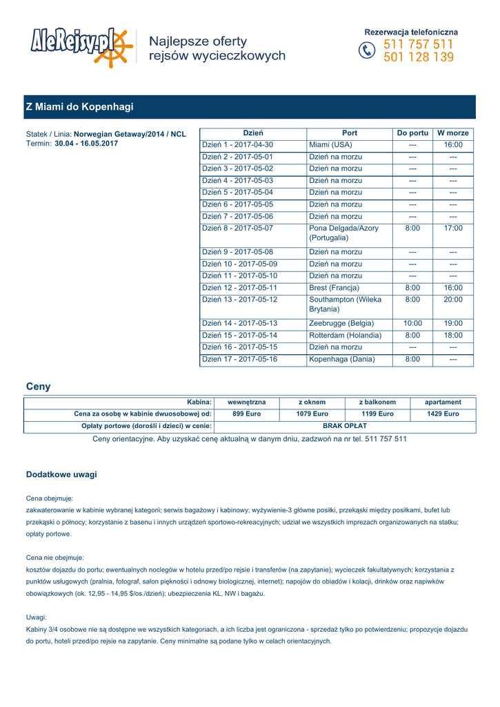 Z Miami do Kopenhagi Statek / Linia: Norwegian Getaway/2014 / NCL Termin: 30.04 - 16.05.2017 Do portu W morze Dzień 1 - 2017-04-30 Dzień Miami (USA) Port --- 16:00 Dzień 2 - 2017-05-01 Dzień na morzu --- --- Dzień 3 - 2017-05-02 Dzień na morzu --- --- Dzień 4 - 2017-05-03 Dzień na morzu --- --- Dzień 5 - 2017-05-04 Dzień na morzu --- --- Dzień 6 - 2017-05-05 Dzień na morzu --- --- Dzień 7 - 2017-05-06 Dzień na morzu Dzień 8 - 2017-05-07 Pona Delgada/Azory (Portugalia) Dzień 9 - 2017-05-08 --- --- 8:00 17:00 Dzień na morzu --- --- Dzień 10 - 2017-05-09 Dzień na morzu --- --- Dzień 11 - 2017-05-10 Dzień na morzu --- --- Dzień 12 - 2017-05-11 Brest (Francja) 8:00 16:00 Dzień 13 - 2017-05-12 Southampton (Wileka Brytania) 8:00 20:00 Dzień 14 - 2017-05-13 Zeebrugge (Belgia) 10:00 19:00 Dzień 15 - 2017-05-14 Rotterdam (Holandia) 8:00 18:00 Dzień 16 - 2017-05-15 Dzień na morzu --- --- Dzień 17 - 2017-05-16 Kopenhaga (Dania) 8:00 --- Ceny Kabina: Cena za osobę w kabinie dwuosobowej od: wewnętrzna z oknem z balkonem apartament 899 Euro 1079 Euro 1199 Euro 1429 Euro Opłaty portowe (dorośli i dzieci) w cenie: BRAK OPŁAT Ceny orientacyjne. Aby uzyskać cenę aktualną w danym dniu, zadzwoń na nr tel. 511 757 511 Dodatkowe uwagi Cena obejmuje: zakwaterowanie w kabinie wybranej kategorii; serwis bagażowy i kabinowy; wyżywienie-3 główne posiłki, przekąski między posiłkami, bufet lub przekąski o północy; korzystanie z basenu i innych urządzeń sportowo-rekreacyjnych; udział we wszystkich imprezach organizowanych na statku; opłaty portowe. Cena nie obejmuje: kosztów dojazdu do portu; ewentualnych noclegów w hotelu przed/po rejsie i transferów (na zapytanie); wycieczek fakultatywnych; korzystania z punktów usługowych (pralnia, fotograf, salon piękności i odnowy biologicznej, internet); napojów do obiadów i kolacji, drinków oraz napiwków obowiązkowych (ok. 12,95 - 14,95 $/os./dzień); ubezpieczenia KL, NW i bagażu. Uwagi: Kabiny 3/4 osobowe nie są dostępne we wszystkich kategoriach, a ich liczba jest ograniczona - sprzedaż tylko po potwierdzeniu; propozycje dojazdu do portu, hoteli przed/po rejsie na zapytanie. Ceny minimalne są podane tylko w celach orientacyjnych.