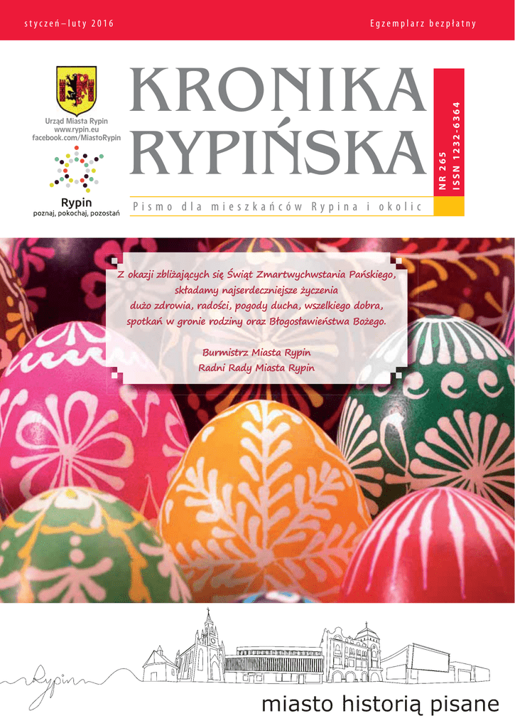 Egzemplarz bezpłatny Urząd Miasta Rypin www.rypin.eu facebook.com/MiastoRypin KRONIKA RYPIŃSKA Pismo dla mieszkańców Rypina i okolic Z okazji zbliżających się Świąt Zmartwychwstania Pańskiego, składamy najserdeczniejsze życzenia dużo zdrowia, radości, pogody ducha, wszelkiego dobra, spotkań w gronie rodziny oraz Błogosławieństwa Bożego. Burmistrz Miasta Rypin Radni Rady Miasta Rypin NR 265 ISSN 1232-6364 styczeń–luty 2016 KRONIKA RYPIŃSKA Na sesji plenarnej Komitetu Regionów W dniach 10 – 11 lutego w Brukseli odbyła się 116. sesja plenarna Europejskiego Komitetu Regionów, w której uczestniczył Burmistrz Miasta Rypin Paweł Grzybowski. Dwudniowe obrady odbywały się w sali posiedzeń plenarnych Parlamentu Europejskiego. Burmistrz Paweł Grzybowski uczestniczył w obradach jako delegat Związku Miast Polskich do Komitetu Regionów. Gospodarz naszego miasta po raz pierwszy zaznaczył swoją aktywność, występując w imieniu grupy ECR – europejskiej partii Konserwatystów i Reformatorów. Wystąpienie skierowane było do komisarza ds. edukacji, kultury, młodzieży i sportu Tobora Navracsicsa. Wśród wielu punktów posiedzenia Komitetu Regionów były także wystąpienia m.in. przewodniczącego Rady Europejskiej – Donalda Tuska, komisarz ds. polityki regionalnej – Coriny Cretu, a także niderlandzkiego ministra spraw wewnętrznych i ds. kontaktów z Króle- stwem – Ronalda Plasterka. Podczas posiedzenia opiniowano także m.in. projekt rezolucji w sprawie zagrożeń dla strefy Schengen, czy też realizację odnowionych ram europejskiej współpracy w dziedzinie młodzieży. Magdalena Balińska „Szanowny Komisarzu Navracsics, w imieniu grupy ECR chciałbym powitać Pana na sesji plenarnej badania prowadzone w moim regionie wskazują na rozdźwięk pomięKomitetu Regionów. Chciałbym wypowiedzieć się w sprawie edukacji dzy potrzebami pracodawców, a kwalifikacjami poszukujących pracy. Jamłodych i jej roli w zapewnianiu miejsc pracy w regionach miejskich ko władze lokalne i regionalne mamy kluczową rolę do odegrania w tej sprawie. Często działamy jako dostawcy usług edukacyjnych, szkolenioi wiejskich. Jest to obszar, gdzie potrzebujemy więcej regionalizmu. Na początku, dla zilustrowania jak ważna jest dla nas ta spra- wych i zawodowych. Niestety nie zawsze zapewnia nam się elastyczwa, przedstawię pewne dane. Europejski wskaźnik bezrobocia poniżej ne podejście i właściwe zasoby, aby ułatwić młodym ludziom przejście 28 roku życia (EU-28) w grudniu 2015 roku wynosił 9%. Jak doskona- z etapu edukacji na rynek pracy. Na koniec chciałbym podkreślić, że edukacja i kwalifikacje często le Pan wie, wskaźnik bezrobocia wśród młodych w naszych krajach jest generalnie znacznie wyższy – nawet dwa i więcej razy wyższy niż ogól- dotyczą umiejętności miękkich. Kluczem do prawdziwej edukacji jest ny wskaźnik dla każdego wieku. Polska w tym względzie się nie wyróż- inteligencja plus charakter. Chciałbym zatem wezwać Komisję Europejnia. Obecny wskaźnik bezrobocia wynosi 10,3%, ale bezrobocie wśród ską do pracy z władzami lokalnymi i regionalnymi, by wykorzystać promłodych to 20%. W niektórych krajach UE połowa młodych ludzi jest gram Erasmus+, aby dotrzeć do różnych grup uczestników. Erasmus+ jest ważnym programem, ponieważ otwiera możliwości dla młodych bezrobotna. Inną rzeczą, o której nie powinniśmy zapominać w tym kontek- Europejczyków i pomaga ludziom z różnych kultur lepiej oddziaływać ście jest podział miasto – wieś. Jako przykład podam region, który re- na siebie, adaptować się i komunikować. Dziękuję.” prezentuję – województwo kujawsko-pomorskie. W dwóch największych miastach regionu – Bydgoszczy i Toruniu wskaźnik bezrobocia w 2015 roku wynosił odpowiednio 5,4% i 6,9%, podczas gdy w niektórych regionach wiejskich był bliski 25%. Zachęcam Pana Komisarza do ścisłej współpracy z czołowymi politykami w celu lepszej pracy nad tym wyzwaniem i konsultowania Pana przedsięwzięć z władzami lokalnymi i regionalnymi. Finansowanie innowacyjnych centrów nauczania, wzmocnienie współpracy pomiędzy szkołami i firmami, poprawa infrastruktury – mają kluczowe znaczenie i nie powinno być ograniczane na obszarach wiejskich. Jeśli skupimy się zbytnio na miastach, wzrost będzie nierówny, sterowany centralnie i nasz kraj szybko się wyludni. Musimy wspólnie rozważyć, jak zapewnić naszym młodym obywatelom z różnych części naszych krajów kwalifikacje, które znajdą zastosoWystąpienie burmistrza Pawła Grzybowskiego podczas sesji plenarnej Europejskiego Komitetu Regionów wanie w regionach, z których pochodzą. Wszelkie 2 styczeń–luty 2016 Fot. Nadesłane Treść wystąpienia Burmistrza Miasta Rypin Pawła Grzybowskiego: KRONIKA RYPIŃSKA Z sesji Rady Miasta Rypin 30 listopada 2015 r. odbyła się XIII sesja Rady Miasta Rypin. Podczas obrad radni podjęli następujące uchwały: – Uchwała Nr XIII/109/15 w sprawie przyjęcia i realizacji „Planu gospodarki niskoemisyjnej dla Gminy Miasta Rypin na lata 2015–2020”, – Uchwała Nr XIII/110/15 w sprawie zatwierdzenia taryfy dla zbiorowego zaopatrzenia w wodę i zbiorowego odprowadzania ścieków, – Uchwała Nr XIII/111/15 w sprawie dopłaty do taryfowych grup odbiorców zbiorowego zaopatrzenia w wodę i zbiorowego odprowadzania ścieków, – Uchwała Nr XIII/112/15 w sprawie przyjęcia Programu opieki nad zwierzętami bezdomnymi oraz zapobiegania bezdomności zwierząt na terenie Gminy Miasta Rypin na 2015 rok, – Uchwała Nr XIII/113/15 w sprawie podatku rolnego, – Uchwała Nr XIII/114/15 w sprawie podatku leśnego, – Uchwała Nr XIII/115/15 w sprawie określenia wysokości stawek podatku od nieruchomości, – Uchwała Nr XIII/116/15 w sprawie określenia wysokości stawek podatku od środków transportowych i zwolnień w tym podatku, – Uchwała Nr XIII/117/15 w sprawie wpro
