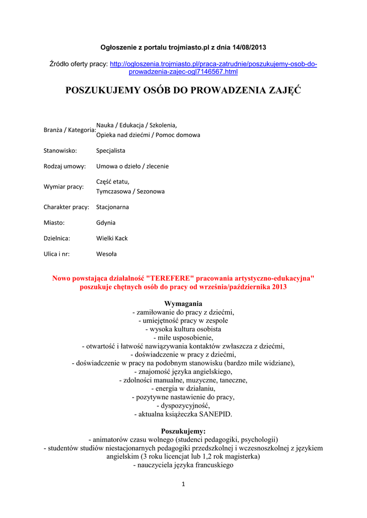 Ogłoszenie z portalu trojmiasto.pl z dnia 14/08/2013 Źródło oferty pracy: http://ogloszenia.trojmiasto.pl/praca-zatrudnie/poszukujemy-osob-doprowadzenia-zajec-ogl7146567.html POSZUKUJEMY OSÓB DO PROWADZENIA ZAJĘĆ Nauka / Edukacja / Szkolenia, Branża / Kategoria: Opieka nad dziećmi / Pomoc domowa Stanowisko: Specjalista Rodzaj umowy: Umowa o dzieło / zlecenie Wymiar pracy: Część etatu, Tymczasowa / Sezonowa Charakter pracy: Stacjonarna Miasto: Gdynia Dzielnica: Wielki Kack Ulica i nr: Wesoła Nowo powstająca działalność "TEREFERE" pracowania artystyczno-edukacyjna" poszukuje chętnych osób do pracy od września/października 2013 Wymagania - zamiłowanie do pracy z dziećmi, - umiejętność pracy w zespole - wysoka kultura osobista - miłe usposobienie, - otwartość i łatwość nawiązywania kontaktów zwłaszcza z dziećmi, - doświadczenie w pracy z dziećmi, - doświadczenie w pracy na podobnym stanowisku (bardzo mile widziane), - znajomość języka angielskiego, - zdolności manualne, muzyczne, taneczne, - energia w działaniu, - pozytywne nastawienie do pracy, - dyspozycyjność, - aktualna książeczka SANEPID. Poszukujemy: - animatorów czasu wolnego (studenci pedagogiki, psychologii) - studentów studiów niestacjonarnych pedagogiki przedszkolnej i wczesnoszkolnej z językiem angielskim (3 roku licencjat lub 1,2 rok magisterka) - nauczyciela języka francuskiego 1 - nauczyciela języka angielskiego - muzyka - instruktorów/nauczucieli baletu, tańca, jogi, gimnastyki (zajęcia dla dzieci i dorosłych) obowiązki: Animator czasu wolnego - weekendowe prowadzenie urodzin, - udział w festynach, eventach Studenci studiów niestacjonarnych pedagogiki przedszkolnej i wczesnoszkolnej z językiem angielskim - prowadzenie alternatywnej świetlicy dla dzieci 6-10 lat (5 razy w tygodniu ok 5 godzin) - prowadzenie zajęć adaptacyjnych z dziećmi 2,5-3,5 lat (3 razy w tygodniu po 3 godziny) - prowadzenie zajęć przed przedszkolnych z dziećmi 4-5 lat (5 razy w tygodniu po 5 godzin) - prowadzenie zajęć dodatkowych z języka angielskiego dla dzieci 4-6, 7-8 lat ( 2 razy w tygodniu po 2 godziny) Nauczyciel języka francuskiego - prowadzenie zajęć dodatkowych dla dzieci 4-6 lat (1 raz w tygodniu po 1 godzinie) Nauczyciel języka angielskiego - prowadzenie zajęć dodatkowych z języka angielskiego dla dzieci 4-6, 7-8 lat ( 2 razy w tygodniu po 2 godziny) Muzyk - prowadzenie zajęć umuzykalniających dla dzieci 1-2 lata (1 raz w tygodniu po 1 godzinie) Taniec, balet, joga, gimnastyka - prowadzenie zajęć z jogi dla dorosłych (2 razy w tygodniu po 1,5 godzinie) - taniec (latino, zumba) dla dorosłych (2 razy w tygodniu po 1 godzinie) oraz dla dzieci 4-6 lat (1 raz w tygodniu po 1 godzinie) - gimnastyka dla kobiet w ciąży (1 raz w tygodniu po 1,5 godziny) - balet dla dzieci 4-6 lat (1 raz w tygodniu po 1 godzinie) - mile widziany instruktor/nauczyciel, który może poprowadzić więcej niż jedne z wymienionych zajęć. oferujemy: - ciekawą pracę w dynamicznie rozwijającej się firmie, - pracę w młodym zespole, - atrakcyjne wynagrodzenie, - rozwój zawodowy i osobisty, - zdobycie doświadczenia w pracy z dziećmi, - praca z kameralna grupą dzieci (max 10) - praca z kameralna grupą dorosłych (max 12) - umowa zlecenie lub o dzieło 2 opis dodatkowy: Zainteresowane osoby prosimy o przesłanie CV wraz z listem motywacyjnym na adres: [email protected] z dopiskiem w tytule stanowiska, o które się Państwo ubiegacie (np. animator czasu wolnego, student pedagogiki wczesnoszkolnej z językiem angielskim, itp.) Prosimy o umieszczenie w CV następującej klauzuli: Wyrażam zgodę na przetwarzanie moich danych osobowych zawartych w ofercie pracy dla potrzeb niezbędnych do realizacji procesu rekrutacji, zgodnie z przepisami Ustawy, z dnia 29.08.97 r. o ochronie danych osobowych (Dz. U. nr. 133, poz. 883). Informujemy, że skontaktujemy się tylko z wybranymi osobami. Aplikuj: dane kontaktowe: TEREFERE pracowania artystyczno-edukacyjna [email protected] tel.: 730-052-250 Gdynia Wesoła REGON: 221866665 3
