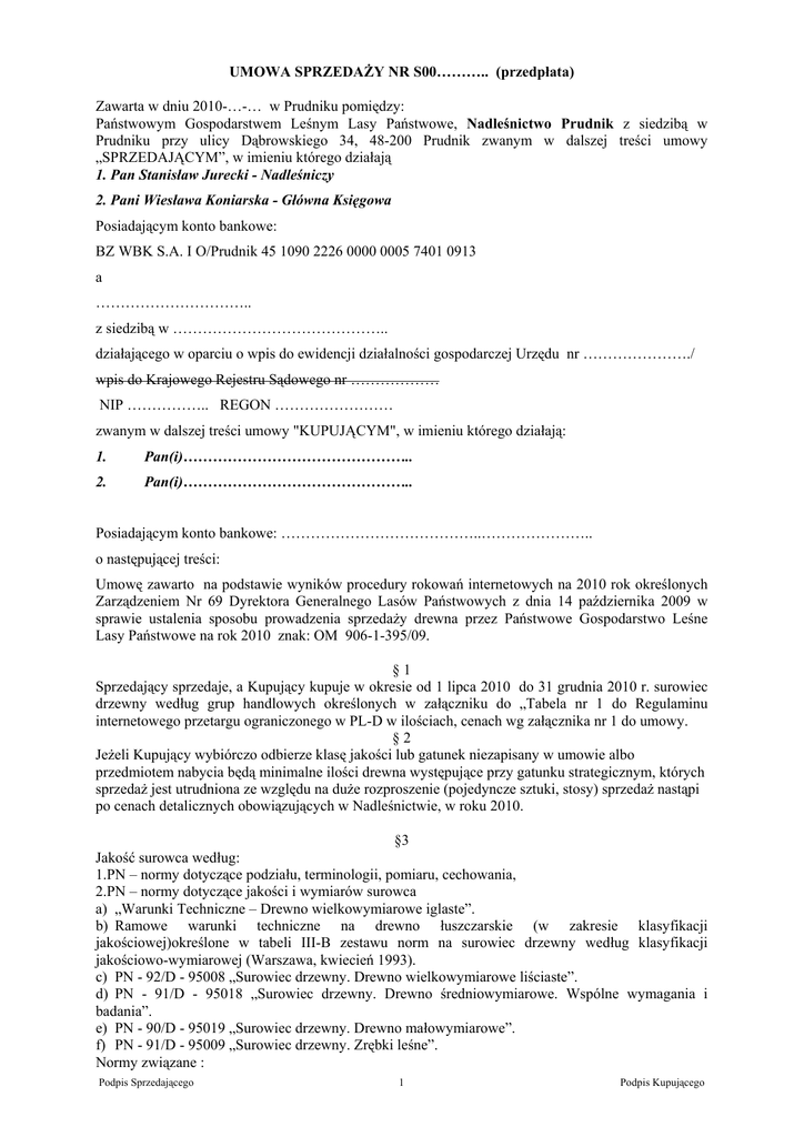 UMOWA SPRZEDAŻY NR S00……….. (przedpłata) Zawarta w dniu 2010-…-… w Prudniku pomiędzy: Państwowym Gospodarstwem Leśnym Lasy Państwowe, Nadleśnictwo Prudnik z siedzibą w Prudniku przy ulicy Dąbrowskiego 34, 48-200 Prudnik zwanym w dalszej treści umowy „SPRZEDAJĄCYM”, w imieniu którego działają 1. Pan Stanisław Jurecki - Nadleśniczy 2. Pani Wiesława Koniarska - Główna Księgowa Posiadającym konto bankowe: BZ WBK S.A. I O/Prudnik 45 1090 2226 0000 0005 7401 0913 a ………………………….. z siedzibą w …………………………………….. działającego w oparciu o wpis do ewidencji działalności gospodarczej Urzędu nr …………………./ wpis do Krajowego Rejestru Sądowego nr ……………… NIP …………….. REGON …………………… zwanym w dalszej treści umowy "KUPUJĄCYM", w imieniu którego działają: 1. Pan(i)……………………………………….. 2. Pan(i)……………………………………….. Posiadającym konto bankowe: …………………………………..………………….. o następującej treści: Umowę zawarto na podstawie wyników procedury rokowań internetowych na 2010 rok określonych Zarządzeniem Nr 69 Dyrektora Generalnego Lasów Państwowych z dnia 14 października 2009 w sprawie ustalenia sposobu prowadzenia sprzedaży drewna przez Państwowe Gospodarstwo Leśne Lasy Państwowe na rok 2010 znak: OM 906-1-395/09. §1 Sprzedający sprzedaje, a Kupujący kupuje w okresie od 1 lipca 2010 do 31 grudnia 2010 r. surowiec drzewny według grup handlowych określonych w załączniku do „Tabela nr 1 do Regulaminu internetowego przetargu ograniczonego w PL-D w ilościach, cenach wg załącznika nr 1 do umowy. §2 Jeżeli Kupujący wybiórczo odbierze klasę jakości lub gatunek niezapisany w umowie albo przedmiotem nabycia będą minimalne ilości drewna występujące przy gatunku strategicznym, których sprzedaż jest utrudniona ze względu na duże rozproszenie (pojedyncze sztuki, stosy) sprzedaż nastąpi po cenach detalicznych obowiązujących w Nadleśnictwie, w roku 2010. §3 Jakość surowca według: 1.PN – normy dotyczące podziału, terminologii, pomiaru, cechowania, 2.PN – normy dotyczące jakości i wymiarów surowca a) „Warunki Techniczne – Drewno wielkowymiarowe iglaste”. b) Ramowe warunki techniczne na drewno łuszczarskie (w zakresie klasyfikacji jakościowej)określone w tabeli III-B zestawu norm na surowiec drzewny według klasyfikacji jakościowo-wymiarowej (Warszawa, kwiecień 1993). c) PN - 92/D - 95008 „Surowiec drzewny. Drewno wielkowymiarowe liściaste”. d) PN - 91/D - 95018 „Surowiec drzewny. Drewno średniowymiarowe. Wspólne wymagania i badania”. e) PN - 90/D - 95019 „Surowiec drzewny. Drewno małowymiarowe”. f) PN - 91/D - 95009 „Surowiec drzewny. Zrębki leśne”. Normy związane : Podpis Sprzedającego 1 Podpis Kupującego a) PN - 93/D - 02002 „Surowiec drzewny. Podział, terminologia i symbole”. b) PN - 93/D - 95000 „Surowiec drzewny. Pomiar, obliczanie miąższości i cechowanie”. 3.warunków technicznych ustalonych przez Strony stanowiące załącznik nr …. do umowy 4.inne wymagania np. średnica minimalna, maksymalna, długość, zamiennik odmienny jak w normie, procent surowca w partii o długości, średnicy. 5. szczególne wymagania : ………………………………….…………………………………… …………………….…………………………………………………………………………………. §4 1.Sprzedający nie przewiduje jednoznacznej lokalizacji pozycji cięć, a Kupujący wyraża zgodę na odbiór drewna z miejsca wskazanego przez Sprzedającego. 2.Ceny sprzedaży ustalono na warunkach „Ex Works” (loco las po zrywce). 3.Za sortowanie drewna wielkowymiarowego lub średniowymarowego dla potrzeb Kupującego Sprzedający doliczy dopłatę w wysokości do 5% wartości zakupionego drewna. 4.Ceny za surowiec oraz sortowanie nie zawierają podatku VAT. §5 1.Sprzedaż może być realizowana wyłącznie w oparciu o uzgodnione na piśmie przez strony umowy harmonogramy. 2. Zmiany do ustalonego harmonogramu wymagają formy pisemnej i są możliwe do wprowadzenia za zgodą stron. Rozlicznie harmonogramów następuje w przyjętych okresach czasowych. 3.W przypadku sortymentów cennych, drewna WA0 i WB0 iglastego oraz WO liściastego beztwardzielowego ustala się termin odbioru zgłoszonych przez Sprzedającego partii drewna w ciągu 7 dni. 4. Sprzedaż / zakup drewna przewidziana na okres zapisany w harmonogramie może być wykonana z dokładnością do +/- 5% z tym, że łączne wykonanie sprzedaży / zakupu półrocznego nie przekroczy +/- 5%. 5. W przypadku nieprzygotowania surowca przez Sprzedającego lub nie odebrania go przez Kupującego w terminie wynikającym z harmonogramów o których mowa w ust.1 i ust.2 każda ze stron zapłaci kary umowne w wysokości 5 % wartości nie przygotowanej lub nie odebranej partii surowca. §6 1. Kupujący oświadcza, iż jako zabezpieczenie zakupu surowca drzewnego ustanawia – przedpłata. 2.Nie ustanowienie lub wyczerpanie umownych zabezpieczeń transakcji kupna-sprzedaży powoduje, że sprzedaż może być realizowana wyłącznie na zasadzie przedpłat. Wartość przedpłaty ustala się na poziomie wartości przygotowanej do sprzedaży partii surowca. 3.W przypadku braku przedpłaty Sprzedający wstrzyma sprzedaż oraz zmniejszy masę surowca drzewnego o ilości przewidziane do sprzedaży w harmonogramie, w okresie braku zabezpieczenia lub ustanowienia przez Kupującego wadliwych zabezpieczeń. §7 1.Transport surowca drzewnego organizowany jest przez Kupującego na jego koszt. 2. Kupujący wystawi przewoźnikowi imienne upoważnienie odbioru drewna stanowiące załącznik do umowy. 3.Odbioru drewna Kupujący lub upoważniony przez Kupującego przewoźnik dokonuje własnym środkiem transportowym w terminie ustalonym zgodnie z 