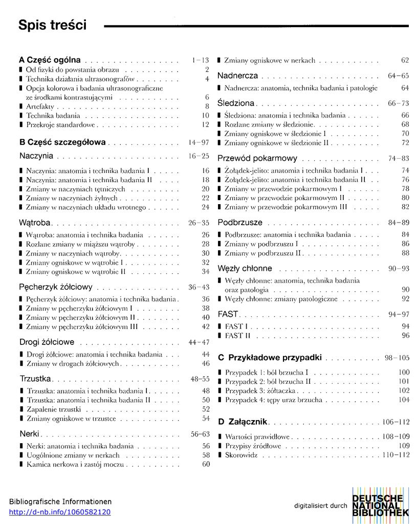 Spis treści A Część ogólna i 13 I Od fizyki do powstania obrazu 2 I Technika działania ultrasonografów 4 I Artefakty Nadnercza 62 64-65 I Nadnercza: anatomia, technika badania i patologie I Opcja kolorowa i badania ultrasonograficzne ze środkami kontrastującymi I Zmiany ogniskowe w nerkach 6 8 Śledziona 64 66-73 I Technika badania 10 I Śledziona: anatomia i technika badania 66 I Przekroje standardowe 12 I Rozlane zmiany w śledzionie 68 I Zmiany ogniskowe w śledzionie I 70 I Zmiany ogniskowe w śledzionie II 72 B Część szczegółowa 14—97 Naczynia 16-25 Przewód pokarmowy 74-83 I Naczynia: anatomia i technika badania I 16 I Zołądek-jelito: anatomia i technika badania I ... 74 I Naczynia: anatomia i technika badania II .... 18 I Zołądek-jelito: anatomia i technika badania II . . 76 I Zmiany w naczyniach tętniczych 20 I Zmiany w przewodzie pokarmowym I 78 I Zmiany w naczyniach żylnych 22 I Zmiany w przewodzie pokarmowym II 80 I Zmiany w naczyniach układu wrotnego 24 I Zmiany w przewodzie pokarmowym III 82 Wątroba 26-35 Podbrzusze 84-89 I Wątroba: anatomia i technika badania 26 I Podbrzusze: anatomia i technika badania 84 I Rozlane zmiany w miąższu wątroby 28 I Zmiany w podbrzuszu I 86 I Zmiany w naczyniach wątroby 30 I Zmiany w podbrzuszu II 88 I Zmiany ogniskowe w wątrobie I 32 I Zmiany ogniskowe w wątrobie 11 34 Pęcherzyk żółciowy 36 I Zmiany w pęcherzyku żółciowym I 38 I Zmiany w pęcherzyku żółciowym II 40 I Zmiany w pęcherzyku żółciowym 111 42 oraz patologia 90 I Węzły chłonne: zmiany patologiczne FAST 92 94-97 I FAST I 94 I FAST II 96 44-47 I Drogi żółciowe: anatomia i technika badania ... 44 I Zmiany w drogach żółciowych 46 Trzustka 90-93 I Węzły chłonne: anatomia, technika badania 36-43 I Pęcherzyk żółciowy: anatomia i technika badania . Drogi żółciowe Węzły chłonne 48-55 C Przykładowe przypadki 98 105 I Przypadek 1: ból brzuchaI 100 I Przypadek 2: ból brzucha II 101 I Trzustka: anatomia i technika badania I 48 I Przypadek 3: żółtaczka 102 I Trzustka: anatomia i technika badania II 50 I Przypadek 4: tępy uraz brzucha 104 I Zapalenie trzustki 52 I Zmiany ogniskowe w trzustce 54 Nerki 56-63 D Załącznik I Wartości prawidłowe I Nerki: anatomia i technika badania 56 I Przypisy źródłowe I Uogólnione zmiany w nerkach 58 I Skorowidz I Kamica nerkowa i zastój moczu 60 http://d-nb.info/1060582120 106-112 108 — 109 109 110 — 112
