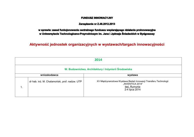Aktywność jednostek organizacyjnych w wystawach/targach innowacyjności 2014 W. Budownictwa, Architektury i Inżynierii Środowiska wnioskodawca dr hab. inż. M. Chalamoński, prof. nadzw. UTP 1. wystawa XV Międzynarodowa Wystawa Badań Innowacji Transferu Technologii „INVENTICA 2014” lasi, Rumunia 2-4 lipca 2014 W. Inżynierii Mechanicznej wnioskodawca wystawa prof. dr hab. inż. Bogdan Żółtowski Międzynarodowe Targi Wynalazczości Badań Naukowych i Nowych Technologii BRUSSELS INOVA 2014 Belgia - Bruksela 13-15.XI.2014 1. DIPLOMA BRUSSELS Eureka THE BELGIAN AND INTERNATIONAL TRADE FAIR FOR TECHNOLOGICAL INNOVATION Silver medal 2. mgr inż. Szymczak Marek. Uczestnictwo na stoisku Stowarzyszenia Polskich Wynalazców i Racjonalizatorów w XV Międzynarodowej Wystawie Badań Innowacji Transferu Technologii „INVENTICA 2014” lasi, Rumunia 2-4 lipca 2014 W. Technologii i Inżynierii Chemicznej wnioskodawca 1. 2. wystawa dr Stanisław Zajchowski, prof. nadzw. UTP dr inż. Jolanta Tomaszewska, prof. nadzw. UTP oraz Instytut Biopolimerów i Włókien Chemicznych w Łodzi Międzynarodowe Targi Wynalazków i Innowacji TUNIS INNOV Tunezja, Hammamet 10-15.03 2014 dr hab. inż. Marek Domoradzki, prof. nadzw. UTP 113 Międzynarodowe Targi Wynalazczości CONCOURS LEPINE 2014 Francja – Paryż 30.04-11.05.2014 Złoty medal Medal brązowy 3. dr hab. Stanisław Zajchowski, prof. nadzw. UTP dr hab. inż. Jolanta Tomaszewska, prof. nadzw. UTP IV edycja Europejskich Targów Kreatywności i Wynalazczości Eurolnvent Lasi-Rumunia 22-24 maja 2014 DIPLOMA - GOLD MEDAL EUROINVENT 2014 DIPLOMA - The Green Environment AWARD DIPLOMA DE EXCELENTA 4. dr hab. Stanisław Zajchowski, prof. nadzw. UTP dr hab. inż. Jolanta. Tomaszewska prof. nadzw. UTP Międzynarodowe Targi Wynalazczości Badań Naukowych i Nowych Technologii BRUSSELS INOVA Bruksela – Belgia 13-15.XI.2014 5. dr hab. inż. Marek Domoradzki, prof. nadzw. UTP Międzynarodowe Targi Wynalazczości Badań Naukowych i Nowych Technologii BRUSSELS INOVA Bruksela – Belgia 13-15.XI.2014 Diploma Brussels Eureka THE BELGIAN AND INTERNATIONAL TRADE FAIR FOR TECHNOLOGICAL INNOVATION GOLD medal with mention 6. dr hab. inż. Marek Domoradzki, prof. nadzw. UTP Międzynarodowe Targi Wynalazczości Badań Naukowych i Nowych Technologii BRUSSELS INOVA Bruksela – Belgia 13-15.XI.2014 DIPLOMA BRUSSELS Eureka THE BELGIAN AND INTERNATIONAL TRADE FAIR FOR TECHNOLOGICAL INNOVATION Silver medal