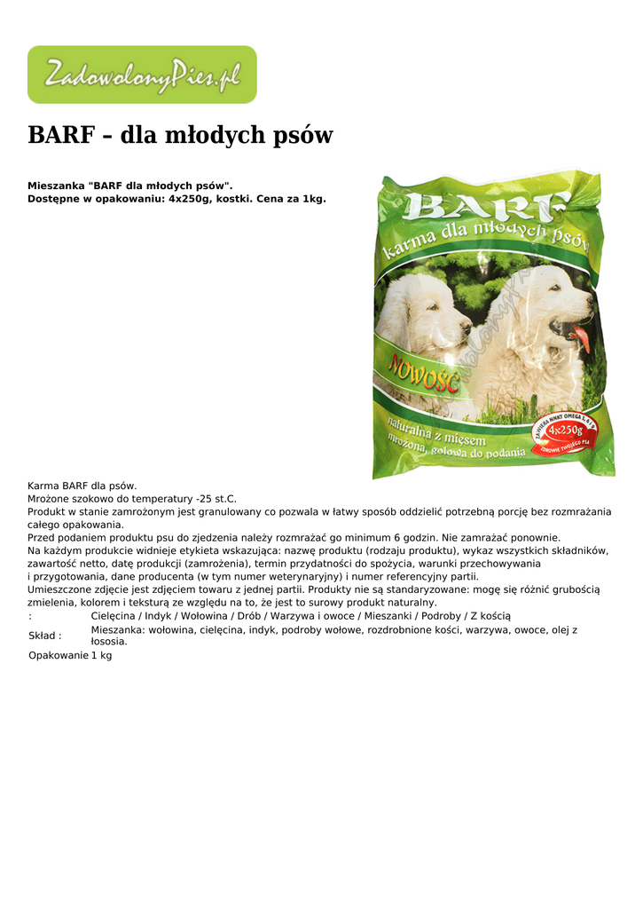 BARF – dla młodych psów Mieszanka "BARF dla młodych psów". Dostępne w opakowaniu: 4x250g, kostki. Cena za 1kg. Karma BARF dla psów. Mrożone szokowo do temperatury -25 st.C. Produkt w stanie zamrożonym jest granulowany co pozwala w łatwy sposób oddzielić potrzebną porcję bez rozmrażania całego opakowania. Przed podaniem produktu psu do zjedzenia należy rozmrażać go minimum 6 godzin. Nie zamrażać ponownie. Na każdym produkcie widnieje etykieta wskazująca: nazwę produktu (rodzaju produktu), wykaz wszystkich składników, zawartość netto, datę produkcji (zamrożenia), termin przydatności do spożycia, warunki przechowywania i przygotowania, dane producenta (w tym numer weterynaryjny) i numer referencyjny partii. Umieszczone zdjęcie jest zdjęciem towaru z jednej partii. Produkty nie są standaryzowane: mogę się różnić grubością zmielenia, kolorem i teksturą ze względu na to, że jest to surowy produkt naturalny. : Cielęcina / Indyk / Wołowina / Drób / Warzywa i owoce / Mieszanki / Podroby / Z kością Mieszanka: wołowina, cielęcina, indyk, podroby wołowe, rozdrobnione kości, warzywa, owoce, olej z Skład : łososia. Opakowanie 1 kg
