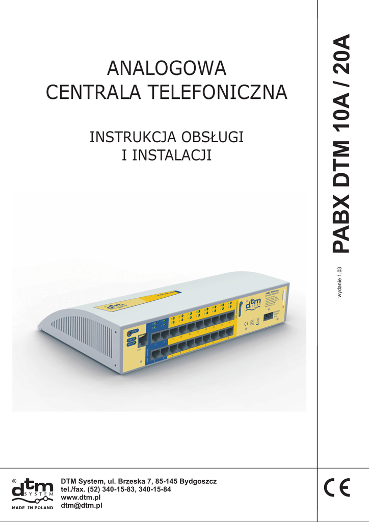 wydanie 1.03 INSTRUKCJA OBSŁUGI I INSTALACJI PABX DTM 10A / 20A ANALOGOWA CENTRALA TELEFONICZNA DTM System, ul. Brzeska 7, 85-145 Bydgoszcz tel./fax. (52) 340-15-83, 340-15-84 www.dtm.pl [email protected] Spis treści Spis treści: 1. Ogólny opis centrali DTM10A/20A . . . . . . . . . . . . . . . . . . . . . . . . . . . . . . . . . . . . . . . . . 3 2. Współpraca centrali z komputerem 2.1. Aplikacja TelefonDTM . . . . . . . . . . . . . . . . . . . . . . . . . . . . . . . . . . . . . . . . . . . 4 2.1.1. Funkcje programu TelefonDTM . . . . . . . . . . . . . . . . . . . . . . . . . . . . . 4 2.1.2. Instalacja programu . . . . . . . . . . . . . . . . . . . . . . . . . . . . . . . . . . . . . . 4 2.1.3. Praca z programem - logowanie . . . . . . . . . . . . . . . . . . . . . . . . . . . . 4 2.1.4. Dodatek Telify - wybieranie numerów poprzez kliknięcie na stronie www . . . . . . . . . . . . . . . . . . . . . . . . . . . . . . . . 11 2.2. Aplikacja SekretarzDTM 2.2.1. Funkcje programu SekretarzDTM . . . . . . . . . . . . . . . . . . . . . . . . . . . 12 2.2.2. Instalacja programu . . . . . . . . . . . . . . . . . . . . . . . . . . . . . . . . . . . . . . 12 2.2.3. Praca z programem . . . . . . . . . . . . . . . . . . . . . . . . . . . . . . . . . . . . . . 13 2.3. Serwer globalnej książki telefonicznej KontaktyDTM . . . . . . . . . . . . . . . . . . . 16 2.3.1. Funkcje programu KontaktyDTM . . . . . . . . . . . . . . . . . . . . . . . . . . . . 17 2.3.2. Instalacja programu . . . . . . . . . . . . . . . . . . . . . . . . . . . . . . . . . . . . . 17 2.3.3. Integracja z siecią wewnętrzną . . . . . . . . . . . . . . . . . . . . . . . . . . . . 17 2.4. Aplikacja SerwisDTM . . . . . . . . . . . . . . . . . . . . . . . . . . . . . . . . . . . . . . . . . . . 17 2.4.1. Funkcje programu SerwisDTM . . . . . . . . . . . . . . . . . . . . . . . . . . . . 17 2.4.2. Instalacja programu . . . . . . . . . . . . . . . . . . . . . . . . . . . . . . . . . . . . . 17 2.4.3. Praca z programem . . . . . . . . . . . . . . . . . . . . . . . . . . . . . . . . . . . . . 17 3. Podstawowe parametry i cechy centrali DTM10A/20A 3.1. Cechy funkcjonalne . . . . . . . . . . . . . . . . . . . . . . . . . . . . . . . . . . . . . . . . . . . . . 19 3.2. Dane techniczne . . . . . . . . . . . . . . . . . . . . . . . . . . . . . . . . . . . . . . . . . . . . . . . 19 3.3. Wymagania montażowe . . . . . . . . . . . . . . . . . . . . . . . . . . . . . . . . . . . . . . . . . 20 4. Dzwonki i sygnały spotykane w centrali 4.1. Sygnały Informacyjne (400Hz) . . . . . . . . . . . . . . . . . . . . . . . . . . . . . . . . . . . . 20 4.2. Rodzaje dzwonków . . . . . . . . . . . . . . . . . . . . . . . . . . . . . . . . . . . . . . . . . . . . . 21 5. Użyte oznaczenia i skróty . . . . . . . . . . . . . . . . . . . . . . . . . . . . . . . . . . . . . . . . . . . . . . . 22 6. Realizowanie usług w centrali DTM10A/20A 6.1. Wybieranie numeru wewnętrznego . . . . . . . . . . . . . . . . . . . . . . . . . . . . . . . . 23 6.2. Wybieranie numeru zewnętrznego . . . . . . . . . . . . . . . . . . . . . . . . . . . . . . . . . 23 . . . . . . . . . . . . . . . . . . . . . . . . . . . . . . . . . . . . . . . . . . . . . 23 6.3. Wybieranie usługi 6.4. Wybieranie usługi podczas połączenia . . . . . . . . . . . . . . . . . . . . . . . . . . . . . . 23 7. Przekazywanie połączeń pomiędzy abonentami 7.1. Przekazanie połączenia z zaanonsowaniem . . . . . . . . . . . . . . . . . . . . . . . . . . 23 7.2. Przekazanie połączenia bez anonsowania . . . . . . . . . . . . . . . . . . . . . . . . . . . 24 . . . . . . . . . . . . . . . . . . . . . . . . . . . . . . . . . . . . . 24 8. Wykonywanie połączeń tranzytowych 9. Opis usług . . . . . . . . . . . . . . . . . . . . . . . . . . . . . . . . . 24 9.1. Uwagi ogólne do działania usług . . . . . . . . . . . . . . . . . . . . . . . . . . . . . 24 9.2. Logowanie abonenta do centrali (#50) 9.3. Nie przeszkadzać - DND (#40) . . . . . . . . . . . . . . . . . . . . . . . . . . . . . . . . . . . . 24 9.4. Parkowanie - HOLD (FLASH - ONHOOK) . . . . . . . . . . . . . . . . . . . . . . . . . . . 24 9.5. Przechwytywanie wywołań 9.5.1. Z ostatniego aparatu, który zaczął dzwonić (#10) . . . . . . . . . . . . . . 25 9.5.2. Z wybranego aparatu, który dzwoni (#11) . . . . . . . . . . . . . . . . . . . . 25 9.6. Oddzwoń / cofnij przekazaną rozmowę do poprzednika (#20) . . . . . . . . . . . . 25 9.7. Przekierowanie wywołań 9.7.1. Aktywne do odwołania (#30) . . . . . . . . . . . . . . . . . . . . . . . . . . . . . . . 25 9.7.2. Aktywne do momentu podniesienia słuchawki aparatu (#31) . . . . . . . . . . . . . . . . . . . . . . . . . . . . . . . . . . . . . . . . . 25 9.8. Ponowne wybranie numeru - REDIAL (# #) . . . . . . . . . . . . . . . . . . . . . . . . . . 25 9.9. Zapisanie do kolejki oczekujących na połączenie 9.9.1. Z oczekiwaniem ONLINE (9) . . . . . . . . . . . . . . . . . . . . . . . . . . . . . . 25 9.9.2. Z oczekiwaniem OFFLINE (8) . . . . . . . . . . . . . . . . . . . . . . . . . . . . . 25 9.10. Wejście z zerwaniem połączenia (6) . . . . . . . . . . . . . . . . . . . . . . . . . . . . . . . 26 1 9.11. Konferencje: 9.11.1. Zestawianie nowej konferencji . . . . . . . . . . . . . . . . . . . . . . . . . . . . 26 9.11.2. Dodawanie abonentów do istniejącej konferencji . . . . . . . . . . . . . 27 9.12. Otwarcie rygla domofonu . . . . . . . . . . . . . . . . . . . . . . . . . . . . . . . . . . . . . . . 27 10. Tryby pracy centrali DTM10A/20A . . . . . . . . . . . . . . . . . . . . . . . . . . . . . . . . . . . . . . . 28 10.1. Tryb DZIEŃ . . . . . . . . . . . . . . . . . . . . . . . . . . . . . . . . . . . . . . . . . . . . . . . . . . 28 10.2. Tryb NOC . . . . . . . . . . . . . . . . . . . . . . . . . . . . . . . . . . . . . . . . . . . . . . . . . . . 28 10.3. Tryb URLOP . . . . . . . . . . . . . . . . . . . . . . . . . . . . . . . . . . . . . . . . . . . . . . . . . . 2