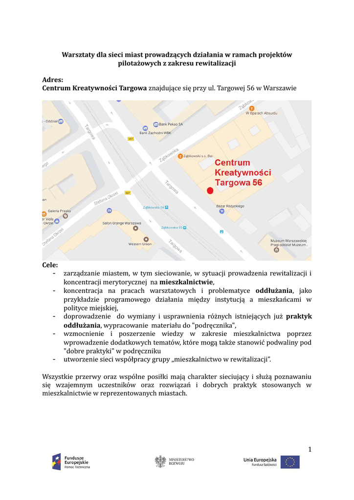 Warsztaty dla sieci miast prowadzących działania w ramach projektów pilotażowych z zakresu rewitalizacji Adres: Centrum Kreatywności Targowa znajdujące się przy ul. Targowej 56 w Warszawie Cele: zarządzanie miastem, w tym sieciowanie, w sytuacji prowadzenia rewitalizacji i koncentracji merytorycznej na mieszkalnictwie, koncentracja na pracach warsztatowych i problematyce oddłużania, jako przykładzie programowego działania między instytucją a mieszkańcami w polityce miejskiej, doprowadzenie do wymiany i usprawnienia różnych istniejących już praktyk oddłużania, wypracowanie materiału do "podręcznika", wzmocnienie i poszerzenie wiedzy w zakresie mieszkalnictwa poprzez wprowadzenie dodatkowych tematów, które mogą także stanowić podwaliny pod "dobre praktyki" w podręczniku utworzenie sieci współpracy grupy „mieszkalnictwo w rewitalizacji”. Wszystkie przerwy oraz wspólne posiłki mają charakter sieciujący i służą poznawaniu się wzajemnym uczestników oraz rozwiązań i dobrych praktyk stosowanych w mieszkalnictwie w reprezentowanych miastach. 1 Eksperci merytoryczni: Dr Aleksandra Jadach-Sepioło, Instytut Rozwoju Miast, Szkoła Główna Handlowa w Warszawie (AJS), Dr Alina Muzioł-Węcławowicz, Politechnika Warszawska, Stow. "Forum Rewitalizacji"(AMW) Moderator prowadzący: Piotr Wołkowiński, konsultant, ekspert URBACT, Instytut Rozwoju Miast, (PW) Goście specjalni: Magda Ruszkowska-Cieślak, Dyrektor Krajowy, Fundacja Habitat for Humanity Poland (MRC) Barbara Audycka, Rzeczniczka, Fundacja Habitat for Humanity Poland (BA) Plan zajęć: Dzień 1 – 11/01/17 (11.00 – 18.00) Godzina Temat i przebieg zadania Uwagi Wprowadzenie 11.00-11.30 Rejestracja i kawa 11.30-11.45 Icebreaker – ustalanie "haseł". PW 11.45-12.00 Spisanie "haseł" spotkania. PW 12.00-12.25 Przedstawienie celów 3-dniowego spotkania oraz AJS, AMW i PW najważniejszych elementów programu. Krótka prezentacja działalności Habitat for MRC i BA Humanity Poland Część I. Warsztat pogłębiający wiedzę i umiejętności z zakresu oddłużania najemców komunalnego zasobu mieszkaniowego 12.25-12.46 Metody oddłużania najemców komunalnego Każdy uczestnik zasobu mieszkaniowego ma przy sobie Cel: Poznajemy metody oddłużania stosowane w drukowaną poszczególnych gminach. wersję swojej Przebieg: praktyki, żeby praca w parach złożonych z przedstawicieli móc ją przekazać rozmówcy. różnych gmin – po 7 minut na przedstawienie doświadczeń każdej z gmin w parze (3 zmiany). 12.46-13.30 Wymiana dobrych praktyk w zakresie oddłużania Uczestnicy - do najemców komunalnego zasobu mieszkaniowego zapisania Cel: czytelnie na wypracowujemy elementy programów kartce flip charta, która zostanie zwalczających zadłużenie wspólne dla powieszona na większości i wyróżniające poszczególne ścianie. gminy, określamy, które z tych elementów to czynniki sukcesu. Przebieg: praca w 4-osobowych grupach zmierzająca do określenia silnych i słabych stron 2 13.30-14.30 14.30-15.30 15.30-15.45 15.45-16.45 16.45-17.15 17.15-18.00 19.00 poszczególnych elementów programów oddłużeniowych. Kluczowe elementy programów oddłużeniowych Cel: Podsumowujemy wartościowe elementy programów oddłużeniowych i wskazujemy ich słabe punkty. Przebieg: Walkabout. Przedstawienie wyników grup roboczych. Obiad sieciujący Metoda „doceniające dochodzenie” Cel: Wprowadzamy innowacyjny sposób analizy problemu oddłużenia najemców komunalnego zasobu mieszkaniowego. Przebieg: Przedstawienie metody "doceniające dochodzenie" i dostosowania jej do zadania warsztatowego oddłużenia. SOAR dla skutecznego programu oddłużenia najemców komunalnego zasobu mieszkaniowego Cel: Opracowujemy SOAR dla skutecznego programu, tj. siły, możliwości (szanse), aspiracje (dążenia) oraz wyniki (mierzalne). Przebieg: Praca w 8-osobowych grupach. Scenariusz sukcesu skutecznego programu oddłużenia najemców komunalnego zasobu mieszkaniowego Cel: Określamy kamienie milowe do wdrożenia skutecznego programu oddłużeniowego. Przebieg: Praca w tych samych 8-osobowych grupach. Wdrożenie scenariusza Cel: Budujemy historię sukcesu skutecznego programu oddłużenia najemców komunalnego zasobu mieszkaniowego Przebieg: Praca w tych samych 8-osobowych grupach. Kolacja Uczestnicy PW Uczestnicy - do zapisania czytelnie na kartce flip charta, która zostanie powieszona na ścianie. Uczestnicy Uczestnicy 3 Dzień 2 – 12/01/2016 (9.00 – 17.00) 9.00-9.30 Rejestracja i kawa 9.30-9.45 Icebreaker PW 9.45-10.00 Metoda przedstawienia historii sukcesu PW Cel: Przypominamy założenia pracy warsztatowej z końcówki poprzedniego dnia. Przebieg: Wprowadzenie do metody przedstawienia historii sukcesu. 10.00-10.45 Przygotowanie wniosków i sposobów ich Uczestnicy przedstawienia Przebieg: Praca w tych samych 8-osobowych grupach. 10.45-11.45 Scenariusze sukcesu Uczestnicy i PW Cel: Przedstawiamy zróżnicowane podejścia wypracowane przez grupy. Przebieg: Przedstawienie wyników pracy grup roboczych Każda z grup przedstawia swoje wyniki (max 10 minut) odpowiadając na pytania dziennikarza. 11.45-12.15 Przerwa kawowa 12.15-13.00 Synteza wyników historii sukcesów Uczestnicy, AJS, Cel: Wyciągamy wspólne wnioski, korzystając z AMW, PW metody gold fish bowl. Przebieg: Dyskusja. Część II. Warsztat rozszerzający wiedzę i umiejętności z zakresu polityki mieszkaniowej w rewitalizacji 13.00-13.15 Przedstawienie wyzwania opracowania dobrych PW praktyk. 13.15-14.00 Przedstawienie tematów dla grup warsztatowych: AJS, AMW, BA 1) brak lokali zamiennych, 2) wsparcie wspólnot mieszkaniowych w remontach, 3) kooperatywy mieszkaniowe, 4) social mix, 5) mieszkalnictwo wspomagane, 6) Społeczne Agencje Najmu, 7) rekompensata z tytułu realizacji usług świadczonych w interesie ogólnym w zakresie polityki mieszkaniowej. 14.00-14.15 Ustalanie składu 7 grup roboczych do Uczestnicy poszczególnych tematów. 14.15-15.15 Obiad