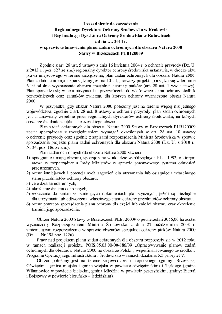 Uzasadnienie do zarządzenia Regionalnego Dyrektora Ochrony Środowiska w Krakowie i Regionalnego Dyrektora Ochrony Środowiska w Katowicach z dnia …. 2014 r. w sprawie ustanowienia planu zadań ochronnych dla obszaru Natura 2000 Stawy w Brzeszczach PLB120009 Zgodnie z art. 28 ust. 5 ustawy z dnia 16 kwietnia 2004 r. o ochronie przyrody (Dz. U. z 2013 r., poz. 627 ze zm.) regionalny dyrektor ochrony środowiska ustanawia, w drodze aktu prawa miejscowego w formie zarządzenia, plan zadań ochronnych dla obszaru Natura 2000. Plan zadań ochronnych sporządzany jest na 10 lat, pierwszy projekt sporządza się w terminie 6 lat od dnia wyznaczenia obszaru specjalnej ochrony ptaków (art. 28 ust. 1 ww. ustawy). Plan sporządza się w celu utrzymania i przywrócenia do właściwego stanu ochrony siedlisk przyrodniczych oraz gatunków zwierząt, dla których ochrony wyznaczono obszar Natura 2000. W przypadku, gdy obszar Natura 2000 położony jest na terenie więcej niż jednego województwa, zgodnie z art. 28 ust. 8 ustawy o ochronie przyrody, plan zadań ochronnych jest ustanawiany wspólnie przez regionalnych dyrektorów ochrony środowiska, na których obszarze działania znajdują się części tego obszaru. Plan zadań ochronnych dla obszaru Natura 2000 Stawy w Brzeszczach PLB120009 został sporządzony z uwzględnieniem wymagań określonych w art. 28 ust. 10 ustawy o ochronie przyrody oraz zgodnie z zapisami rozporządzenia Ministra Środowiska w sprawie sporządzania projektu planu zadań ochronnych dla obszaru Natura 2000 (Dz. U. z 2010 r., Nr 34, poz. 186 ze zm.). Plan zadań ochronnych dla obszaru Natura 2000 zawiera: 1) opis granic i mapę obszaru, sporządzone w układzie współrzędnych PL – 1992, o którym mowa w rozporządzeniu Rady Ministrów w sprawie państwowego systemu odniesień przestrzennych, 2) ocenę istniejących i potencjalnych zagrożeń dla utrzymania lub osiągnięcia właściwego stanu przedmiotów ochrony obszaru, 3) cele działań ochronnych, 4) określenie działań ochronnych, 5) wskazania do zmian w istniejących dokumentach planistycznych, jeżeli są niezbędne dla utrzymania lub odtworzenia właściwego stanu ochrony przedmiotów ochrony obszaru, 6) ocenę potrzeby sporządzenia planu ochrony dla części lub całości obszaru oraz określenie terminu jego sporządzenia. Obszar Natura 2000 Stawy w Brzeszczach PLB120009 o powierzchni 3066,00 ha został wyznaczony Rozporządzeniem Ministra Środowiska z dnia 27 października 2008 r. zmieniającym rozporządzenie w sprawie obszarów specjalnej ochrony ptaków Natura 2000 (Dz. U. Nr 198 poz. 1226). Prace nad projektem planu zadań ochronnych dla obszaru rozpoczęły się w 2012 roku w ramach realizacji projektu POIS.05.03.00-00-186/09 „Opracowywanie planów zadań ochronnych dla obszarów Natura 2000 na obszarze Polski”, współfinansowanego ze środków Programu Operacyjnego Infrastruktura i Środowisko w ramach działania 5.3 priorytet V. Obszar położony jest na terenie województw: małopolskiego (gminy: Brzeszcze, Oświęcim – gmina miejska i gmina wiejska w powiecie oświęcimskim) i śląskiego (gmina Wilamowice w powiecie bielskim, gmina Miedźna w powiecie pszczyńskim, gminy: Bieruń i Bojszowy w powiecie bieruńsko – lędzińskim). Dokumentacja planu zadań ochronnych dla obszaru Natura 2000 Stawy w Brzeszczach PLB120009 powstała na skutek zgromadzenia i uzupełnienia informacji o obszarze i przedmiotach ochrony z uwzględnieniem uwarunkowań geograficznych, przyrodniczych, społecznych, gospodarczych i kulturowych, kierunków rozwoju społecznego i gospodarczego. W tym celu przeanalizowano m.in. istniejące i projektowane miejscowe plany zagospodarowania, studia uwarunkowań i kierunków zagospodarowania przestrzennego gmin, plany urządzania lasu, strategie i programy dotyczące obszaru lub mogące mieć na niego wpływ. W trakcie prac terenowych nad planem zweryfikowano listę przedmiotów ochrony w obszarze oraz określono stan zachowania stanowisk i siedlisk gatunków. Zaproponowano dodanie do listy przedmiotów ochrony ośmiu gatunków ptaków, dla których obszar Natura 2000 stanowi ważną ostoję: głowienki (Aythya ferina, kod A059), perkoza dwuczubego (Podiceps cristatus, kod A005), perkozka (Tachybaptus ruficollis, kod A004), bąka (Botaurus stellaris, kod A021), kokoszki (Gallinula chloropus, kod A123), rybitwy czarnej (Chlidonias niger, kod A197), rybitwy rzecznej (Sterna hirundo, kod A193), zimorodka (Alcedo atthis, kod A229). Propozycja ta została zaakceptowana przez Generalną Dyrekcją Ochrony Środowiska, a zaktualizowana wersja Standardowego Formularza Danych została opublikowana na stronie internetowej GDOŚ http://natura2000.gdos.gov.pl/. Aktualnie przedmiotami ochrony w obszarze jest 17 gatunków ptaków: perkozek (Tachybaptus ruficollis, kod A004), perkoz dwuczuby (Podiceps cristatus, kod A005), zausznik (Podiceps nigricollis, kod A008), bąk (Botaurus stellaris, kod A021), bączek (Ixobrychus minutus, kod A022), ślepowron (Nycticorax nycticorax, kod A023), krakwa (Anas strepera, kod A051), głowienka (Aythya ferina, kod A059), czernica (Aythya fuligula, kod A061), kokoszka (Gallinula chloropus, kod A123), krwawodziób (Tringa totanus, kod A162), mewa czarnogłowa (Larus melanocephalus, kod A176), śmieszka (Larus ridibundus, kod A179), rybitwa rzeczna (Sterna hirundo, kod A193), rybitwa białowąsa (Chlidonias hybrida, kod A196), rybitwa czarna (Chlidonias niger, kod A197), zimorodek (Alcedo atthis, kod A229). Za główne zagrożenia dla przedmiotów ochrony w obszarze Natura 2000 Stawy w Brzeszczach PLB120009 uznano: • całkowite zaniechanie prowadzenia gospodarki stawowej w całych kompleksach stawów lub ich części, powodujące zmniejszenie siedlisk dogodnych dla ptaków, • zmniejszenie powierzchni siedlisk ptaków takich jak: szuwary, płaty roślinności wynurzonej o liściach pływających, zakrzewienia i zadrzewienia na wyspach, groblach i wzd