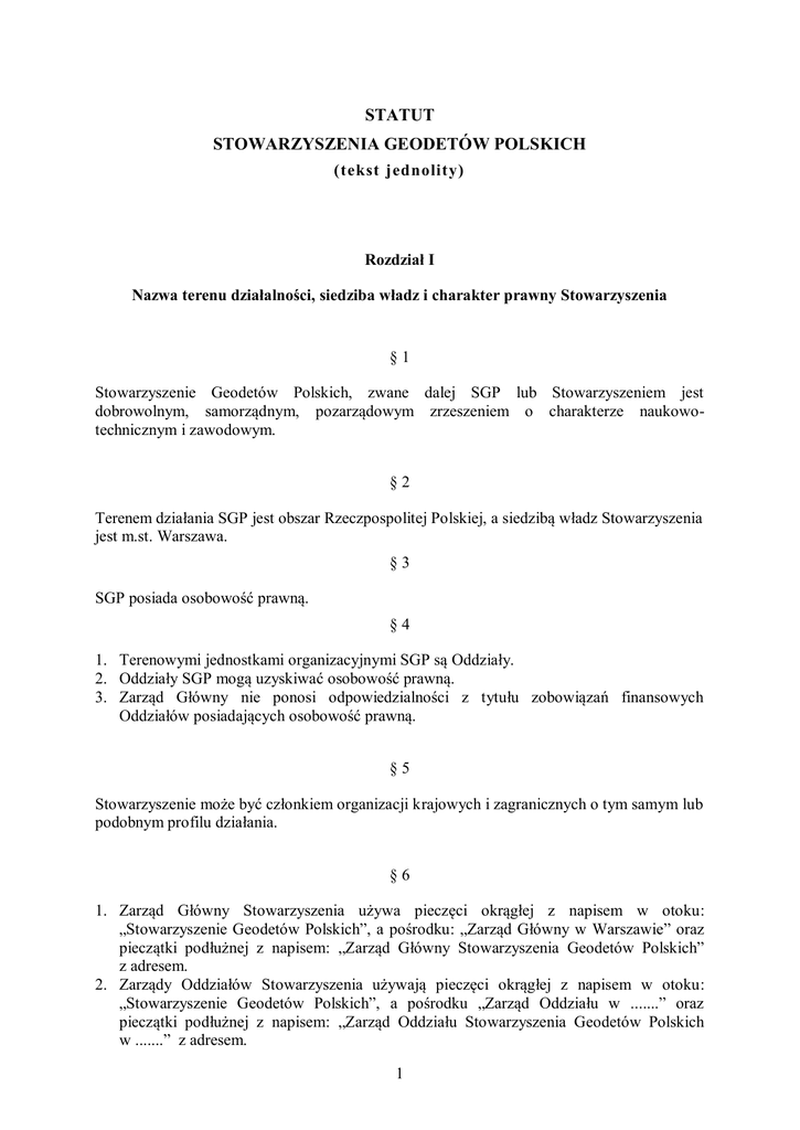 STATUT STOWARZYSZENIA GEODETÓW POLSKICH (tekst jednolity) Rozdział I Nazwa terenu działalności, siedziba władz i charakter prawny Stowarzyszenia §1 Stowarzyszenie Geodetów Polskich, zwane dalej SGP lub Stowarzyszeniem jest dobrowolnym, samorządnym, pozarządowym zrzeszeniem o charakterze naukowotechnicznym i zawodowym. §2 Terenem działania SGP jest obszar Rzeczpospolitej Polskiej, a siedzibą władz Stowarzyszenia jest m.st. Warszawa. §3 SGP posiada osobowość prawną. §4 1. Terenowymi jednostkami organizacyjnymi SGP są Oddziały. 2. Oddziały SGP mogą uzyskiwać osobowość prawną. 3. Zarząd Główny nie ponosi odpowiedzialności z tytułu zobowiązań finansowych Oddziałów posiadających osobowość prawną. §5 Stowarzyszenie może być członkiem organizacji krajowych i zagranicznych o tym samym lub podobnym profilu działania. §6 1. Zarząd Główny Stowarzyszenia używa pieczęci okrągłej z napisem w otoku: „Stowarzyszenie Geodetów Polskich”, a pośrodku: „Zarząd Główny w Warszawie” oraz pieczątki podłużnej z napisem: „Zarząd Główny Stowarzyszenia Geodetów Polskich” z adresem. 2. Zarządy Oddziałów Stowarzyszenia używają pieczęci okrągłej z napisem w otoku: „Stowarzyszenie Geodetów Polskich”, a pośrodku „Zarząd Oddziału w .......” oraz pieczątki podłużnej z napisem: „Zarząd Oddziału Stowarzyszenia Geodetów Polskich w .......” z adresem. 1 §7 Stowarzyszenie może posiadać sztandar oraz odznaki: organizacyjną i honorowe, na podstawie uzyskanych zezwoleń. §8 Stowarzyszenie opiera swoją działalność na pracy społecznej ogółu członków. Do prowadzenia swych spraw może zatrudniać pracowników. Rozdział II Cele i środki działania §9 Celem SGP jest: 1. zrzeszanie inżynierów i techników ze specjalnością z zakresu geodezji i kartografii oraz innych osób wymienionych w rozdziale III, 2. współdziałanie z właściwymi jednostkami w zakresie rozwoju techniki i produkcji, wdrażanie osiągnięć naukowo-technicznych w dziedzinie geodezji i kartografii oraz w zakresie bhp, ochrony pracy i zawodu, a ponadto szkolenia kadr, 3. podnoszenie poziomu wiedzy, kultury technicznej i kwalifikacji oraz kształtowanie właściwego poziomu etyki zawodowej członków Stowarzyszenia, 4. popularyzacja w społeczeństwie zagadnień technicznych i ekonomicznych z dziedziny geodezji i kartografii, 5. inicjowanie, popieranie i prowadzenie wymiany doświadczeń organizacyjnych i naukowo-technicznych z zagranicą, 6. reprezentowanie w kraju i za granicą inżynierów i techników zrzeszonych w SGP. § 10 Stowarzyszenie realizuje swoje cele w szczególności przez: 1. współdziałanie z administracją rządową i samorządową, jednostkami gospodarczymi, społecznymi i zawodowymi w dziedzinach objętych działalnością SGP, 2. organizowanie zebrań, zjazdów, narad, konferencji naukowo-technicznych, sympozjów, konkursów, wystaw, pokazów, wycieczek naukowo-technicznych i rozwijanie życia towarzyskiego wśród członków, 3. prowadzenie działalności szkoleniowej, 4. współdziałanie w rozwoju piśmiennictwa, bibliotek oraz informacji naukowotechnicznej i ekonomicznej w dziedzinie geodezji i kartografii, 5. współpracę z krajowymi i zagranicznymi organizacjami naukowo-technicznymi o tym samym lub podobnym zakresie działania, 6. współdziałanie przy podnoszeniu jakości prac geodezyjnych, 7. prowadzenie doradztwa i rzeczoznawstwa, 8. inicjowanie i współdziałanie w zakresie ustalania i stosowania kryteriów kwalifikacji zawodowych oraz udzielania pomocy swym członkom w tym zakresie, 2 9. udzielanie pomocy w zakresie potrzeb bytowych członków SGP, na zasadach uchwalonych przez Zjazd Delegatów SGP, 10. opiniowanie i zgłaszanie wniosków w sprawie nagród i odznaczeń dla członków SGP, 11. nadawanie tytułu rzeczoznawcy swym członkom, na podstawie określonego przewodu kwalifikacyjnego i prowadzenie przewodów kwalifikacyjnych związanych ze specjalnością zawodową inżynierów i techników, 12. udzielanie i pozbawianie rekomendacji firmom i instytucjom w dziedzinach reprezentowanych przez SGP, na podstawie regulaminu uchwalonego przez Zarząd Główny. Rozdział III Członkowie, ich prawa i obowiązki § 11 Członkowie SGP dzielą się na: 1. zwyczajnych, 2. wspierających, 3. honorowych. § 12 1. Członkami zwyczajnymi SGP mogą być: a) inżynierowie i technicy ze specjalnością z zakresu geodezji i kartografii, b) inni specjaliści, będący członkami jednej z sekcji SGP, posiadający znaczne osiągnięcia zawodowe w dziedzinie geodezji i kartografii oraz prezentujący wysoki poziom etyki zawodowej, c) studenci kierunków geodezyjnych poczynając od trzeciego roku studiów. 2. Stwierdzenia warunków, o których mowa w ust. 1 dokonuje Zarząd Oddziału, kierując się regulaminem określonym przez Zarząd Główny SGP. § 13 Członek zwyczajny Stowarzyszenia ma prawo: 1. czynnego i biernego wyboru do władz SGP zgodnie z postanowieniami niniejszego Statutu, 2. brania udziału w zebraniach oraz imprezach organizowanych przez Stowarzyszenie, 3. korzystania z pomocy Stowarzyszenia w podwyższaniu kwalifikacji zawodowych, doradztwa naukowo-technicznego oraz opiniowania jego prac, 4. działania w pracach sekcji i komisji zgodnie z posiadaną specjalnością oraz zainteresowaniami, na podstawie regulaminów tych jednostek, 5. ubiegania się o tytuł rzeczoznawcy SGP, 6. korzystania z lokali i urządzeń SGP oraz Domów Technika zgodnie z obowiązującymi regulaminami, 3 7. korzystania z różnych form pomocy bytowej i koleżeńskiej organizowanej przez Stowarzyszenie, 8. korzystania z ulgowej prenumeraty czasopism i innych wydawnictw naukowotechnicznych w zakresie określonym przez Zarząd Główny, 9. noszenia odznaki SGP i NOT, 10. niepłacenia składki przez członka SGP po ukończeniu 75-ciu lat życia oraz inwalidów I grupy. § 14 Członek zwyczajny jest zobowiązany do: 1. przestrzegania postanow