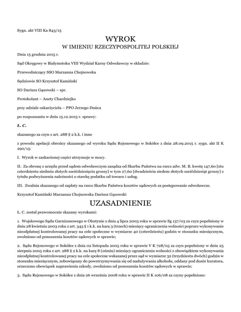 Sygn. akt VIII Ka 843/15 WYROK W IMIENIU RZECZYPOSPOLITEJ POLSKIEJ Dnia 15 grudnia 2015 r. Sąd Okręgowy w Białymstoku VIII Wydział Karny Odwoławczy w składzie: Przewodniczący SSO Marzanna Chojnowska Sędziowie SO Krzysztof Kamiński SO Dariusz Gąsowski – spr. Protokolant – Anety Chardziejko przy udziale oskarżyciela – PPO Jerzego Duńca po rozpoznaniu w dniu 15.12.2015 r. sprawy: Ł. C. skazanego za czyn z art. 288 § 2 k.k. i inne z powodu apelacji obrońcy skazanego od wyroku Sądu Rejonowego w Sokółce z dnia 28.09.2015 r. sygn. akt II K 290/15: I. Wyrok w zaskarżonej części utrzymuje w mocy. II. Za obronę z urzędu przed sądem odwoławczym zasądza od Skarbu Państwa na rzecz adw. M. B. kwotę 147,60 [stu czterdziestu siedmiu złotych sześćdziesięciu groszy] w tym 27,60 [dwadzieścia siedem złotych sześćdziesiąt groszy] z tytułu podwyższenia należności o stawkę podatku od towaru i usług. III. Zwalnia skazanego od zapłaty na rzecz Skarbu Państwa kosztów sądowych za postępowanie odwoławcze. Krzysztof Kamiński Marzanna Chojnowska Dariusz Gąsowski UZASADNIENIE Ł. C. został prawomocnie skazany wyrokami: 1. Wojskowego Sądu Garnizonowego w Olsztynie z dnia 4 lipca 2003 roku w sprawie Sg 137/03 za czyn popełniony w dniu 28 kwietnia 2003 roku z art. 343 § 1 k.k. na karę 3 (trzech) miesięcy ograniczenia wolności poprzez wykonywanie nieodpłatnej kontrolowanej pracy na cele społeczne w wymiarze 40 (czterdziestu) godzin w stosunku miesięcznym, zwolniono od ponoszenia kosztów sądowych w sprawie; 2. Sądu Rejonowego w Sokółce z dnia 02 listopada 2005 roku w sprawie V K 728/05 za czyn popełniony w dniu 25 sierpnia 2005 roku z art. 288 § 2 k.k. na karę 8 (ośmiu) miesięcy ograniczenia wolności z obowiązkiem wykonywania nieodpłatnej kontrolowanej pracy na cele społeczne wskazanej przez sąd w wymiarze 32 (trzydziestu dwóch) godzin w stosunku miesięcznym, zobowiązany do powstrzymywania się od nadużywania alkoholu, oddany pod dozór kuratora, orzeczono obowiązek naprawienia szkody, zwolniono od ponoszenia kosztów sądowych w sprawie; 3. Sądu Rejonowego w Sokółce z dnia 26 września 2008 roku w sprawie II K 106/08 za czyny popełnione: - w nocy z 7 na 8 czerwca 2008 roku z art. 280 § 1 k.k. w zb. z art. 158 § 1 k.k. na karę 2 (dwóch) lat i 6 (sześciu) miesięcy pozbawienia wolności - w nocy z 7 na 8 czerwca 2008 roku z art. 278 § 1 k.k. na karę 10 (dziesięciu) miesięcy pozbawienia wolności, oraz wymierzono za wszystkie czyny karę łączną 2 (dwóch) lat i 8 (ośmiu) miesięcy pozbawienia wolności, zobowiązano do naprawienia szkody, zaliczono okres rzeczywistego pozbawienia wolności w sprawie, zwolniono oskarżonego od zapłaty na rzecz Skarbu Państwa kosztów sądowych w sprawie; 4. Sądu Rejonowego w Sokółce z dnia 28 lutego 2013 roku w sprawie II K 1014/12, zmienionego wyrokiem Sądu Okręgowego w Białymstoku z dnia 14 maja 2013 roku w sprawie VIII Ka 289/13 za czyny popełnione: - w dniu 28 lipca 2012 roku z art. 288 § 1 k.k. w zw. z art. 64 § 1 k.k. na karę 6 (sześciu) miesięcy pozbawienia wolności - w dniu 6 sierpnia 2012 roku z art. 278 § 1 k.k. w zw. z art. 64 § 1 k.k. na karę 10 (dziesięciu) miesięcy pozbawienia wolności, oraz wymierzono oskarżonemu za wszystkie czyny karę łączną 1 (jednego) roku pozbawienia wolności, której wykonanie warunkowo zawieszono tytułem próby na okres 5 lat, oddano oskarżonego pod dozór kuratora, zobowiązano do powstrzymywania się od nadużywania alkoholu, nałożono obowiązek naprawienia szkody, na poczet orzeczonej kary pozbawienia wolności zaliczono okres zatrzymania w sprawie w dniach 28-29 lipca 2012 roku i 6-7 sierpnia 2012 roku i zwolniono od zapłaty na rzecz Skarbu Państwa kosztów sądowych; następnie postanowieniem Sądu Rejonowego w Pszczynie z dnia 20 listopada 2014 roku zarządzono wykonanie orzeczonej kary łącznej 1 (jednego) roku pozbawienia wolności 5. Sądu Rejonowego w Sokółce z dnia 5 czerwca 2013 roku w sprawie II K 210/13, utrzymanym w mocy wyrokiem Sądu Okręgowego w Białymstoku z dnia 12 września 2013 roku w sprawie sygn. akt VIII Ka 647/13 za czyn popełniony w okresie od 20 czerwca 2012 roku do 03 grudnia 2012 roku z art. 207 § 1 k.k. na karę 1 (jednego) roku pozbawienia wolności i zwolniono od ponoszenia kosztów sądowych w sprawie. Sąd Rejonowy w Sokółce wyrokiem z dnia 28 września 2015r. w sprawie sygn. akt II K 290/15 na mocy art. 85 k.k., art. 86 § 1 k.k. w brzmieniu obowiązującym przed wejściem w życie ustawy z dnia 20 lutego 2015 r. o zmianie ustawy – Kodeks karny oraz niektórych innych ustaw (Dz. U. z 20 marca 2015 r., poz. 396) w zw. z art. 19 ust. 1 ustawy z dnia 20 lutego 2015 r. o zmianie ustawy – Kodeks karny oraz niektórych innych ustaw (Dz. U. z 20 marca 2015 r., poz. 396), połączył skazanemu Ł. C. kary orzeczone wyrokami: - Sądu Rejonowego w Sokółce z dnia 28 lutego 2013 roku w sprawie II K 1014/12 za czyny popełnione: a) w dniu 28 lipca 2012 roku kwalifikowany z art. 288 § 1 k.k. w zw. z art. 64 § 1 k.k. w wymiarze 6 (sześciu) miesięcy pozbawienia wolności, b) w dniu 6 sierpnia 2012 roku kwalifikowany z art. 278 § 1 k.k. w wymiarze 10 (dziesięciu) miesięcy pozbawienia wolności - Sądu Rejonowego w Sokółce z dnia 5 czerwca 2013 roku w sprawie II K 210/13 za czyn popełniony w okresie od 20 czerwca 2012 roku do 03 grudnia 2012 roku kwalifikowany z art. 207 § 1 k.k. w wymiarze 1 (jednego) roku pozbawienia wolności i wymierzył mu karę łączną 1 (jednego) roku i 8 (ośmiu) miesięcy pozbawienia wolności. Na mocy art. 577 k.p.k. w zw. z art. 63 § 1 k.k. w brzmieniu obowiązującym przed wejściem w życie ustawy z dnia 20 lutego 2015 r. o zmianie ustawy – Kodeks karny oraz niektórych innych ustaw (Dz. U. z 20 marca 2015 r., poz. 396) w zw. z art. 19 ust. 1 ustawy z dnia 20 lutego 2015 r. o zmianie ustawy – Kodeks karny oraz niektórych innych ustaw (Dz. 
