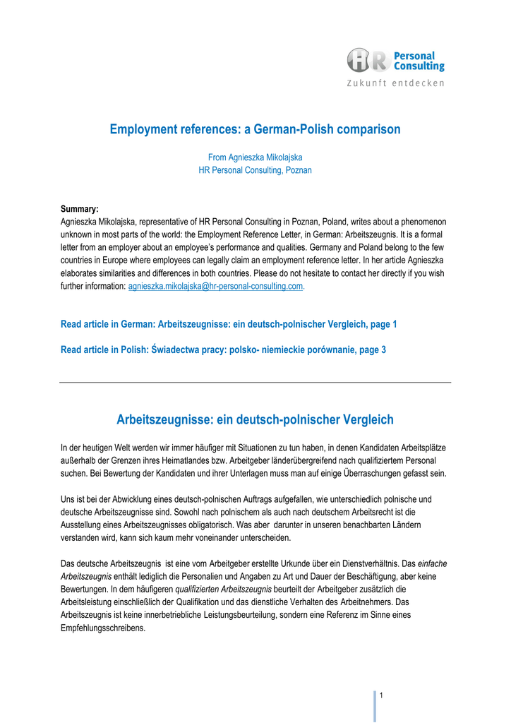 Employment references: a German-Polish comparison From Agnieszka Mikolajska HR Personal Consulting, Poznan Summary: Agnieszka Mikolajska, representative of HR Personal Consulting in Poznan, Poland, writes about a phenomenon unknown in most parts of the world: the Employment Reference Letter, in German: Arbeitszeugnis. It is a formal letter from an employer about an employee’s performance and qualities. Germany and Poland belong to the few countries in Europe where employees can legally claim an employment reference letter. In her article Agnieszka elaborates similarities and differences in both countries. Please do not hesitate to contact her directly if you wish further information: [email protected]. Read article in German: Arbeitszeugnisse: ein deutsch-polnischer Vergleich, page 1 Read article in Polish: Úwiadectwa pracy: polsko- niemieckie porównanie, page 3 Arbeitszeugnisse: ein deutsch-polnischer Vergleich In der heutigen Welt werden wir immer häufiger mit Situationen zu tun haben, in denen Kandidaten Arbeitsplätze außerhalb der Grenzen ihres Heimatlandes bzw. Arbeitgeber länderübergreifend nach qualifiziertem Personal suchen. Bei Bewertung der Kandidaten und ihrer Unterlagen muss man auf einige Überraschungen gefasst sein. Uns ist bei der Abwicklung eines deutsch-polnischen Auftrags aufgefallen, wie unterschiedlich polnische und deutsche Arbeitszeugnisse sind. Sowohl nach polnischem als auch nach deutschem Arbeitsrecht ist die Ausstellung eines Arbeitszeugnisses obligatorisch. Was aber darunter in unseren benachbarten Ländern verstanden wird, kann sich kaum mehr voneinander unterscheiden. Das deutsche Arbeitszeugnis ist eine vom Arbeitgeber erstellte Urkunde über ein Dienstverhältnis. Das einfache Arbeitszeugnis enthält lediglich die Personalien und Angaben zu Art und Dauer der Beschäftigung, aber keine Bewertungen. In dem häufigeren qualifizierten Arbeitszeugnis beurteilt der Arbeitgeber zusätzlich die Arbeitsleistung einschließlich der Qualifikation und das dienstliche Verhalten des Arbeitnehmers. Das Arbeitszeugnis ist keine innerbetriebliche Leistungsbeurteilung, sondern eine Referenz im Sinne eines Empfehlungsschreibens. 1 Nach der Rechtsprechung muss das Zeugnis wohlwollend formuliert sein, um dem Arbeitnehmer das berufliche Fortkommen nicht zu erschweren. Dadurch erweckt das Dokument auf einen ungeübten Leser auf den ersten Blick einen positiven Eindruck. Für ein polnisches Auge wirkt es verblüffend, weil man ohne entsprechende Schulung und Erfahrung kaum relevante Informationen herauslesen kann. Geübte Personalberater und Personalmanager wissen aber genau, wie man zwischen den Zeilen zu lesen hat und welche Schattierungen unter scheinbar nur positiven Meinungen verborgen sind. Um nur ein Beispiel zu nennen: „Mit seinen Leistungen waren wir zufrieden“ – bedeutet im Zeugniscode eine Leistung, die gerade noch mit ausreichend (Schulnote 4) bewertet werden kann. Ähnliche Beispiele kann man zahlreich nennen. Deswegen muss man bei Prüfung der Zeugnisse ganz genau auf die Wahl der Verben („kann“, „ist in der Lage“, „verfügt“, „überzeugt“ usw. versus „ist bestrebt“, „ist bemüht“, ) sowie auch auf begleitende Adverbien und Adjektive (oder dessen Ausbleiben) achten („stets“ „jederzeit“, „selbständig“, „sicher“, versus „im Wesentlichen“, „in der Regel“). Wenn ein Merkmal, dessen Vorhandensein man bei einem Angestellten erwartet, ausbleibt, so kann der Prüfer daraus einen Schluss ziehen, dass sich der Zeugnisaussteller nicht dazu entschließen konnte, diesbezüglich eine positive Beurteilung zu nennen. Die richtige Auslegung eines qualifizierten deutschen Arbeitszeugnisses ist also schon eine Kunst für sich. Ein Arbeitszeugnis in Polen ist dagegen völlig anders. Es ist ein sehr offizielles Dokument, dessen Inhalt streng vorgeschrieben ist. Es darf keinerlei Wertung beinhalten, dafür aber ganz viele trockene Tatsachen. Um nur die wichtigsten neben den Personalien zu nennen: Dauer des Arbeitsverhältnisses Auflistung aller Arbeitspositionen alle Arbeitsabwesenheiten mit ihrer Art und Länge genutzte und verbliebene Urlaubstage Art und Ursache der Auflösung des Arbeitsverhältnisses. Auf den ersten Blick wirkt dieses Dokument ebenfalls verblüffend uninformativ (und kommt dem einfachen Arbeitszeugnis in Deutschland schon recht nahe), beinhaltet aber doch auch Signale, auf die ein erfahrener Personaler achtet. Die genaue Auflistung der Positionen erlaubt, weitgehende Schlüsse über die Entwicklung des Kandidaten beim Arbeitgeber zu ziehen. In Polen wird auch auf längere Unterbrechungen zwischen einzelnen Anstellungen geachtet sowie auf häufige Krankheiten, die jedem Arbeitszeugnis zu entnehmen sind. Besonders genau zu prüfen ist die Art und Weise, wie das Arbeitsverhältnis aufgelöst wurde. Im polnischen Arbeitszeugnis findet man zwar nur die Rechtsgrundlagen und Verweise auf konkrete Vorschriften im Arbeitsgesetzbuch; ein Personalprofi wird ggf. nachhaken: 30 § 1 Pkt. 1 AGB - Parteiabrede, d.h. Arbeitnehmer und Arbeitgeber haben sich in der Regel friedlich getrennt; man sollte aber auf jeden Fall die Umstände und Ursachen hinterfragen. 30 § 1 Pkt. 2 AGB - ordnungsgemäße Kündigung mit klarer Darstellung, welche Partei (Arbeitgeber oder Arbeitnehmer) gekündigt hat. 2 30 § 1 Pkt. 3 AGB - fristlose Kündigung; beinahe selbstredend sollte hier dezidiert nachgefasst werden. 30 § 1 Pkt. 4 AGB - zeitlich befristeter Vertrag. 30 § 1 Pkt. 5 AGB - Fertigstellung der beauftragten Aufgabe / des entsprechenden Projektes. Weitergehende Bewertungen der Arbeitsleistungen und des Verhaltens des Mitarbeiters lassen sich jedoch aus einem polnischen Arbeitszeugnis nicht einmal zwischen den Zeilen herauslesen. Hier bedarf es ggf. der Einholung von ergänzenden Referenzen, die dann wiederum in Bezug auf Wahrheit und Klarheit den internationalen Gepflogenheiten entsprechen: Reden ist Silber, Schweigen kann Gold 