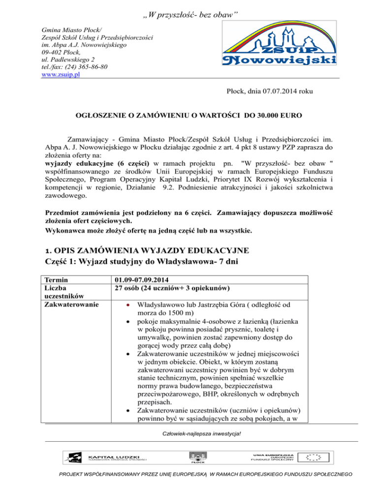 „W przyszłość- bez obaw” Gmina Miasto Płock/ Zespół Szkół Usług i Przedsiębiorczości im. Abpa A.J. Nowowiejskiego 09-402 Płock, ul. Padlewskiego 2 tel./fax: (24) 365-86-80 www.zsuip.pl Płock, dnia 07.07.2014 roku OGŁOSZENIE O ZAMÓWIENIU O WARTOŚCI DO 30.000 EURO Zamawiający - Gmina Miasto Płock/Zespół Szkół Usług i Przedsiębiorczości im. Abpa A. J. Nowowiejskiego w Płocku działając zgodnie z art. 4 pkt 8 ustawy PZP zaprasza do złożenia oferty na: wyjazdy edukacyjne (6 części) w ramach projektu pn. "W przyszłość- bez obaw " współfinansowanego ze środków Unii Europejskiej w ramach Europejskiego Funduszu Społecznego, Program Operacyjny Kapitał Ludzki, Priorytet IX Rozwój wykształcenia i kompetencji w regionie, Działanie 9.2. Podniesienie atrakcyjności i jakości szkolnictwa zawodowego. Przedmiot zamówienia jest podzielony na 6 części. Zamawiający dopuszcza możliwość złożenia ofert częściowych. Wykonawca może złożyć ofertę na jedną część lub na wszystkie. OPIS ZAMÓWIENIA WYJAZDY EDUKACYJNE Część 1: Wyjazd studyjny do Władysławowa- 7 dni 1. Termin Liczba uczestników Zakwaterowanie 01.09-07.09.2014 27 osób (24 uczniów+ 3 opiekunów) Władysławowo lub Jastrzębia Góra ( odległość od morza do 1500 m) pokoje maksymalnie 4-osobowe z łazienką (łazienka w pokoju powinna posiadać prysznic, toaletę i umywalkę, powinien zostać zapewniony dostęp do gorącej wody przez całą dobę) Zakwaterowanie uczestników w jednej miejscowości w jednym obiekcie. Obiekt, w którym zostaną zakwaterowani uczestnicy powinien być w dobrym stanie technicznym, powinien spełniać wszelkie normy prawa budowlanego, bezpieczeństwa przeciwpożarowego, BHP, określonych w odrębnych przepisach. Zakwaterowanie uczestników (uczniów i opiekunów) powinno być w sąsiadujących ze sobą pokojach, a w Człowiek-najlepsza inwestycja! PROJEKT WSPÓŁFINANSOWANY PRZEZ UNIĘ EUROPEJSKĄ W RAMACH EUROPEJSKIEGO FUNDUSZU SPOŁECZNEGO „W przyszłość- bez obaw” Gmina Miasto Płock/ Zespół Szkół Usług i Przedsiębiorczości im. Abpa A.J. Nowowiejskiego 09-402 Płock, ul. Padlewskiego 2 tel./fax: (24) 365-86-80 www.zsuip.pl przypadku zakwaterowania uczestników na sąsiadujących kondygnacjach na każdej z nich musi znajdować się pokój opiekunów. Pokoje spełniać muszą następujące kryteria: niezawilgocone i niezagrzybione, czyste, estetyczne, z wyposażeniem w dobrym stanie technicznym. Obiekt, w którym zostaną zakwaterowani uczestnicy powinien spełniać wszystkie wymogi zawarte w Rozporządzeniu Ministra Edukacji Narodowej z dnia 21 stycznia 1997 roku w sprawie warunków, jakie muszą spełniać organizatorzy wypoczynku dzieci i młodzieży szkolnej, a także zasad jego organizowania i nadzorowania (Dz.U. z 1997r. nr 12, poz. 67) Wyżywienie Wyżywienie w obiekcie noclegowym Wyjazd rozpoczyna się kolacją kończy śniadaniem Trzy posiłki dziennie: śniadania i kolacje w formie szwedzkiego stołu, obiady porcjowane Wyżywienie: obiad, dwudaniowy: I danie – zupa 350g/os, II danie – 110g/os, ziemniaki, frytki itp. 200g/os, surówka 200g/os, deser - 200g/os, napój – sok owocowy 300ml/os – podane gramatury są wielkością minimalną. Suchy prowiant w dniu wyjazdu (minimum: trzy kanapki, owoce, słodka bułkę, oraz sok (co najmniej 0,5l na osobę) i woda mineralna niegazowana (co najmniej 1 litr na osobę) w oryginalnie zamkniętych opakowaniach. Transport Dieta bezglutenowa dla jednego uczestnika śniadanie, obiad, kolacja i suchy prowiant. Przejazd z Płocka do miejsca zakwaterowania i z powrotem autokarem klasy turystycznej. Środek transportu powinien być wyposażony w WC, klimatyzację oraz wygodne fotele. Pojazd musi spełniać wszelkie wymogi bezpieczeństwa dotyczące przewozu młodzieży, posiadać wszystkie aktualne dokumenty wymagane do przewozu pasażerów i Człowiek-najlepsza inwestycja! PROJEKT WSPÓŁFINANSOWANY PRZEZ UNIĘ EUROPEJSKĄ W RAMACH EUROPEJSKIEGO FUNDUSZU SPOŁECZNEGO „W przyszłość- bez obaw” Gmina Miasto Płock/ Zespół Szkół Usług i Przedsiębiorczości im. Abpa A.J. Nowowiejskiego 09-402 Płock, ul. Padlewskiego 2 tel./fax: (24) 365-86-80 www.zsuip.pl Dodatkowe wymagania poruszania się pojazdów po drogach publicznych. Wykonawca musi zapewnić taką liczby kierowców (w odniesieniu do odległości i czasu przejazdu), która wyklucza konieczność postoju pojazdu ze względu na przerwę dla kierowców. Wymaga się, by pojazd był podstawiony na miejsce zbiórki minimum jedną godzinę przed odjazdem uczestników w celu sprawdzenia jego sprawności technicznej i innych wymogów Zamawiającego, w tym kontroli policyjnej. Miejsce zbiórki zostanie ustalone z Kierownikiem wycieczki po podpisaniu umowy. W czasie całego wyjazdu Wykonawca jest zobowiązany zapewnić uczestnikom możliwość nieodpłatnego korzystania z WC na postojach i w trakcie wycieczek - zwiedzania, lub pokryć ten koszt w przypadku konieczności korzystania z WC płatnych. Wycieczka do Gdańska z przewodnikiem miejskim 4 x zajęcia z wykorzystaniem sali konferencyjnej (mała sala dla 12 uczestników) Nieodpłatny dostęp do sali gimnastycznej oraz basenu (4 wejścia dla wszystkich uczestników) Część 2: Wyjazd TOUR SALON Targi Regionów i Produktów Turystycznych w Poznaniu Termin Liczba uczestników Zwiedzanie targów 25.10.2014 27 osób (24 uczniów+ 3 opiekunów) Godziny zwiedzania 10.00-17.00 Wykonawca zobowiązany będzie w ramach zorganizowania wyjazdu zapewnić uczestnikom (27 osób): wstęp na targi oraz ich zwiedzanie wraz z przewodnikiem przez minimum 4 godziny. Człowiek-najlepsza inwestycja! PROJEKT WSPÓŁFINANSOWANY PRZEZ UNIĘ EUROPEJSKĄ W RAMACH EUROPEJSKIEGO FUNDUSZU SPOŁECZNEGO „W przyszłość- bez obaw” Gmina Miasto Płock/ Zespół Szkół Usług i Przedsiębiorczości im. Abpa A.J. Nowowiejskiego 09-402 Płock, ul. Padlewskiego 2 tel./fax: (24) 365-86-80 www.zsuip.pl Transport Wy