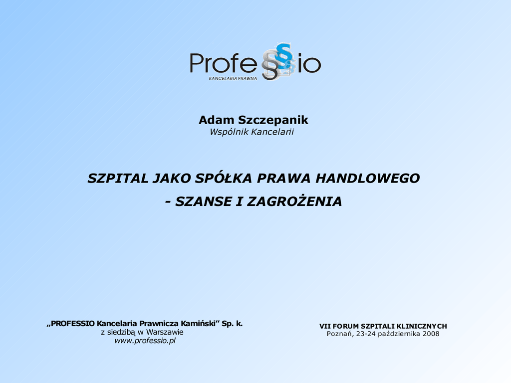 Adam Szczepanik Wspólnik Kancelarii SZPITAL JAKO SPÓŁKA PRAWA HANDLOWEGO - SZANSE I ZAGROŻENIA „PROFESSIO Kancelaria Prawnicza Kamiński” Sp. k. z siedzibą w Warszawie www.professio.pl VII FORUM SZPITALI KLINICZNYCH Poznań, 23-24 października 2008 Szpital jako spółka prawa handlowego - szanse i zagrożenia Otoczenie zmian w zakresie struktury właścicielskiej zoz: 1. Obecnie wielkość rynku usług medycznych w Polsce szacuje sie na 80 miliardów złotych 2. Prawdopodobnie wielkość rynku do roku 2015 wzrośnie dwukrotnie 3. Przewidywalny szybszy wzrost i zwiększenie udziału w rynku zakładów niepublicznych niż zakładów publicznych 4. Duże rozproszenie - największe podmioty (spółki giełdowe, zoz) mają mniej niż 1% udziału w rynku 5. Spodziewana konsolidacja rynku (przejmowanie mniejszych podmiotów realizujących świadczenia zdrowotne 2 Szpital jako spółka prawa handlowego - szanse i zagrożenia Zmiana formy prawnej SPZOZ – przekształcenie przez likwidację (stan obecny) Zalety: • rozpoczęcie działalności od początku • przejecie zadłużenia przez organ założycielski (dwa ujęcia: zaleta dla przyszłego zoz, obciążenie dla JST lub innego organu założycielskiego) • łatwiejsza restrukturyzacja zatrudnienia - art. 41(1) KP – ewentualne zastosowanie 23 (1) KP Wady: • Długotrwała procedura (konieczność jednoczesnego prowadzenia procedury likwidacyjnej SPZOZ oraz tworzenia nowej spółki) • Konieczność zawierania wszystkich umów od nowa (w tym pozyskanie majątku) również w zakresie kontraktu z NFZ (brak sukcesji) „PROFESSIO Kancelaria Prawnicza Kamiński” Sp. k. z siedzibą w Warszawie www.professio.pl VII FORUM SZPITALI KLINICZNYCH Poznań, 23-24 października 2008 Szpital jako spółka prawa handlowego - szanse i zagrożenia Założenia nowej ustawy o ZOZ - kwestie sporne • • • Obligatoryjność/dobrowolność Udziały/akcje pracownicze (nie zostały uchwalone) - przywilej dla tzw. uprawnionych pracowników do nieodpłatnego nabycia udziałów/akcji (do15% kapitału zakładowego spółki), Progi kapitałowe (nie zostały uchwalone): w publicznym zoz w formie spółki co najmniej: - 51% kapitału zakładowego należy do Skarbu Państwa lub jednostki samorządu terytorialnego - 75% kapitału zakładowego należy do publicznej uczelni medycznej, CMKP Sankcja nieważności czynności prawnych prowadzących do naruszenia w/w struktury kapitałowej „PROFESSIO Kancelaria Prawnicza Kamiński” Sp. k. z siedzibą w Warszawie www.professio.pl VII FORUM SZPITALI KLINICZNYCH Poznań, 23-24 października 2008 Szpital jako spółka prawa handlowego - szanse i zagrożenia Założenia nowej ustawy o ZOZ Art. 10. 1. Minister, centralny organ administracji rządowej, wojewoda oraz jednostka samorządu terytorialnego, może wyłącznie utworzyć: 1) spółkę z ograniczoną odpowiedzialnością albo spółkę akcyjną, prowadzącą zakład opieki zdrowotnej; 2) zakład opieki zdrowotnej w formie jednostki budżetowej albo zakładu budżetowego, w rozumieniu przepisów ustawy z dnia 30 czerwca 2005 r. o finansach publicznych. (…) 3. Publiczna uczelnia medyczna albo publiczna uczelnia prowadząca działalność dydaktyczną i badawczą w dziedzinie nauk medycznych, albo Centrum Medycznego Kształcenia Podyplomowego, może wyłącznie utworzyć spółkę z ograniczoną odpowiedzialnością albo spółkę akcyjną, prowadzącą zakład opieki zdrowotnej. „PROFESSIO Kancelaria Prawnicza Kamiński” Sp. k. z siedzibą w Warszawie www.professio.pl VII FORUM SZPITALI KLINICZNYCH Poznań, 23-24 października 2008 Szpital jako spółka prawa handlowego - szanse i zagrożenia Założenia nowej ustawy o ZOZ Art. 43. • Zawiązanie, przekształcenie i rozwiązanie sp. z o.o. albo S.A. prowadzącej zakład opieki zdrowotnej następuje na podstawie przepisów Kodeksu spółek handlowych. • Zakład opieki zdrowotnej, o którym mowa w ust. 1, jest przedsiębiorstwem w rozumieniu art. 55 (1) Kodeksu cywilnego. Spółka, o której mowa w ust. 1, może prowadzić więcej niż jeden zakład opieki zdrowotnej. • Nie wolno wprowadzać szczególnych uprawnień dla wspólników lub akcjonariuszy, w szczególności uprzywilejowanie w zakresie prawa głosu oraz w zakresie powoływania i odwoływania organów spółki. • Spółki mogą prowadzić działalność gospodarczą, inną niż prowadzenie zakładu opieki zdrowotnej, jeżeli działalność ta nie ogranicza dostępu do świadczeń zdrowotnych udzielanych w tym zakładzie. „PROFESSIO Kancelaria Prawnicza Kamiński” Sp. k. z siedzibą w Warszawie www.professio.pl VII FORUM SZPITALI KLINICZNYCH Poznań, 23-24 października 2008 Szpital jako spółka prawa handlowego - szanse i zagrożenia Założenia nowej ustawy o ZOZ Art. 45. • W zakresie nieuregulowanym w ustawie o ZOZ - do spółek stosuje się przepisy Kodeksu spółek handlowych. • Uchwały dotyczące rozwiązania spółki, zbycia zakładu opieki zdrowotnej albo jego zorganizowanej części, zbycia udziałów większościowych albo istotnej zmiany przedmiotu działalności tej spółki są podejmowane przez zgromadzenie wspólników (walne zgromadzenie) większością trzech czwartych głosów (3/4), przy czym: • zbycie zakładu opieki zdrowotnej albo udziałów większościowych wchodzi w życie po uzyskaniu zgody podmiotu, który utworzył zakład, wyrażonej w uchwale popartej większością 3/5 głosów organu stanowiącego lub w lokalnym referendum • Jeżeli bilans sporządzony przez zarząd spółki, wykaże stratę przewyższającą sumę kapitałów zapasowego i rezerwowych, zarząd jest obowiązany niezwłocznie zwołać zgromadzenie wspólników (walne zgromadzenie) w celu powzięcia uchwały dotyczącej dalszego istnienia spółki. „PROFESSIO Kancelaria Prawnicza Kamiński” Sp. k. z siedzibą w Warszawie www.professio.pl VII FORUM SZPITALI KLINICZNYCH Poznań, 23-24 października 2008 Szpital jako spółka pra
