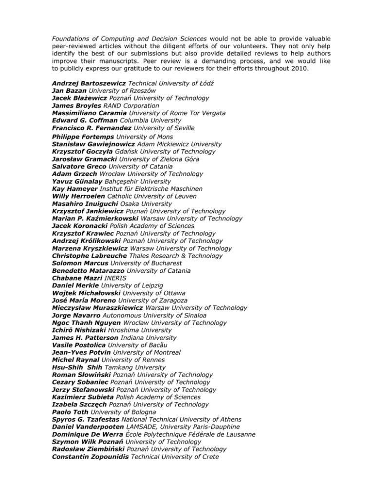 Foundations of Computing and Decision Sciences would not be able to provide valuable peer-reviewed articles without the diligent efforts of our volunteers. They not only help identify the best of our submissions but also provide detailed reviews to help authors improve their manuscripts. Peer review is a demanding process, and we would like to publicly express our gratitude to our reviewers for their efforts throughout 2010. Andrzej Bartoszewicz Technical University of Łódź Jan Bazan University of Rzeszów Jacek Błażewicz Poznań University of Technology James Broyles RAND Corporation Massimiliano Caramia University of Rome Tor Vergata Edward G. Coffman Columbia University Francisco R. Fernandez University of Seville Philippe Fortemps University of Mons Stanisław Gawiejnowicz Adam Mickiewicz University Krzysztof Goczyła Gdańsk University of Technology Jarosław Gramacki University of Zielona Góra Salvatore Greco University of Catania Adam Grzech Wrocław University of Technology Yavuz Günalay Bahçeşehir University Kay Hameyer Institut für Elektrische Maschinen Willy Herroelen Catholic University of Leuven Masahiro Inuiguchi Osaka University Krzysztof Jankiewicz Poznań University of Technology Marian P. Kaźmierkowski Warsaw University of Technology Jacek Koronacki Polish Academy of Sciences Krzysztof Krawiec Poznań University of Technology Andrzej Królikowski Poznań University of Technology Marzena Kryszkiewicz Warsaw University of Technology Christophe Labreuche Thales Research & Technology Solomon Marcus University of Bucharest Benedetto Matarazzo University of Catania Chabane Mazri INERIS Daniel Merkle University of Leipzig Wojtek Michałowski University of Ottawa José María Moreno University of Zaragoza Mieczysław Muraszkiewicz Warsaw University of Technology Jorge Navarro Autonomous University of Sinaloa Ngoc Thanh Nguyen Wrocław University of Technology Ichirō Nishizaki Hiroshima University James H. Patterson Indiana University Vasile Postolica University of Bacău Jean-Yves Potvin University of Montreal Michel Raynal University of Rennes Hsu-Shih Shih Tamkang University Roman Słowiński Poznań University of Technology Cezary Sobaniec Poznań University of Technology Jerzy Stefanowski Poznań University of Technology Kazimierz Subieta Polish Academy of Sciences Izabela Szczęch Poznań University of Technology Paolo Toth University of Bologna Spyros G. Tzafestas National Technical University of Athens Daniel Vanderpooten LAMSADE, University Paris-Dauphine Dominique De Werra École Polytechnique Fédérale de Lausanne Szymon Wilk Poznań University of Technology Radosław Ziembiński Poznań University of Technology Constantin Zopounidis Technical University of Crete