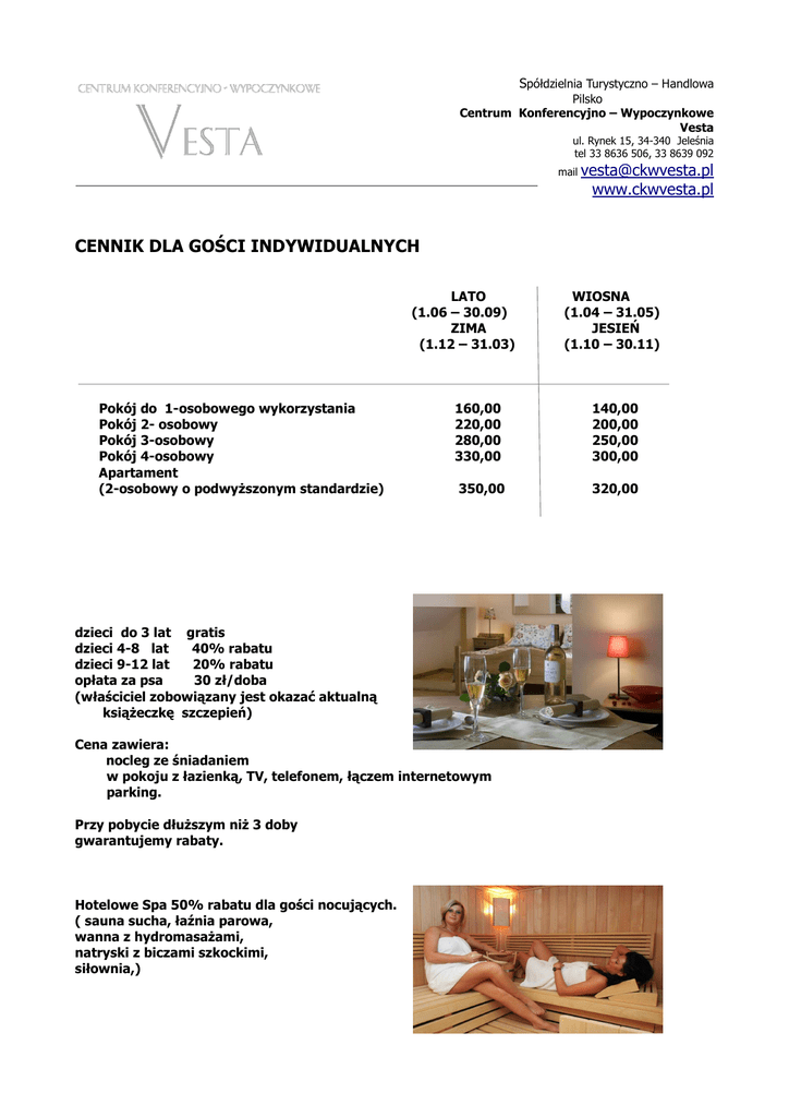 Spółdzielnia Turystyczno – Handlowa Pilsko Centrum Konferencyjno – Wypoczynkowe Vesta ul. Rynek 15, 34-340 Jeleśnia tel 33 8636 506, 33 8639 092 mail [email protected] www.ckwvesta.pl CENNIK DLA GOŚCI INDYWIDUALNYCH LATO (1.06 – 30.09) ZIMA (1.12 – 31.03) Pokój do 1-osobowego wykorzystania Pokój 2- osobowy Pokój 3-osobowy Pokój 4-osobowy Apartament (2-osobowy o podwyższonym standardzie) 160,00 220,00 280,00 330,00 140,00 200,00 250,00 300,00 350,00 320,00 dzieci do 3 lat gratis dzieci 4-8 lat 40% rabatu dzieci 9-12 lat 20% rabatu opłata za psa 30 zł/doba (właściciel zobowiązany jest okazać aktualną książeczkę szczepień) Cena zawiera: nocleg ze śniadaniem w pokoju z łazienką, TV, telefonem, łączem internetowym parking. Przy pobycie dłuższym niż 3 doby gwarantujemy rabaty. Hotelowe Spa 50% rabatu dla gości nocujących. ( sauna sucha, łaźnia parowa, wanna z hydromasażami, natryski z biczami szkockimi, siłownia,) WIOSNA (1.04 – 31.05) JESIEŃ (1.10 – 30.11)