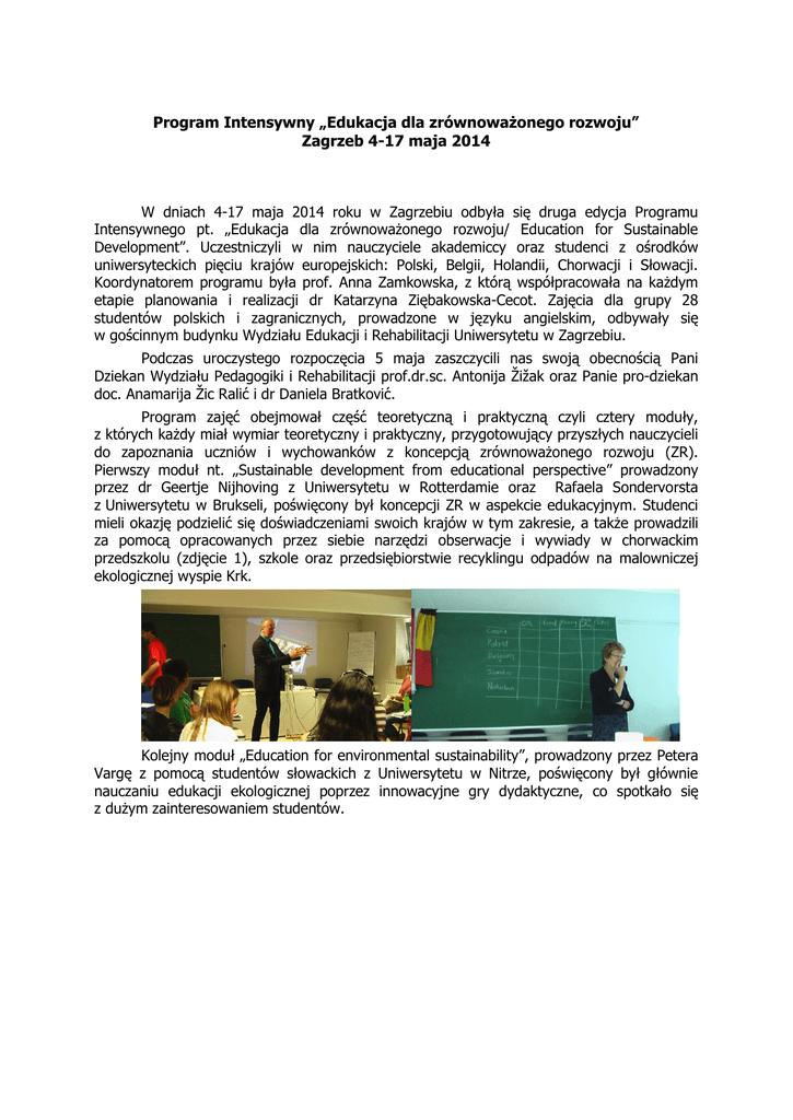 Program Intensywny „Edukacja dla zrównoważonego rozwoju” Zagrzeb 4-17 maja 2014 W dniach 4-17 maja 2014 roku w Zagrzebiu odbyła się druga edycja Programu Intensywnego pt. „Edukacja dla zrównoważonego rozwoju/ Education for Sustainable Development”. Uczestniczyli w nim nauczyciele akademiccy oraz studenci z ośrodków uniwersyteckich pięciu krajów europejskich: Polski, Belgii, Holandii, Chorwacji i Słowacji. Koordynatorem programu była prof. Anna Zamkowska, z którą współpracowała na każdym etapie planowania i realizacji dr Katarzyna Ziębakowska-Cecot. Zajęcia dla grupy 28 studentów polskich i zagranicznych, prowadzone w języku angielskim, odbywały się w gościnnym budynku Wydziału Edukacji i Rehabilitacji Uniwersytetu w Zagrzebiu. Podczas uroczystego rozpoczęcia 5 maja zaszczycili nas swoją obecnością Pani Dziekan Wydziału Pedagogiki i Rehabilitacji prof.dr.sc. Antonija Žižak oraz Panie pro-dziekan doc. Anamarija Žic Ralić i dr Daniela Bratković. Program zajęć obejmował część teoretyczną i praktyczną czyli cztery moduły, z których każdy miał wymiar teoretyczny i praktyczny, przygotowujący przyszłych nauczycieli do zapoznania uczniów i wychowanków z koncepcją zrównoważonego rozwoju (ZR). Pierwszy moduł nt. „Sustainable development from educational perspective” prowadzony przez dr Geertje Nijhoving z Uniwersytetu w Rotterdamie oraz Rafaela Sondervorsta z Uniwersytetu w Brukseli, poświęcony był koncepcji ZR w aspekcie edukacyjnym. Studenci mieli okazję podzielić się doświadczeniami swoich krajów w tym zakresie, a także prowadzili za pomocą opracowanych przez siebie narzędzi obserwacje i wywiady w chorwackim przedszkolu (zdjęcie 1), szkole oraz przedsiębiorstwie recyklingu odpadów na malowniczej ekologicznej wyspie Krk. Kolejny moduł „Education for environmental sustainability”, prowadzony przez Petera Vargę z pomocą studentów słowackich z Uniwersytetu w Nitrze, poświęcony był głównie nauczaniu edukacji ekologicznej poprzez innowacyjne gry dydaktyczne, co spotkało się z dużym zainteresowaniem studentów. Podczas realizacji kolejnego modułu „Education for social, cultural and economic sustainability” dr Natalija Lisak oraz dr Josipa Mihić zwróciły uwagę na kwestie społecznej inkluzji, wpływu kontaktu z naturą na jakość naszego życia, a także zaprezentowały elementy interesującego programu Paths służącego kształtowaniu umiejętności społecznoemocjonalnych u uczniów ze specjalnymi potrzebami edukacyjnymi. W sobotę uczestnicy Programu mogli podziwiać malownicze wodospady parku Narodowego Jezior Plitwickich, pozostawiające niezapomniane wrażenia piękna natury. W kolejnej części programu studenci opracowywali, oceniali i przygotowywali konspekty zajęć dotyczących wybranych przez uczniów tematów związanych ze zrównoważonym rozwojem (m.in. socio-emotional learning, eco houses). W drugim tygodniu każdy z uczestników prowadził zajęcia w wybranej klasie chorwackiej szkoły. Nauczyciele akademiccy prof. Anna Zamkowska i dr Katarzyna Ziębakowska-Cecot z UTH Radom, Gracia Ori z Uniwersytetu w Rotterdamie oraz dr Josipa Mihić, dr Natalija Lisak i prof. Dalibor Doležal z Uniwersytetu w Zagrzebiu, koordynowali przygotowania, hospitowali zajęcia prowadzone przez studentów oraz dokonywali ich ewaluacji. Współpraca w międzynarodowej grupie oraz prowadzenie zajęć w języku angielskim było dla studentów prawdziwym wyzwaniem, które jednakże przyniosło wiele satysfakcji w postaci pozytywnego odbioru przez uczniów, cennych sugestii ze strony osób hospitujących oraz możliwości wymiany doświadczeń. Ostatniego dnia dokonano ewaluacji strony merytorycznej i organizacyjnej Programu. Nasi goście wyjeżdżali bardzo zadowoleni z pobytu, zarówno programu zajęć, jak i strony organizacyjnej. Mamy nadzieję, że te miłe wspomnienia na długo pozostaną w ich pamięci i zaowocują dalszymi kontaktami w przyszłości. Serdecznie dziękuję prof. Daliborowi Dolezalowi, Pani Vesnie Cavic, dr Katarzynie Ziębakowskiej-Cecot oraz chorwackim szkołom i studentom za nieocenioną pomoc. Koordynator Intensywnego Programu dr hab. Anna Zamkowska, prof. UTH Rad *** Więcej szczegółów na temat zrealizowanego Programu Intensywnego „Education for Sustainable Development”, w tym materiały edukacyjne, można znaleźć na stronie internetowej http://www.ip.uniwersytetradom.pl/