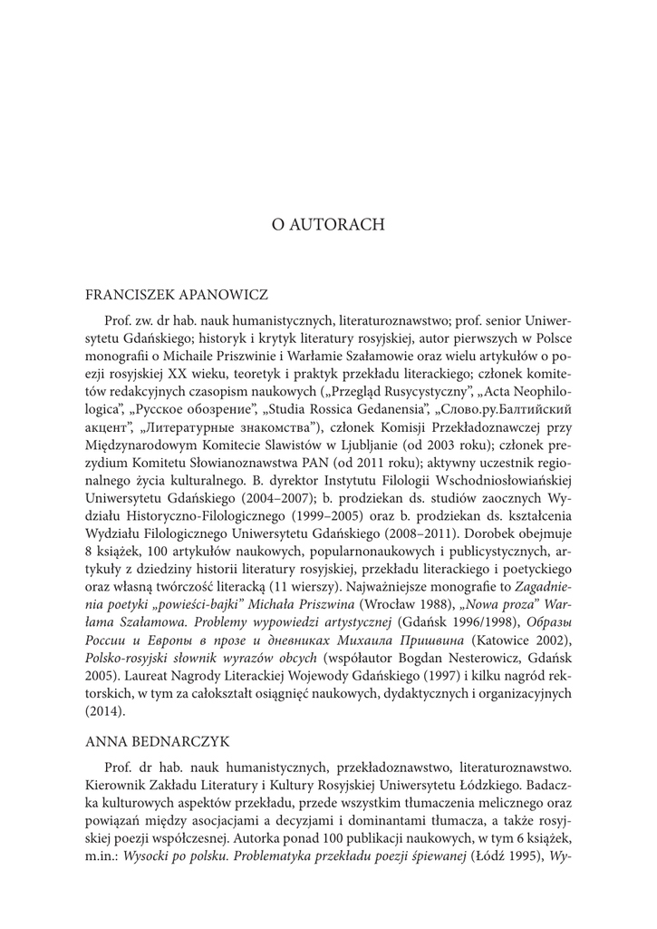 O AUTORACH FRANCISZEK APANOWICZ Prof. zw. dr hab. nauk humanistycznych, literaturoznawstwo; prof. senior Uniwersytetu Gdańskiego; historyk i krytyk literatury rosyjskiej, autor pierwszych w Polsce monografii o Michaile Priszwinie i Warłamie Szałamowie oraz wielu artykułów o poezji rosyjskiej XX wieku, teoretyk i praktyk przekładu literackiego; członek komitetów redakcyjnych czasopism naukowych („Przegląd Rusycystyczny”, „Acta Neophilologica”, „Русское обозрение”, „Studia Rossica Gedanensia”, „Слово.ру.Балтийский акцент”, „Литературные знакомства”), członek Komisji Przekładoznawczej przy Międzynarodowym Komitecie Slawistów w Ljubljanie (od 2003 roku); członek prezydium Komitetu Słowianoznawstwa PAN (od 2011 roku); aktywny uczestnik regionalnego życia kulturalnego. B. dyrektor Instytutu Filologii Wschodniosłowiańskiej Uniwersytetu Gdańskiego (2004–2007); b. prodziekan ds. studiów zaocznych Wydziału Historyczno-Filologicznego (1999–2005) oraz b. prodziekan ds. kształcenia Wydziału Filologicznego Uniwersytetu Gdańskiego (2008–2011). Dorobek obejmuje 8 książek, 100 artykułów naukowych, popularnonaukowych i publicystycznych, artykuły z dziedziny historii literatury rosyjskiej, przekładu literackiego i poetyckiego oraz własną twórczość literacką (11 wierszy). Najważniejsze monografie to Zagadnienia poetyki „powieści-bajki” Michała Priszwina (Wrocław 1988), „Nowa proza” Warłama Szałamowa. Problemy wypowiedzi artystycznej (Gdańsk 1996/1998), Образы России и Европы в прозе и дневниках Михаила Пришвина (Katowice 2002), Polsko-rosyjski słownik wyrazów obcych (współautor Bogdan Nesterowicz, Gdańsk 2005). Laureat Nagrody Literackiej Wojewody Gdańskiego (1997) i kilku nagród rektorskich, w tym za całokształt osiągnięć naukowych, dydaktycznych i organizacyjnych (2014). ANNA BEDNARCZYK Prof. dr hab. nauk humanistycznych, przekładoznawstwo, literaturoznawstwo. Kierownik Zakładu Literatury i Kultury Rosyjskiej Uniwersytetu Łódzkiego. Badaczka kulturowych aspektów przekładu, przede wszystkim tłumaczenia melicznego oraz powiązań między asocjacjami a decyzjami i dominantami tłumacza, a także rosyjskiej poezji współczesnej. Autorka ponad 100 publikacji naukowych, w tym 6 książek, m.in.: Wysocki po polsku. Problematyka przekładu poezji śpiewanej (Łódź 1995), Wy- 564 O Autorach bory translatorskie. Modyfikacja tekstu literackiego w przekładzie i kontekst asocjacyjny (Łask 2005), W poszukiwaniu dominanty translatorskiej (Warszawa 2008), Поэзия Сибири на переломе эпох (очерки о романтике и политике) (Łódź 2012) i jedynego w Polsce skryptu elektronicznego Podstawy teorii przekładu (Łódź 2009). Członek Komisji Przekładoznawczej Międzynarodowego Komitetu Slawistów. Członek redakcji i rad programowych kilku serii oraz czasopism naukowych, w tym „Między Oryginałem a Przekładem”. TATIANA V. CHERKES / ТАТЬЯНА ВЛАДИМИРОВНА ЧЕРКЕС / ТАЦЦЯНА УЛАДЗIМIРАЎНА ЧАРКЕС Starszy wykładowca w Katedrze Języka Rosyjskiego Jako Obcego i Dyscyplin Lingwistycznych w Grodzieńskim Uniwersytet Państwowym im. Janki Kupały w Grodnie (Białoruś). Autorka szeregu artykułów z zakresu glottodydaktyki, m.in. Трудности обучения научному стилю речи и конспектированию на этапе предвузовской подготовки (2014), Экскурсии как вид внеаудиторной деятельности в обучении РКИ (2014). LYUDMIL I. DIMITROV / ЛЮДМИЛ ИВАНОВ ДИМИТРОВ Dr hab. nauk filologicznych, literaturoznawstwo; profesor w Katedrze Literatury Rosyjskiej Wydziału Filologii Słowiańskich w Uniwersytecie Sofijskim im. Św. Klemensa z Ochrydy (Bułgaria), specjalista w zakresie literatury rosyjskiej XIX wieku; wykładowca historii dramaturgii rosyjskiej XIX wieku i teatrologii w College’u Teatralnym im. L. Groysa (Theatrical College „L. Groys”). Wieloletni lektor języka bułgarskiego, literatury i kultury bułgarskiej w Uniwersytecie Lublańskim (Słowenia); doświadczenie zawodowe zdobyte w uniwersytetach w Nottingham (Wielka Brytania), w Weronie (Włochy), Uniwersytecie Łódzkim (Polska). Współtwórca programów magisterskich Русская литература, культура и художественный перевод и Литература, кино и визуальная культура na Uniwersytecie Sofijskim. Autor lub współautor wielu monografii, m.in. „Четвероевангелие” от Пушкин. Опит за изучение на драматургичния цикъл „Малки трагедии” (София 1999), Да бъдеш шут в играта на съдбата. Руската драматургия от ХІХ век. Херменевтика на канона (Sofia 2006), podręczników akademickich, m.in. Руска литература ХІХ и ХХ век. Университетски учебник (Płowdiw 2002), zbiorów prac i antologii, rozmówek Slovensko-bolgarski in bolgarsko-slovenski priročnik (Lublana 2010), ponad 250 artykułów naukowych i studiów, przekładów naukowych i literackich z języka rosyjskiego, angielskiego, słowiańskiego, serbskiego, chorwackiego. Uczestniczył w licznych międzynarodowych i narodowych projektach oraz ponad 60 forach związanych z literaturą, teatrem i kinematografią Rosji, Bułgarii i innych krajów słowiańskich. Publikuje w Rosji, Polsce, Czechach, Słowacji, Turcji, Włoszech, Serbii, Słowenii, Rumunii i in. Członek rzeczywisty Stowarzyszenia Tłumaczy Bułgarskich oraz bułgarskiego oddziału PEN Clubu. O Autorach 565 YURY FEDORUSHKOV / ЮРИЙ ФЕДОРУШКОВ Dr na