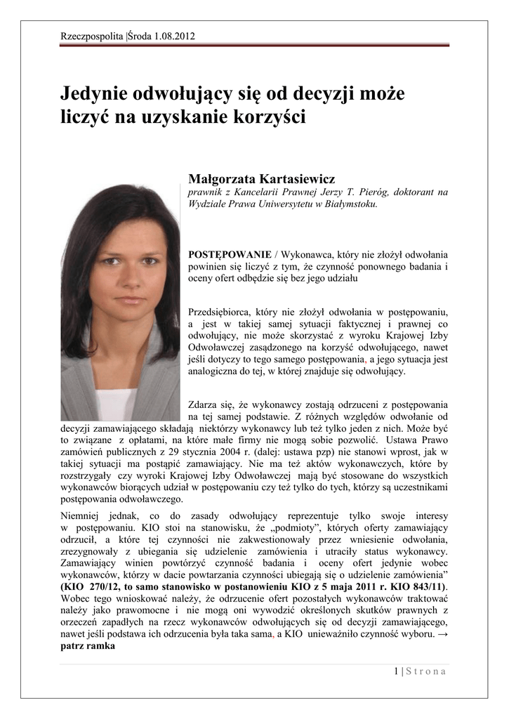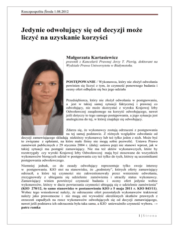 Rzeczpospolita |Środa 1.08.2012 Jedynie odwołujący się od decyzji może liczyć na uzyskanie korzyści Małgorzata Kartasiewicz prawnik z Kancelarii Prawnej Jerzy T. Pieróg, doktorant na Wydziale Prawa Uniwersytetu w Białymstoku. POSTĘPOWANIE / Wykonawca, który nie złożył odwołania powinien się liczyć z tym, że czynność ponownego badania i oceny ofert odbędzie się bez jego udziału Przedsiębiorca, który nie złożył odwołania w postępowaniu, a jest w takiej samej sytuacji faktycznej i prawnej co odwołujący, nie może skorzystać z wyroku Krajowej Izby Odwoławczej zasądzonego na korzyść odwołującego, nawet jeśli dotyczy to tego samego postępowania, a jego sytuacja jest analogiczna do tej, w której znajduje się odwołujący. Zdarza się, że wykonawcy zostają odrzuceni z postępowania na tej samej podstawie. Z różnych względów odwołanie od decyzji zamawiającego składają niektórzy wykonawcy lub też tylko jeden z nich. Może być to związane z opłatami, na które małe firmy nie mogą sobie pozwolić. Ustawa Prawo zamówień publicznych z 29 stycznia 2004 r. (dalej: ustawa pzp) nie stanowi wprost, jak w takiej sytuacji ma postąpić zamawiający. Nie ma też aktów wykonawczych, które by rozstrzygały czy wyroki Krajowej Izby Odwoławczej mają być stosowane do wszystkich wykonawców biorących udział w postępowaniu czy też tylko do tych, którzy są uczestnikami postępowania odwoławczego. Niemniej jednak, co do zasady odwołujący reprezentuje tylko swoje interesy w postępowaniu. KIO stoi na stanowisku, że „podmioty”, których oferty zamawiający odrzucił, a które tej czynności nie zakwestionowały przez wniesienie odwołania, zrezygnowały z ubiegania się udzielenie zamówienia i utraciły status wykonawcy. Zamawiający winien powtórzyć czynność badania i oceny ofert jedynie wobec wykonawców, którzy w dacie powtarzania czynności ubiegają się o udzielenie zamówienia” (KIO 270/12, to samo stanowisko w postanowieniu KIO z 5 maja 2011 r. KIO 843/11). Wobec tego wnioskować należy, że odrzucenie ofert pozostałych wykonawców traktować należy jako prawomocne i nie mogą oni wywodzić określonych skutków prawnych z orzeczeń zapadłych na rzecz wykonawców odwołujących się od decyzji zamawiającego, nawet jeśli podstawa ich odrzucenia była taka sama, a KIO unieważniło czynność wyboru. → patrz ramka 1|Strona Rzeczpospolita |Środa 1.08.2012 Uczciwa konkurencja i równe traktowanie Jak zatem takie podejście odnosi się do zasady równego traktowania wykonawców ubiegających się o zamówienie publiczne oraz zasady prowadzenia postępowania w sposób gwarantujący zachowanie uczciwej konkurencji. Zasada ta obejmuje wszelkie czynności zamawiającego i dotyczy wszystkich faz postępowań o udzielenie zamówienia publicznego. Oznacza to, że każdy z wykonawców powinien być traktowany jednakowo, bez żadnych przywilejów i ulg. Każdy ma zapewniony równy dostęp do informacji, a stawiane wymagania muszą być takie same dla wszystkich podmiotów. Również ocena ofert powinna być dokonywana z uwzględnieniem tych samych kryteriów. Powstają pytania. Jak zatem możliwa jest ocena ofert z uwzględnieniem tych samych kryteriów, w przypadku gdy w wyniku postępowania odwoławczego zamawiający zobowiązany jest do unieważnienia czynności wyboru ofert i dokonania powtórnej oceny z uwzględnieniem oferty odwołującego a z pominięciem pozostałych ofert, które zostały odrzucone na tej samej podstawie co oferta odwołującego. Czy pomimo, że każdy z wykonawców może odwołać się od decyzji zamawiającego i bronić swojej ofert można w tym zakresie mówić o naruszeniu fundamentalnej zasady prawa zamówień publicznych? Oczywiste jest, że omawiana zasada nie jest naruszona, gdy zamawiający zmienia swoją decyzję w wyniku postępowania odwoławczego i uwzględnia jedynie ofertę odwołującego w przypadku gdy sprawa dotyczy kwestii odnoszących się jedynie do oferty odwołującego. Jeżeli jednak KIO orzeka np. co do zarzutu zaniechania wezwania do uzupełnienia dokumentów podmiotowych i przedmiotowych albo też co do wysokości stawki VAT, skutki orzeczenia niewątpliwie mają wpływ na przebieg całego postępowania i zastosowanie wytycznych KIO jedynie do wykonawców odwołujących się od decyzji zamawiającego może być krzywdzące dla innych wykonawców. W jednym z wyroków KIO, w którym odwołujący zarzucił zamawiającemu m.in. naruszenie: art. 26 ust. 3 ustawy pzp poprzez zaniechanie wezwania do uzupełnienia dokumentów podmiotowych i przedmiotowych poprzez wykluczenie odwołującego z postępowania, pomimo, że spełnił warunki udziału w postępowaniu, KIO odnosząc się do twierdzeń odwołującego nakazała zamawiającemu powtórzenie czynności badania i oceny ofert. W uzasadnieniu Izba wskazała, że nakazanie zamawiającemu powtórzenia czynności badania i oceny ofert jest równoznaczne z unieważnieniem pierwotnej decyzji o wyborze oferty najkorzystniejszej. Powtarzając czynność badania i oceny ofert. Zamawiający powinien w taki sam sposób potraktować wszystkich wykonawców, którzy złożyli oferty - zgodnie z zasadą zachowania uczciwej konkurencji i równości wykonawców, wyrażoną w art. 7 ust. 1 prawa zamówień publicznych. (KIO 38/11) Ważna jest analiza orzeczenia KIO W związku z tym, że ani ustawa pzp, ani orzecznictwo nie wskazują jednoznacznie jak zamawiający powinien postąpić w danej sytuacji, każdorazowo należy dokonywać analizy orzeczenia KIO, w którym Krajowa Izba Odwoławcza może wprost wskazać w stosunku do kogo należy wykonać lub powtórzyć czynności zamawiającego lub unieważnić czynność zamawiającego (art. 192 ust. 3 ustawy pzp). Ustawa pzp wskazuje, że kontrola decyzji zamawiającego w trybie środków ochrony prawnej następuje tylko na żądanie zainteresowanego podmiotu wyrażone w odpowiedniej formie (odwołanie), 