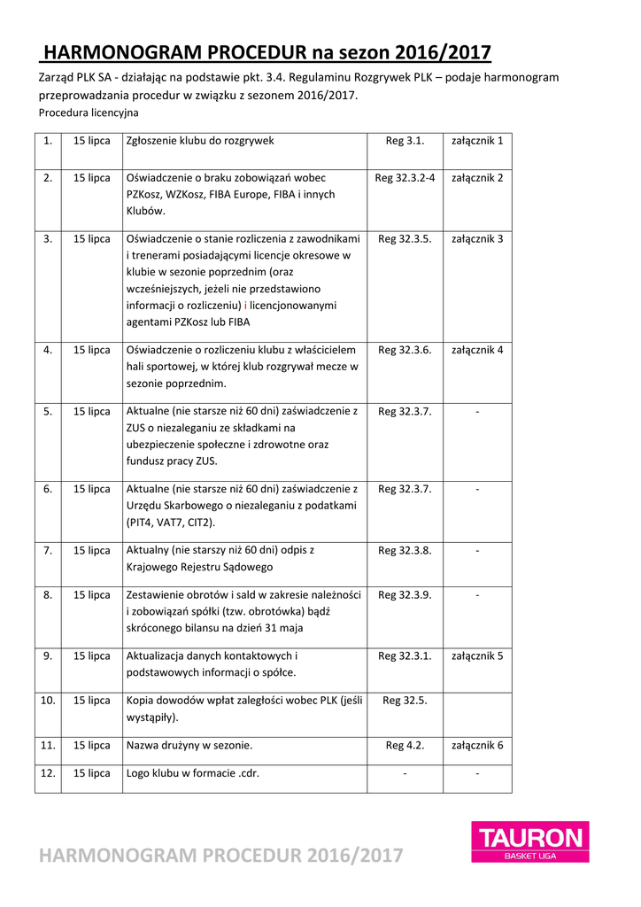 HARMONOGRAM PROCEDUR na sezon 2016/2017 Zarząd PLK SA - działając na podstawie pkt. 3.4. Regulaminu Rozgrywek PLK – podaje harmonogram przeprowadzania procedur w związku z sezonem 2016/2017. Procedura licencyjna 1. 15 lipca Zgłoszenie klubu do rozgrywek Reg 3.1. załącznik 1 2. 15 lipca Oświadczenie o braku zobowiązań wobec PZKosz, WZKosz, FIBA Europe, FIBA i innych Klubów. Reg 32.3.2-4 załącznik 2 3. 15 lipca Oświadczenie o stanie rozliczenia z zawodnikami i trenerami posiadającymi licencje okresowe w klubie w sezonie poprzednim (oraz wcześniejszych, jeżeli nie przedstawiono informacji o rozliczeniu) i licencjonowanymi agentami PZKosz lub FIBA Reg 32.3.5. załącznik 3 4. 15 lipca Oświadczenie o rozliczeniu klubu z właścicielem hali sportowej, w której klub rozgrywał mecze w sezonie poprzednim. Reg 32.3.6. załącznik 4 5. 15 lipca Aktualne (nie starsze niż 60 dni) zaświadczenie z ZUS o niezaleganiu ze składkami na ubezpieczenie społeczne i zdrowotne oraz fundusz pracy ZUS. Reg 32.3.7. - 6. 15 lipca Aktualne (nie starsze niż 60 dni) zaświadczenie z Urzędu Skarbowego o niezaleganiu z podatkami (PIT4, VAT7, CIT2). Reg 32.3.7. - 7. 15 lipca Aktualny (nie starszy niż 60 dni) odpis z Krajowego Rejestru Sądowego Reg 32.3.8. - 8. 15 lipca Zestawienie obrotów i sald w zakresie należności i zobowiązań spółki (tzw. obrotówka) bądź skróconego bilansu na dzień 31 maja Reg 32.3.9. - 9. 15 lipca Aktualizacja danych kontaktowych i podstawowych informacji o spółce. Reg 32.3.1. załącznik 5 10. 15 lipca Kopia dowodów wpłat zaległości wobec PLK (jeśli wystąpiły). Reg 32.5. 11. 15 lipca Nazwa drużyny w sezonie. Reg 4.2. załącznik 6 12. 15 lipca Logo klubu w formacie .cdr. - - HARMONOGRAM PROCEDUR 2016/2017 13. 15 lipca Wskazanie hali lub hal, w której rozgrywane będą mecze. Zgoda właściciela obiektu na rozgrywanie w nim meczów PLK. Wskazanie hali treningowej. Reg 32.3.11. załącznik 7 załącznik 8 14. 15 lipca Wskazanie osób zatrudnionych w klubie na wymaganych stanowiskach wraz z danymi kontaktowymi (generalny menedżer klubu, menedżer ds. marketingu, menedżer ds. mediów i PR, kierownik drużyny, organizator). Umo § 8 załącznik 9 15. 15 lipca Wniosek o licencje okresowe dla spikerów, statystyków i operatorów kamer. Reg 19.5. załącznik 10 16. 15 lipca Oświadczenie spikerów, statystyków i operatorów kamer o zapoznaniu się i przyjęciu obowiązujących regulaminów, uchwał i decyzji wydawanych przez organy PLK Reg 19.5. załącznik 11 17. 15 lipca Dokumenty budżetowe klubu na co najmniej 2 mln zł brutto. Reg 32.3.10. - 18. najpóźniej Informacja PLK o ewentualnych brakach w 18 lipca dokumentacji Reg 32.7. 7 dni po Uzupełnienie dokumentów licencyjnych informacji z pkt. 19 Reg 32.7. 20. najpóźniej Decyzja PLK w sprawie wydania lub odmowy 29 lipca wydania licencji okresowej klubu - 21. najpóźniej Ewentualne złożenie odwołania do Komisji 7 dni od Odwoławczej w sprawie decyzji PLK, o której decyzji z mowa w pkt. 20. pkt. 20 - 19. Weryfikacja hal i terminarz rozgrywek Informacje o terminach zajętych. Godziny rozgrywania meczów. Reg 5.3. najpóźniej 10 lipca Wstępny terminarz rozgrywek Reg. 5.4. najpóźniej 3 uwagi do wstępnego terminarza Reg 5.4. 22. 30 czerwca 23. 24. HARMONOGRAM PROCEDUR 2016/2017 - - sierpnia 25. rozgrywek ostateczny terminarz rozgrywek Reg 5.4. - Weryfikacja hal na miejscu. Dokumenty wymagane do uzyskania certyfikatu. Reg 7.3. ZWH całe - Reg 17.1. i 32.4.1. załącznik 13 najpóźniej 10 sierpnia 26. 10 sierpnia1 września Uzupełnienie procedury licencyjnej 27. 8 września Wniosek o licencje okresowe dla co najmniej 10 zawodników (wraz z wymaganą dokumentacją) 28. 8 września Oświadczenie zawodników nieposiadających statusu zawodnika miejscowego o zapoznaniu się i przyjęciu obowiązujących regulaminów, uchwał i decyzji wydawanych przez organy PLK, wskazanie agenta i kontraktów Reg 17.2.10. załącznik 14 załącznik 21 29. 8 września Oficjalne zdjęcia zawodników, trenerów, asystentów i osób towarzyszących do licencji Reg 17.3. - 30. 8 września Wniosek o licencje okresowe dla trenerów, kierownika drużyny oraz osób towarzyszących (wraz z licencjami PZKosz trenerów). Reg 19.1. i 32.4.2. załącznik 15 31. 8 września Oświadczenie trenerów, kierownika drużyny i osób towarzyszących o zapoznaniu się i przyjęciu obowiązujących regulaminów, uchwał i decyzji wydawanych przez organy PLK, wskazanie agenta i kontraktów przez trenerów Reg 19.3.5. załącznik 16 32. 8 września Oświadczenie o podpisaniu umowy patronackiej z placówką oświatową. Reg 32.3.14. załącznik 18 33. 8 września Wskazanie posiadanych drużyn młodzieżowych lub drużyny rezerw. Reg 32.3.13. załącznik 19 34. 8 września Umowy kontraktowe z zawodnikami i trenerami. Reg 32.4.3. załącznik 22 - Działania marketingowe 35. 8 września Projekty graficzne materiałów lub 14 dni marketingowych do zatwierdzenia: stroje, przed plakaty, bilety, zaproszenia, inne druki, ZM 4.2. HARMONOGRAM PROCEDUR 2016/2017 - oddaniem informacje prasowe, press kit, media guide do druku 36. 29 września Przesłanie listy sponsorów i partnerów klubu. 37. 29 września Oficjalne zdjęcie drużyny. ZM 16.1. - ZM 10.1.4. - Dodatkowa procedura licencyjna 38. 20 stycznia Oświadczenie o braku zobowiązań wobec PZKosz, WZKosz, FIBA Europe, FIBA i innych 2017 Klubów. Reg 33.1.1-3. załącznik 2 39. 20 stycznia Oświadczenie o stanie rozliczenia z zawodnikami, trenerami występującymi w klubie w sezonie 2017 obecnym (oraz wcześniejszych, jeżeli nie przedstawiono informacji o rozliczeniu) i licencjonowanymi agentami PZKosz lub FIBA. Reg 33.1.4. załącznik 3 40. 20 stycznia Kopia dowodów wpłat zaległości wobec PLK (jeśli 2017 wystąpiły). Reg 33.3. 41. najpóźniej Informacja PLK o ewentualnych brakach w 23 stycznia dokumentacji 2017 Reg 33.7. 42. 7 dni po Uzupełnienie dokumentów licencyjnych po ich informa