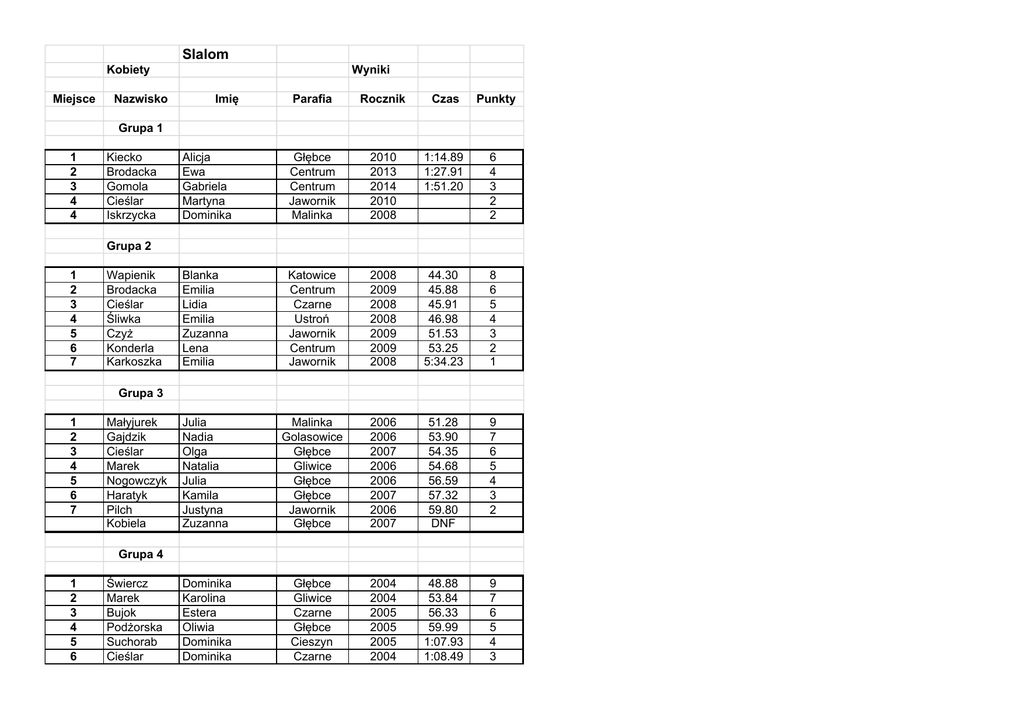 Slalom Kobiety Miejsce Nazwisko Wyniki Imię Parafia Rocznik Czas Punkty Alicja Ewa Gabriela Martyna Dominika Głębce Centrum Centrum Jawornik Malinka 2010 2013 2014 2010 2008 1:14.89 1:27.91 1:51.20 6 4 3 2 2 Blanka Emilia Lidia Emilia Zuzanna Lena Emilia Katowice Centrum Czarne Ustroń Jawornik Centrum Jawornik 2008 2009 2008 2008 2009 2009 2008 44.30 45.88 45.91 46.98 51.53 53.25 5:34.23 8 6 5 4 3 2 1 Julia Nadia Olga Natalia Julia Kamila Justyna Zuzanna Malinka Golasowice Głębce Gliwice Głębce Głębce Jawornik Głębce 2006 2006 2007 2006 2006 2007 2006 2007 51.28 53.90 54.35 54.68 56.59 57.32 59.80 DNF 9 7 6 5 4 3 2 Dominika Karolina Estera Oliwia Dominika Dominika Głębce Gliwice Czarne Głębce Cieszyn Czarne 2004 2004 2005 2005 2005 2004 48.88 53.84 56.33 59.99 1:07.93 1:08.49 9 7 6 5 4 3 Grupa 1 1 2 3 4 4 Kiecko Brodacka Gomola Cieślar Iskrzycka Grupa 2 1 2 3 4 5 6 7 Wapienik Brodacka Cieślar Śliwka Czyż Konderla Karkoszka Grupa 3 1 2 3 4 5 6 7 Małyjurek Gajdzik Cieślar Marek Nogowczyk Haratyk Pilch Kobiela Grupa 4 1 2 3 4 5 6 Świercz Marek Bujok Podżorska Suchorab Cieślar 7 Potyka Mosler Dominika Anna Jawornik Czarne 1:26.84 DSQ 2 2004 Aleksandra Nikola Aleksandra Karolina Anna Anna Malinka Głębce Centrum Centrum Centrum Głębce 2002 2003 2003 2002 2003 2003 51.33 56.41 58.88 1:01.36 01:12.7 DSQ 7 5 4 3 2 Katarzyna Roxana Małgorzata Marlena Sara Noemi Kaja Malinka Golasowice Ustroń Ustroń Czarne Centrum Centrum 2000 2001 2001 2000 2001 2001 2001 41.40 46.81 47.28 54.44 56.13 1:04.5 1:10.76 12 Wiktoria Edyta Justyna Agnieszka Anna Nina Izabela Jawornik Bładnice Jawornik Centrum Głębce Centrum Jawornik 1997 1995 1993 1998 1999 8 6 5 4 3 2 1999 39.13 41.33 43.67 46.93 50.97 1:00.18 DNF Alicja Magdalena Anna Urszula Katarzyna Janina Lidia Barbara Czarne Centrum Malinka Centrum Głębce Ustroń Golasowice Centrum 1965 1975 1981 1977 1980 0 1074 1988 41.05 43.08 45.26 47.45 50.35 52.14 53.60 54.32 9 7 6 5 Grupa 5 1 2 3 4 5 Cieślar Nogowczyk Procner Greń Szajthauer Wisełka Grupa 6 1 2 3 4 5 6 7 Cieślar Gajdzik Szewieczek Janik Bujok Wisełka Szajthauer 10 9 6 5 1 Grupa 7 1 2 3 4 5 6 Kukuczka Kral Pilch Szalbot Babicka Szajthauer Konderla Grupa 8 1 2 3 4 5 6 7 8 Pilch Cieślar Cieślar Konderla Swęda Hussar Gajdzik Szalbót 4 3 2 1