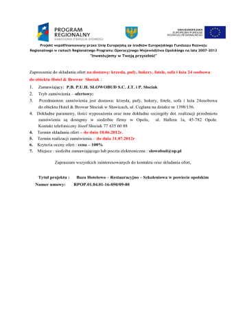 Projekt współfinansowany przez Unię Europejską ze środków Europejskiego Funduszu Rozwoju Regionalnego w ramach Regionalnego Programu Operacyjnego Województwa Opolskiego na lata 2007-2013 "Inwestujemy w Twoją przyszłość" Zaproszenie do składania ofert na dostawę: krzesła, pufy, hokery, fotele, sofa i loża 24 osobowa do obiektu Hotel & Browar Słociak : 1. 2. 3. Zamawiający: P.B. P.U.H. SŁOWOBUD S.C. J.T. i P. Słociak Tryb zamówienia – ofertowy: Przedmiotem zamówienia jest dostawa: krzesła, pufy, hokery, fotele, sofa i loża 24osobowa do obiektu Hotel & Browar Słociak w Sławicach, ul. Ceglana na działce nr 1398/156. 4. Dokładne parametry, ilości wyposażenia oraz inne dokładne szczegóły dot. realizacji przedmiotu 4. 5. 6. 7. zamówienia są dostępny w siedzibie firmy w Opolu, ul. Hallera 1a, 45-782 Opole. Kontakt telefoniczny Józef Słociak 77 435 60 88 Termin składania ofert – do dnia 18.06.2012r. Termin realizacji zamówienia – do dnia 31.07.2012r Kryteria oceny ofert : cena – 100% Miejsce : siedziba zamawiającego lub poczta elektroniczna : [email protected] Zapraszam wszystkich zainteresowanych do kontaktu oraz składania ofert, Tytuł projektu : Numer umowy: Baza Hotelowo – Restauracyjno – Szkoleniowa w powiecie opolskim RPOP.01.04.01-16-050/09-00