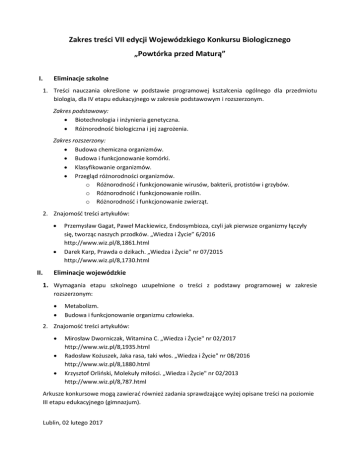 Zakres treści VII edycji Wojewódzkiego Konkursu Biologicznego „Powtórka przed Maturą” I. Eliminacje szkolne 1. Treści nauczania określone w podstawie programowej kształcenia ogólnego dla przedmiotu biologia, dla IV etapu edukacyjnego w zakresie podstawowym i rozszerzonym. Zakres podstawowy: Biotechnologia i inżynieria genetyczna. Różnorodność biologiczna i jej zagrożenia. Zakres rozszerzony: Budowa chemiczna organizmów. Budowa i funkcjonowanie komórki. Klasyfikowanie organizmów. Przegląd różnorodności organizmów. o Różnorodność i funkcjonowanie wirusów, bakterii, protistów i grzybów. o Różnorodność i funkcjonowanie roślin. o Różnorodność i funkcjonowanie zwierząt. 2. Znajomość treści artykułów: II. Przemysław Gagat, Paweł Mackiewicz, Endosymbioza, czyli jak pierwsze organizmy łączyły się, tworząc naszych przodków. „Wiedza i Życie” 6/2016 http://www.wiz.pl/8,1861.html Darek Karp, Prawda o dzikach. „Wiedza i Życie" nr 07/2015 http://www.wiz.pl/8,1730.html Eliminacje wojewódzkie 1. Wymagania etapu szkolnego uzupełnione o treści z podstawy programowej w zakresie rozszerzonym: Metabolizm. Budowa i funkcjonowanie organizmu człowieka. 2. Znajomość treści artykułów: Mirosław Dworniczak, Witamina C. „Wiedza i Życie" nr 02/2017 http://www.wiz.pl/8,1935.html Radosław Kożuszek, Jaka rasa, taki włos. „Wiedza i Życie" nr 08/2016 http://www.wiz.pl/8,1880.html Krzysztof Orliński, Molekuły miłości. „Wiedza i Życie" nr 02/2013 http://www.wiz.pl/8,787.html Arkusze konkursowe mogą zawierać również zadania sprawdzające wyżej opisane treści na poziomie III etapu edukacyjnego (gimnazjum). Lublin, 02 lutego 2017