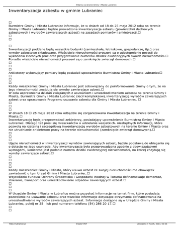 Witamy na stronie Gminy i Miasta Lubraniec Inwentaryzacja azbestu w gminie Lubraniec Burmistrz Gminy i Miasta Lubraniec informuje, że w dniach od 18 do 25 maja 2012 roku na terenie Gminy i Miasta Lubraniec będzie prowadzona inwentaryzacja azbestu (powierzchni dachowych azbestowych i wyrobów zawierających azbest) na zasadach pomiarów i ankietyzacji. Inwentaryzacji poddane będą wszystkie budynki (zamieszkałe, letniskowe, gospodarcze, itp.) oraz wyroby azbestowe składowane. Właściciele nieruchomości proszeni są o udostępnienie posesji do wykonania zleconych prac oraz przygotowanie numerów działek ewidencyjnych swoich nieruchomości. Ponadto właściciele nieruchomości proszeni są o zamknięcie zwierząt domowych. Ankieterzy wykonujący pomiary będą posiadali upoważnienie Burmistrza Gminy i Miasta Lubraniec Każdy mieszkaniec Gminy i Miasta Lubraniec jest zobowiązany do poinformowania Gminy o tym, że na jego nieruchomości znajdują się wyroby zawierające azbest. W celu usprawnienia działań związanych z usuwaniem i unieszkodliwianiem azbestu na terenie Gminy i Miasta, Burmistrz Gminy i Miasta Lubraniec zlecił kompleksową inwentaryzację wyrobów zawierających azbest oraz opracowanie Programu usuwania azbestu dla Gminy i Miasta Lubraniec. W dniach 18 25 maja 2012 roku odbędzie się zorganizowana inwentaryzacja na terenie Gminy i Miasta. Inwentaryzację będą przeprowadzać ankieterzy, posiadający upoważnienie Burmistrza Gminy i Miasta Lubraniec. Dlatego też prosi się mieszkańców o udzielanie wszystkich. niezbędnych informacji, które pozwolą na rzetelną i szczegółową inwentaryzację wyrobów azbestowych na terenie Gminy i Miasta oraz nie utrudnianie ankieterom pracy na terenie nieruchomości (zamknięcie zwierząt domowych). Ujęcie nieruchomości w inwentaryzacji wyrobów zawierających azbest, będzie podstawą do ubiegania się o dotację na jego usunięcie. Aby inwentaryzacja była przeprowadzona zgodnie z obowiązującymi wymogami, konieczne jest podanie numeru działki ewidencyjnej nieruchomości, na której znajdują się wyroby zawierające azbest. Każdy mieszkaniec Gminy i Miasta, który usuwa azbest ze swojej nieruchomości ma obowiązek zawiadomić o tym Urząd Gminy i Miasta Lubraniec. Wojewódzki Fundusz Ochrony Środowiska i Gospodarki Wodnej w Toruniu dofinansowuje demontaż, zbieranie, transport oraz unieszkodliwianie odpadów zawierających azbest. W Urzędzie Gminy i Miasta w Lubrańcu można pozyskać informacje na temat firm, które posiadają pozwolenie na usuwanie azbestu oraz wszelkie informacje dotyczące otrzymania dofinansowania na unieszkodliwianie wyrobów zawierających azbest. Informacje dostępne są w Urzędzie Gminy i Miasta Lubraniec, pokój nr 25 lub pod numerem telefonu (54) 286 20 17. http://lubraniec.pl Kreator PDF Utworzono 4 March, 2017, 02:26