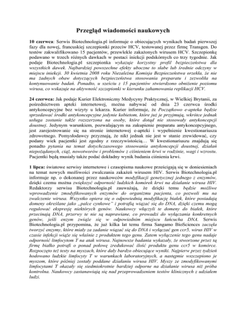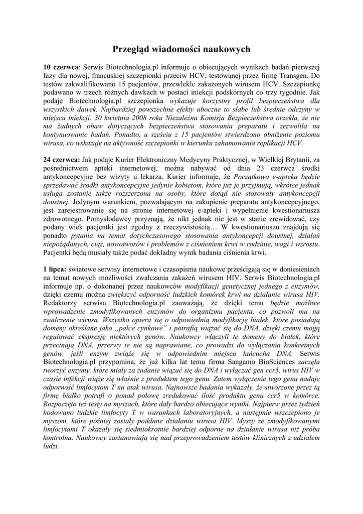 Przegląd wiadomości naukowych 10 czerwca: Serwis Biotechnologia.pl informuje o obiecujących wynikach badań pierwszej fazy dla nowej, francuskiej szczepionki przeciw HCV, testowanej przez firmę Transgen. Do testów zakwalifikowano 15 pacjentów, przewlekle zakażonych wirusem HCV. Szczepionkę podawano w trzech różnych dawkach w postaci iniekcji podskόrnych co trzy tygodnie. Jak podaje Biotechnologia.pl szczepionka wykazuje korzystny profil bezpieczeństwa dla wszystkich dawek. Najbardziej powszechne efekty uboczne to słabe lub średnie odczyny w miejscu iniekcji. 30 kwietnia 2008 roku Niezależna Komisja Bezpieczeństwa orzekła, że nie ma żadnych obaw dotyczących bezpieczeństwa stosowania preparatu i zezwoliła na kontynuowanie badań. Ponadto, u sześciu z 15 pacjentόw stwierdzono obniżenie poziomu wirusa, co wskazuje na aktywność szczepionki w kierunku zahamowania replikacji HCV. 24 czerwca: Jak podaje Kurier Elektroniczny Medycyny Praktycznej, w Wielkiej Brytanii, za pośrednictwem apteki internetowej, można nabywać od dnia 23 czerwca środki antykoncepcyjne bez wizyty u lekarza. Kurier informuje, że Początkowo e-apteka będzie sprzedawać środki antykoncepcyjne jedynie kobietom, które już je przyjmują, wkrótce jednak usługa zostanie także rozszerzona na osoby, które dotąd nie stosowały antykoncepcji doustnej. Jedynym warunkiem, pozwalającym na zakupienie preparatu antykoncepcyjnego, jest zarejestrowanie się na stronie internetowej e-apteki i wypełnienie kwestionariusza zdrowotnego. Pomysłodawcy przyznają, że nikt jednak nie jest w stanie zrewidować, czy podany wiek pacjentki jest zgodny z rzeczywistością… W kwestionariuszu znajdują się ponadto pytania na temat dotychczasowego stosowania antykoncepcji doustnej, działań niepożądanych, ciąż, nowotworów i problemów z ciśnieniem krwi w rodzinie, wagi i wzrostu. Pacjentki będą musiały także podać dokładny wynik badania ciśnienia krwi. 1 lipca: światowe serwisy internetowe i czasopisma naukowe prześcigają się w doniesieniach na temat nowych możliwości zwalczania zakażeń wirusem HIV. Serwis Biotechnologia.pl informuje np. o dokonanej przez naukowców modyfikacji genetycznej jednego z enzymów, dzięki czemu można zwiększyć odporność ludzkich komórek krwi na działanie wirusa HIV. Redaktorzy serwisu Biotechnologia.pl zauważają, że dzięki temu będzie możliwe wprowadzenie zmodyfikowanych enzymów do organizmu pacjenta, co pozwoli mu na zwalczenie wirusa. Wszystko opiera się o odpowiednią modyfikację białek, które posiadają domeny określane jako „palce cynkowe” i potrafią wiązać się do DNA, dzięki czemu mogą regulować ekspresję niektórych genów. Naukowcy włączyli te domeny do białek, które przecinają DNA, przerwy te nie są naprawiane, co prowadzi do wyłączania konkretnych genów, jeśli enzym zwiąże się w odpowiednim miejscu łańcucha DNA. Serwis Biotechnologia.pl przypomina, że już kilka lat temu firma Sangamo BioSciences zaczęła tworzyć enzymy, które miały za zadanie wiązać się do DNA i wyłączać gen ccr5, wirus HIV w czasie infekcji wiąże się właśnie z produktem tego genu. Zatem wyłączenie tego genu nadaje odporność limfocytom T na atak wirusa. Najnowsze badania wykazały, że stworzone przez tą firmę białko potrafi o ponad połowę zredukować ilość produktu genu ccr5 w komórce. Rozpoczęto też testy na myszach, które dały bardzo obiecujące wyniki. Najpierw przez tydzień hodowano ludzkie limfocyty T w warunkach laboratoryjnych, a następnie wszczepiono je myszom, które później zostały poddane działaniu wirusa HIV. Myszy ze zmodyfikowanymi limfocytami T okazały się siedmiokrotnie bardziej odporne na działanie wirusa niż próba kontrolna. Naukowcy zastanawiają się nad przeprowadzeniem testów klinicznych z udziałem ludzi. 4 lipca: Serwis „Nauka w Polsce” Polskiej Agencji Prasowej donosi o nadzwyczajnych, nieznanych do tej pory właściwościach arbuza, które opisał dr Bhimu Patil, kierownik Texas A&M Fruit nad Vegetable Improvement Center. Jak informuje PAP w owocach arbuza wykryto m.in. duże ilości czerwonego barwnika – likopenu oraz beta-karoten i cytrulinę. Największe zainteresowanie wzbudza ten ostatni związek chemiczny, gdyż przekształcany jest przez enzymy w argininę, aminokwas korzystnie wpływający na serce i układ krążenia, a także odporność. Według doktora Patila, prowadzącego te badania, arbuzy mogą dobrze wpływać na osoby cierpiące z powodu otyłości i cukrzycy typu II, (…) leczyć dusznicę bolesną i nadciśnienie tętnicze. Z kolei działanie argininy na cykl mocznikowy sprzyja usuwaniu z organizmu amoniaku i innych toksycznych związków. Największe ilości cytruliny znajdują się jednak w niejadalnej skórce owoców arbuza i dlatego też amerykańscy naukowcy chcą wyhodować odmianę o wysokiej zawartości tego związku w miąższu. Tego samego dnia Polska Agencja Prasowa, za pośrednictwem swego serwisu naukowego, donosiła o wynikach interesujących obserwacji naukowców amerykańskich, ogłoszonych na łamach czasopisma „Annals of the Rheumatic Diseases”. Otóż okazuje się, że Dziewczynki, które rodzą się cięższe niż 4 kilogramy, są dwa razy bardziej narażone na zachorowanie na reumatoidalne zapalenie stawów w dorosłym życiu, niż ich lżejsze rówieśniczki. Redaktorzy serwisu „Nauka w Polsce” podkreślają, że Odkrycie to potwierdza tzw. płodową teorię choroby, według której niektóre choroby w dorosłym życiu są determinowane przez czynniki działające na człowieka w życiu płodowym. Jako przykład można wymienić cukrzycę, chorobę wieńcową serca i nadciśnienie tętnicze – choroby wiązane z niską masą urodzeniową, natomiast zwiększone ryzyko zachorowania na raka piersi czy białaczkę łączy się z wysoką wagą przy urodzeniu dziecka. Serwis „Nauka w Polsce” szczegółowo opisał 
