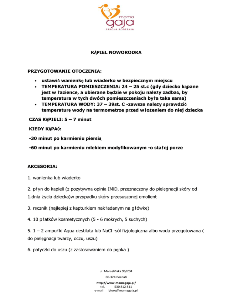 KĄ PIEL NOWORODKA PRZYGOTOWANIE OTOCZENIA: • • • ustawić wanienkę lub wiaderko w bezpiecznym miejscu TEMPERATURA POMIESZCZENIA: 24 – 25 st.c (gdy dziecko ką pane jest w ł azience, a ubierane bę dzie w pokoju należ y zadbać , by temperatura w tych dwóch pomieszczeniach był a taka sama) TEMPERATURA WODY: 37 – 39st. C zawsze należ y sprawdzić temperaturę wody na termometrze przed wł oż eniem do niej dziecka CZAS KĄ PIELI: 5 – 7 minut KIEDY KĄ PAĆ : 30 minut po karmieniu piersią 60 minut po karmieniu mlekiem modyfikowanym o stał ej porze AKCESORIA: 1. wanienka lub wiaderko 2. płyn do ką pieli (z pozytywną opinią IMiD, przeznaczony do pielę gnacji skóry od 1.dnia ż ycia dziecka)w przypadku skóry przesuszonej emolient 3. rę cznik (najlepiej z kapturkiem nakł adanym na gł ówkę ) 4. 10 pł atków kosmetycznych (5 6 mokrych, 5 suchych) 5. 1 – 2 ampuł ki Aqua destilata lub NaCl sól fizjologiczna albo woda przegotowana ( do pielęgnacji twarzy, oczu, uszu) 6. patyczki do uszu (z zastosowaniem do pę pka ) ul. Marceliń ska 96/204 60‐324 Poznań http://www.mamagaja.pl/ tel. 530 812 811 e‐mail [email protected] 7. Octenisept (do pielę gnacji kikuta pę powinowego) lub 70% spirytus (2 ł yż ki wody + 1 łyż ka spirytusu 96%; do każ dego przemywania okolicy kikuta pę powinowego należy ponownie przygotować roztwór; roztwór jest bowiem jednokrotnego uż ytku) 8. maś ć do pielę gnacji okolicy okoł opieluszkowej (jeż eli są zaczerwienienia i podrażnienia bephanten maś ć ) WAŻ NE: Przy zaczerwienionej, podraż nionej skórze okolicy okoł opieluszkowej warto pozwolić dziecku trochę pofikać bez pieluszki (dostęp powietrza jest niezmiernie waż ny), umieszczają c je na podkł adzie jednorazowym z podszewką z ceraty i osł aniają c kocykiem lub pieluszką flanelową ; przy odparzeniach warto również na jakiś czas zrezygnować z chusteczek nawilż anych, by dodatkowo nie podraż niać skóry dziecka i zastosować podmywanie za pomocą wacików namoczonych w wodzie (skórę nastę pnie osusza się za pomocą ręcznika papierowego lub suchego wacika) 9. szczotka do wł osów 10. pampers 11. kaftanik zapinany z przodu + śpiochy na ramią czkach, ewentualnie dodatkowo lub skarpetki, czapeczka cienka, baweł niana, najlepiej wią zana 12. rożek, z przygotowaną wcześ niej pieluszką tetrową pod gł ówkę dziecka Waż ne: w począ tkowych dniach ż ycia maluszka, nie obcina mu się paznokci (paznokieć moż e być poł ą czony z opuszką palca, dlatego należ y poczekać aż pł ytka paznokciowa się od niego oddzieli) ul. Marceliń ska 96/204 60‐324 Poznań http://www.mamagaja.pl/ tel. 530 812 811 e‐mail [email protected] WYKONANIE: 1. przygotować i sprawdzić temperaturę wody (począ tkowo pł yn do ką pieli warto dolewać do wody, nie stosować go bezpoś rednio na skórę , aby obserwować reakcje skóry dziecka na zastosowany preparat) 2. rozebrać noworodka 3. zł apać noworodka: kciuk jednej dł oni umieś cić pod pachą dziecka, pozostał e cztery palce podsuną ć pod gł ówkę dziecka tak, by swobodnie mogł a na naszej dł oni spoczywać , drugą dł onią chwycić dziecko w pachwinie, stabilizują c staw biodrowy (dłoń skierować od dołu, kciuk umieś cić na pachwinie, pozostał ymi czterema palcami obją ć udo wraz ze stawem biodrowym) 4. ułożyć noworodka w dogodnej dla niego i dla rodzica pozycji (brzuszkiem lub plecami dziecka opartymi na przedramieniu opiekuna) 5. delikatnie wł oż yć noworodka do wanienki 6. umyć noworodka (gł ówka, plecy, brzuszek, rą czki, nóż ki, pupę oraz okolicę intymną : waż ne! u dziewczynek w kierunku od przodu do tył u) 7. przenieś ć noworodka na rę cznik (w pojedynkę ) lub otulić go rę cznikiem na swoich rękach (gdy mamy pomoc drugiej osoby) 8. delikatnie osuszyć ciał o maluszka 9. jeś li istnieje koniecznoś ć (w trakcie ką pieli niedokł adnie umył o się dziecku okolicę intymną ) – przetrzeć tę okolicę za pomocą nawilż onej chusteczki lub gazika ul. Marceliń ska 96/204 60‐324 Poznań http://www.mamagaja.pl/ tel. 530 812 811 e‐mail [email protected] 10. ubrać czapeczkę , kaftanik oraz pampersa 11. umyć rę ce w misce z wodą , zdezynfekować je, spryskują c Octeniseptem i wcierają c preparat w dł onie 12. prysną ć Octeniseptem kikut pępowinowy, chwycić jedną dł onią kikut pę powinowy, a drugą rę ką za pomocą patyczka oczyszczać tę okolicę ruchem okrężnym (po jednym okrą ż eniu wymienić patyczek na nowy), (w przypadku spirytusu zalecał abym jednak zamoczenie koń cówek patyczków do uszu, bezpośrednie uż ycie spirytusu na skórę noworodka moż e zakoń czyć się jej poparzeniem) 13. dokoń czyć ubieranie noworodka 14. zawiną ć noworodka w roż ek i przejś ć do higieny twarzy 15. ruchem okrę ż nym przemyć cał ą twarz noworodka za pomocą nawilż onego gazika: czoł o, ł uki brwiowe, policzek, bródkę , drugi policzek, grzbiet nosa, okolicę pod nosem 16. odwrócić gł ówkę noworodka (za pomocą dwóch dł oni, obejmują cych twarz dziecka po przeciwnych stronach) na stronę prawą i mokrym gazikiem przemyć oko prawe w kierunku nosa, nastę pnie oko lewe. 17. umyć prawą mał ż owinę uszną nawilż onym wacikiem, a nastę pnie osuszyć ją za pomocą suchego gazika 18. powtórzyć czynnoś ć z pkt. 17 z lewą mał ż owiną uszną 19. można zdją ć czapeczkę i uczesać dziecku gł ówkę (w razie koniecznoś ci czapeczkę ponownie nał oż yć na gł ówkę dziecka autor tekstu Kinga Kań duł a poł oż na ul. Marceliń ska 96/204 60‐324 Poznań http://www.mamagaja.pl/ tel. 530 812 811 e‐mail [email protected]