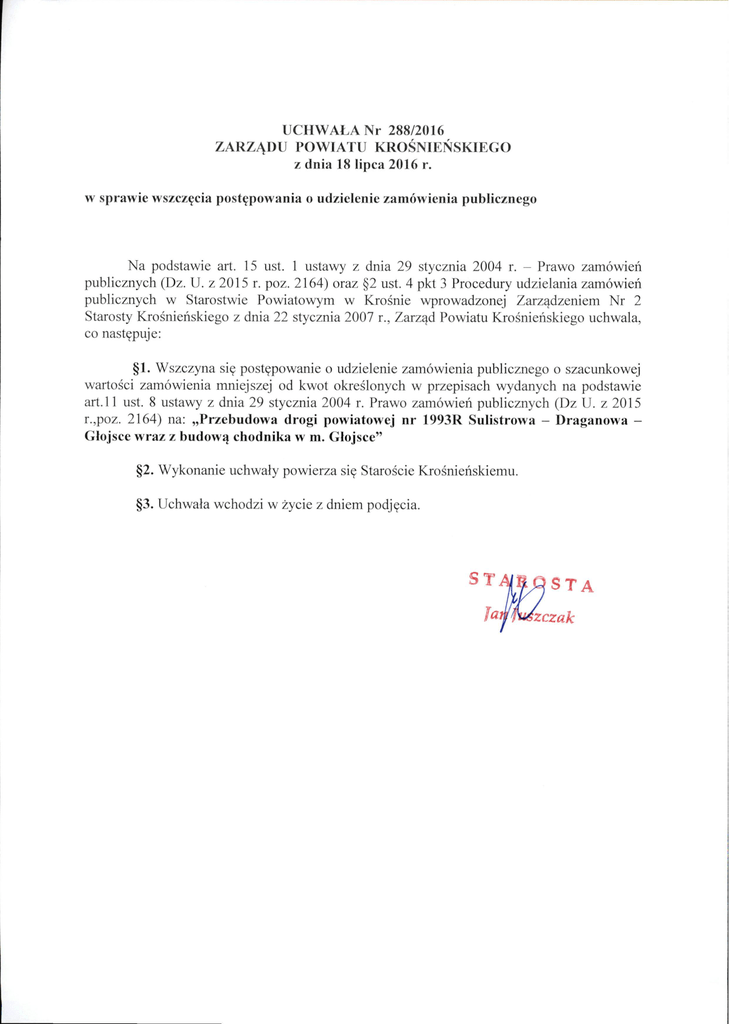 UCHWAŁA Nr 288/2016 ZARZĄDU POWIATU KROŚNIEŃSKIEGO z dnia 18 lipca 2016 r. w sprawie wszczęcia postępowan i a o udzielenie zamówienia publicznego Na podstawie art. 15 ust. 1 ustawy z dnia 29 stycznia 2004 r. - Prawo zamówień publicznych (Dz. U. z 2015 r. poz. 2164) oraz §2 ust. 4 pkt 3 Procedury udzielania zamówień publicznych w Starostwie Powiatowym w Krośnie wprowadzonej Zarządzeniem Nr 2 tarosty Krośnieńskiego z dnia 22 stycznia 2007 r„ Zarząd Powiatu Krośnieńskiego uchwala, co następuje: §1. Wszczyna się postępowanie o udzielenie zamówienia publicznego o szacunkowej zamówienia mniejszej od kwot określonych w przepisach wydanych na podstawie art.11 ust. 8 ustawy z dnia 29 stycznia 2004 r. Prawo zamówień publicznych (Dz U. z 2015 r„poz. 2164) na: „P rzebudowa drogi powiatowej nr 1993R Sulistrowa - Draganowa Glojsce wraz z b ud ową chodnika w m. G łoj sce" wartości §2 . Wykonanie §3. Uchwała uchwały wchodzi w powierza się życie Staroście Krośnieńskiemu. z dniem podjęcia. STA