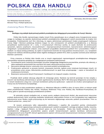 POLSKA IZBA HANDLU Zachowanie różnorodności handlu i usług na rynku wewnętrznym POLISH CHAMBER OF COMMERCE – ‘Maintaining diversity of commerce on internal market’ Polska Izba Handl u, ul. Grażyny 13/10, 02-548 W arszawa, T/F: +48 22 440 83 23 NIP:525-20-04-193 REGON:012864197 KRS: 0000099228 EKD:9112 [email protected] www.pih.org .pl Warszawa, dnia 26 marca 2014 Pan Władysław Kosiniak-Kamysz Minister Pracy i Polityki Społecznej Szanow ny Panie M inistrze, Dotyczy: Nasilające się praktyki dyskryminacji polskich przedsiębiorstw delegujących pracowników do Francji i Niemiec Polska Izba Handlu reprezentująca między innymi firmy specjalizujące się w usługach pracy transgranicznej zwraca uwagę na nasilające się zjawisko dyskryminacji polskich przedsiębiorstw delegujących swoich pracowników do krajów Unii Europejskiej. Przedstawiciele tych firm informują, że organy administracji państwowych krajów przyjmujących (zwłaszcza Francji, Belgii i Niemiec) podejmują działania mające na celu umniejszenie roli polskich przedsiębiorstw, a w dłuższej perspektywie wyeliminowanie ich z rynku. Z otrzymywanych informacji wynika, że często dochodzi do przekroczenia uprawnień, nękania uciążliwymi, nieuzasadnionymi i nieproporcjonalnymi kontrolami, tworzenia barier administracyjnych niezgodnych z prawodawstwem unijnym, coraz częstszych przypadków szkalowania polskich firm i pracowników z Polski w mediach. Co więcej istnieją podstawy, by sądzić iż wspomniane kontrole nie mają podstaw merytorycznych, a są narzędziem służącym do realizacji określonej polityki wobec legalnie działających polskich firm, które są wysoko oceniane przez lokalnych klientów i partnerów. Firmy zrzeszone w Polskiej Izbie Handlu oraz w innych organizacjach reprezentujących przedsiębiorstwa delegujące pracowników najczęściej spotykają się z następującymi przejawami dyskryminacji: 1. Formułowanie przez instytucje kontrolujące zarzutów nielegalnego delegowania pracowników, przemytu siły roboczej, a także wydawanie postanowień bez wszczęcia lub nawet zakończenia procesu kontroli; 2. Naruszanie dobrego imienia i wizerunku oraz oczernianie polskich przedsiębiorstw; 3. Przekraczanie uprawnień w procesie kontroli; zmasowane kontrole, żądanie przez instytucje kontrolujące innych, niż przewidziane przez prawo, dokumentów przetłumaczonych na język kraju przyjmującego – często w nierealnych do zrealizowania terminach; 4. Bezprawne wymuszanie danych finansowych i handlowych nie mających związku z kontrolą. Przykłady takich praktyk obrazują załączniki do niniejszego pisma. Nasilenie się kontroli pozostaje nie bez związku z pracami nad dyrektywą wdrożeniową w sprawie egzekwowania dyrektywy 96/71 WE dotyczącej delegowania pracowników w ramach świadczenia usług oraz z szerszym kontekstem polityczno-społecznym : wyborami do struktur samorządowych we Francji oraz do Parlamentu Europejskiego. Sytuacja ta była przedmiotem spotkania z p. Ministrem Mleczko w MPiPS w dniu 13 marca 2014 z w którym wzięli udział przedstawiciele Polskiej Izby Handlu, Inicjatywy Mobilności Pracy oraz Polskiej Izby Handlowo-Przemysłowej we Francji, gdzie w sposób wyczerpujący przedstawiono problem. W zaistniałej sytuacji niezbędne jest, w naszej ocenie, podjęcie skutecznych działań, aby powstrzymać nieuczciwe praktyki dyskryminacji, które utrudniają swobodne świadczenie usług polskim firmom w Unii Europejskiej oraz nagłaśniane jednostronnie przez lokalne media przyczyniają się do tworzenia negatywnego wizerunku polskich pracowników i firm na rynkach państw tzw. „starej Unii”. W naszym przekonaniu tylko odpowiednio zdefiniowane i wspólne dla wszystkich państw członkowskich mechanizmy kontroli zagwarantują zachowanie podstawowych swobód europejskich: wolnego przepływu handlu, towarów, kapitału i usług – będących filarami, na których opiera się Unia Europejska. Polska Izba Handlu działając w imieniu przedsiębiorstw delegujących pracowników popiera projekt kompromisowych zapisów dyrektywy wdrożeniowej, wynegocjowanych przez Rząd RP, których egzekwowanie zapewni ochronę przed nieuprawnionym nierównym traktowaniem podmiotów na unijnym rynku. POLSKA IZBA HANDLU Zachowanie różnorodności handlu i usług na rynku wewnętrznym POLISH CHAMBER OF COMMERCE – ‘Maintaining diversity of commerce on internal market’ Polska Izba Handl u, ul. Grażyny 13/10, 02-548 W arszawa, T/F: +48 22 440 83 23 NIP:525-20-04-193 REGON:012864197 KRS: 0000099228 EKD:9112 [email protected] www.pih.org .pl Wspólnie z pozostałymi organizacjami zrzeszającymi firmy eksportujące Polska Izba Handlu opracowała następujące propozycje rozwiązań związanych z implementacją dyrektywy wdrożeniowej: 1. Wzmocnienie skuteczności działania i poszerzenie uprawnień instytucji łącznikowej, będącej partnerem instytucji kontrolujących z państw przyjmujących pracowników, która w pierwszej kolejności byłaby odpowiedzialna za udostępnienie zagranicznym organom informacji i niezbędnych dokumentów wymaganych w procesie kontroli dotyczącej kontrolowanego przedsiębiorstwa z Polski. Takie rozwiązanie uregulowałoby procedury kontrolne według zasad dyrektywy i zapobiegłoby nadużyciom. 2. Powołanie Rady Konsultacyjno-Doradczej ds. pracowników delegowanych przy Ministrze Pracy i Polityki Społecznej, pełniącej funkcję organu pomocniczego. W jej skład weszliby zaproszeni przez Ministra przedstawiciele organizacji pozarządowych zajmujących się koordynacją systemów zabezpieczenia społecznego, delegowaniem pracowników w ramach świadczenia usług oraz ochroną praw pracowników delegowanych. Do zadań Rady należałoby przede wszystkim: • opiniowanie i wydawanie rekomendacji w sprawach związanych z delegowaniem pracowników; • proponowanie nowych rozwiązań systemowych z zakresu delegowania służących ochronie praw pracown